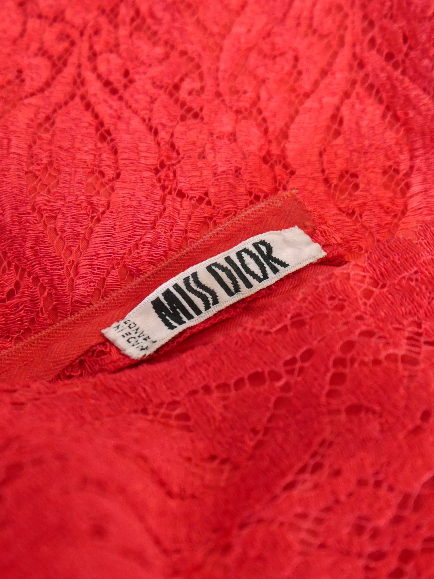 This striking vintage Miss Dior evening gown from the late 1960s or early 1970s, designed by Philippe Guibourgé, is crafted from delicate lace in a most beautiful, slightly darker shade of a deep true red (beautifully captured in the pictures), fully lined in red silk except for the sleeves. The dress features a fitted bodice with long fitted sleeves and a flared floor-length skirt that finishes with an opulent ruffle. Closes with a hand-set back zipper and has internal bra strap keepers. No material tag, lace probably 100% synthetics. Made in France. An easy-to-wear stand-out piece that oozes classic elegance and old world glamour.