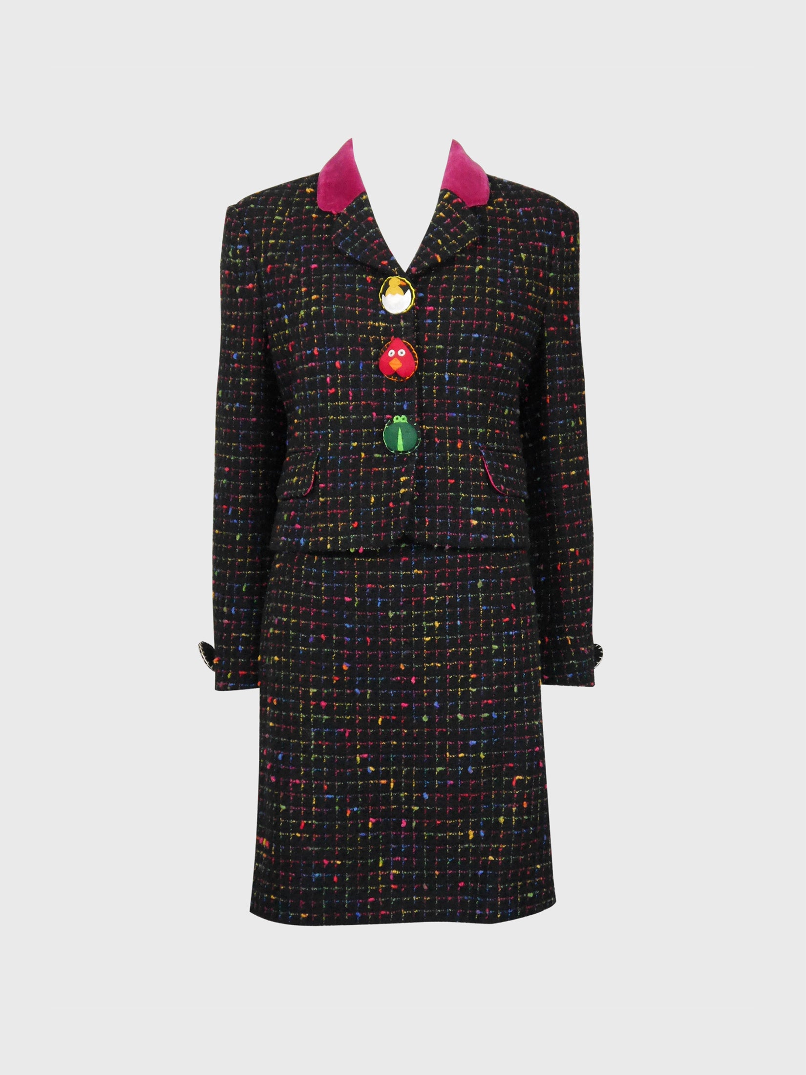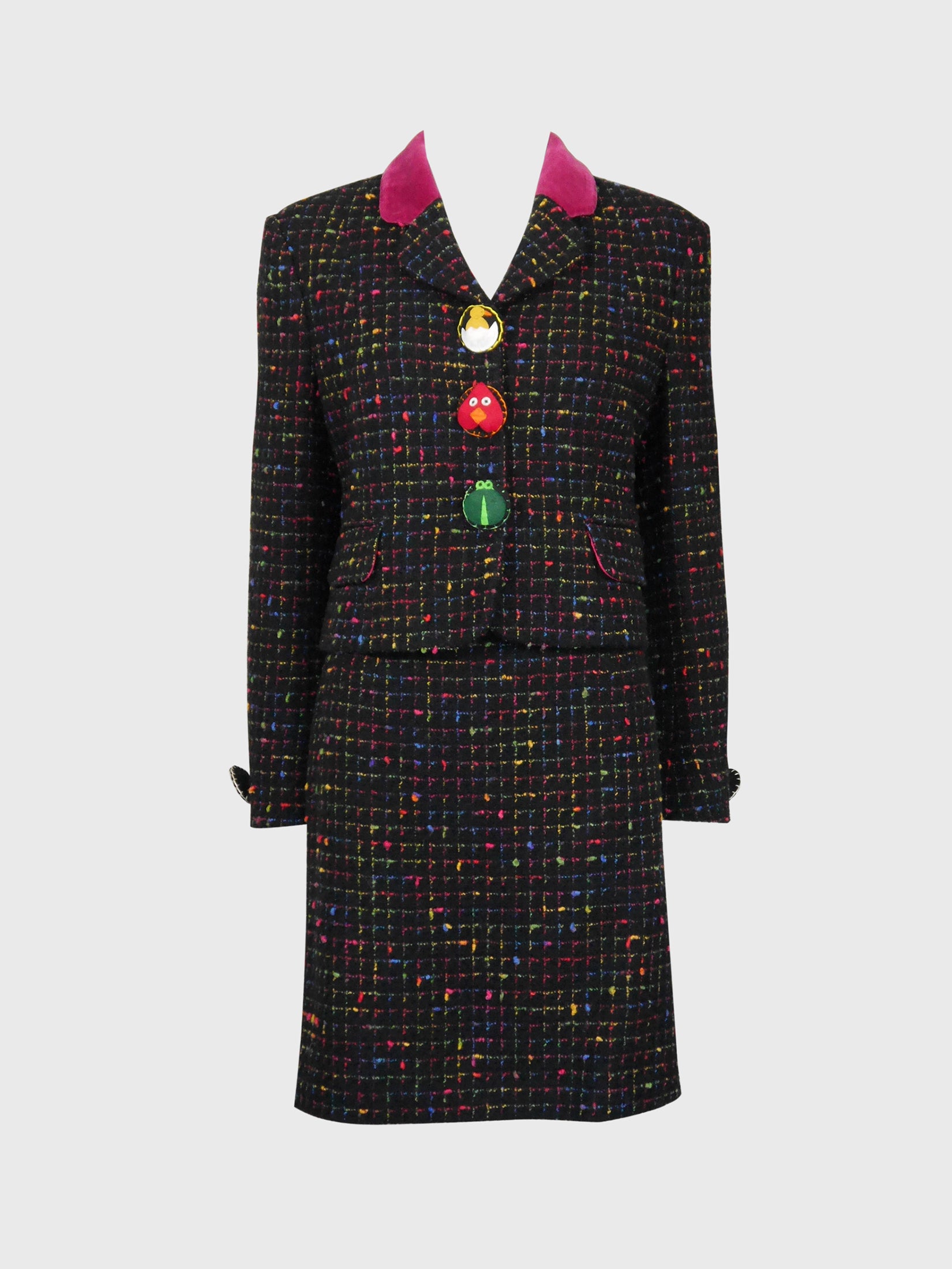 This iconic 1990s Moschino suit pairs a boxy jacket with a matching knee-length skirt in black wool bouclé with rainbow accents, a purple velvet collar, and coordinating purple lining. The jacket is detailed with the original handmade felt buttons featuring stylized animals and the signature “Push for Nature” slogan on the cuffs, while fastening discreetly with three concealed logo buttons underneath. The skirt closes at the side with a zipper and fabric-covered button. Crafted from 90% virgin wool and 10% polyamide, fully lined in silk rayon (jacket) and acetate-rayon blend (skirt). Distinctive, playful, and effortlessly sophisticated - a quintessential expression of Moschino’s 1990s aesthetic.