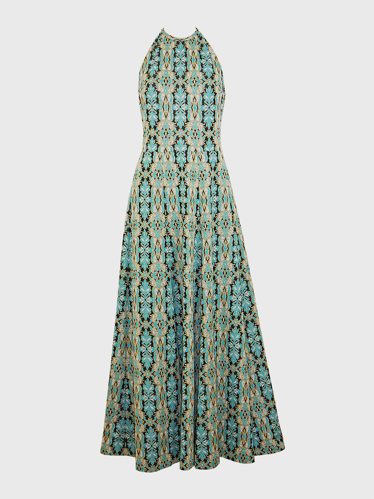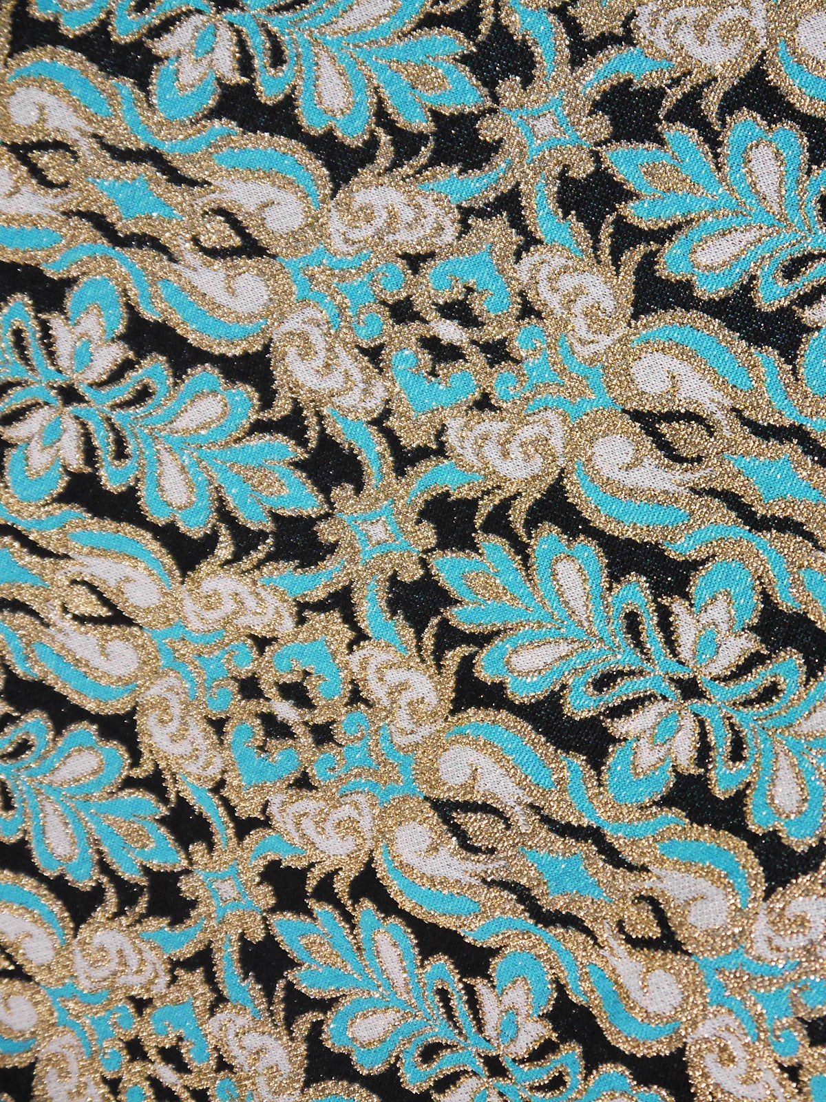 A Pierre Balmain evening gown from the 1960s featuring a high front neckline, a plunging backline and a hook & eye closure at the back of the neck. The dress has a floor-length flared skirt with amazing structure and volume and closes with a hidden back zipper. The fabric is a thick jersey knit with an opulent ornamental pattern in turquoise, beige, black and sparkling gold-tone lurex. Fully lined. Made in France.