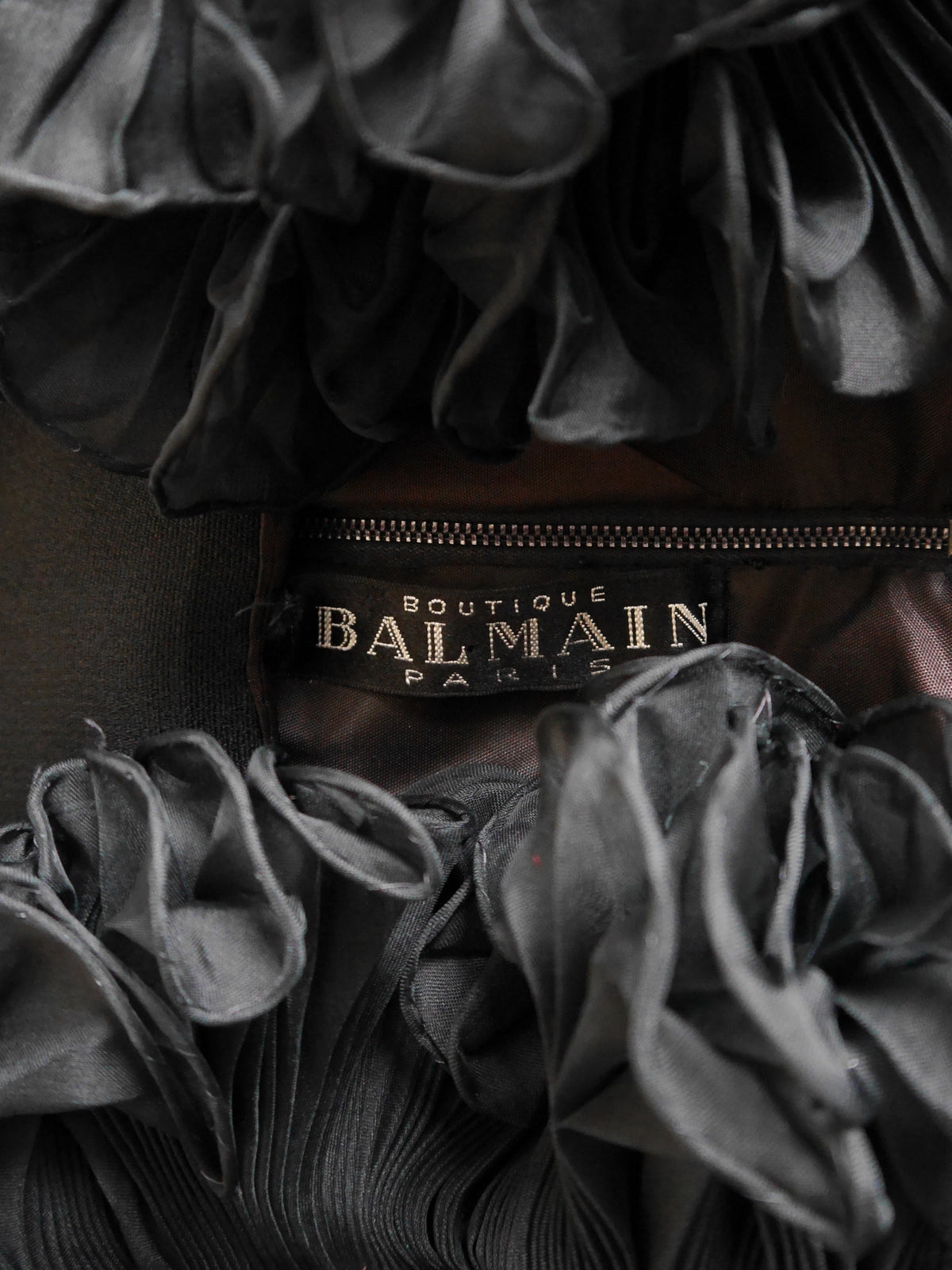 This striking Pierre Balmain evening gown from the 1960s features a square neckline a defined waist and a floor-length skirt. Dramatic bell sleeves with asymmetrical, ruffled cuffs. The dress closes with a back zipper and a metal hook & eye at the back of the neck. The fabric tag is missing - it is a black crepe, fully lined.