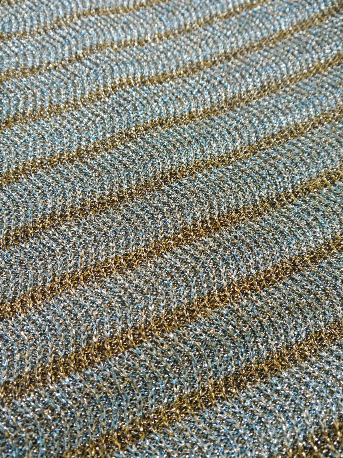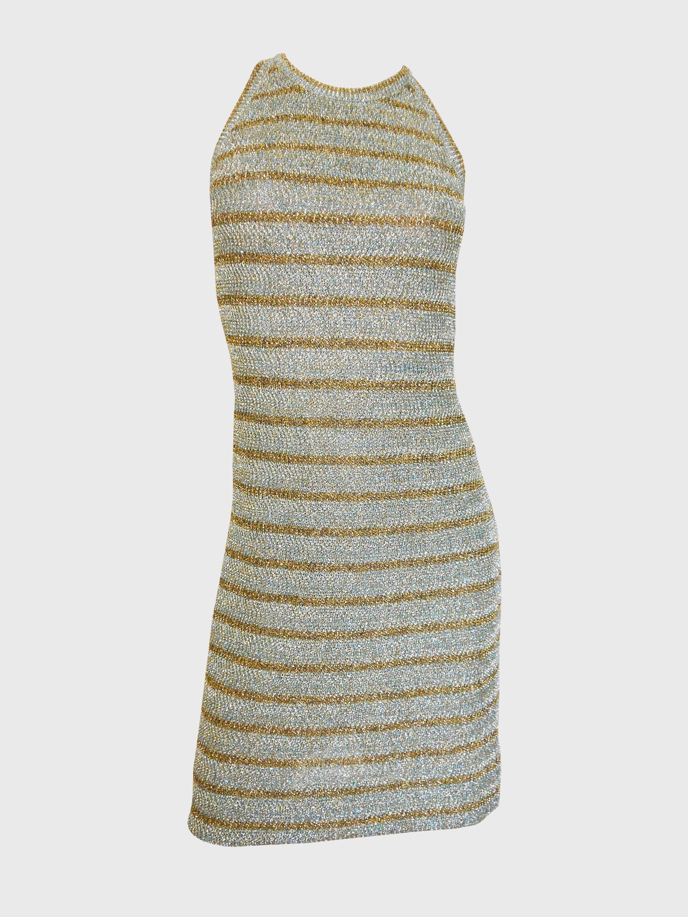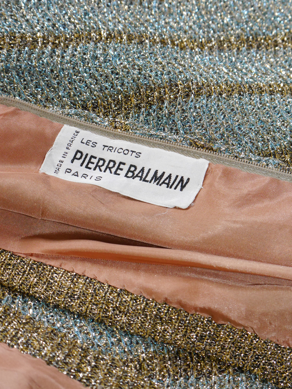 A Pierre Balmain knit dress from the late 1960s, entirely made of lurex in two shades of gold and light metallic blue, knitted into a striped pattern with wave structure. Slim fit, knee-length. Closes with a back zipper and a metal hook & eye at the back of the neck. Fully lined in silky nude fabric. Made in France. A striking and easy-to-wear party piece.