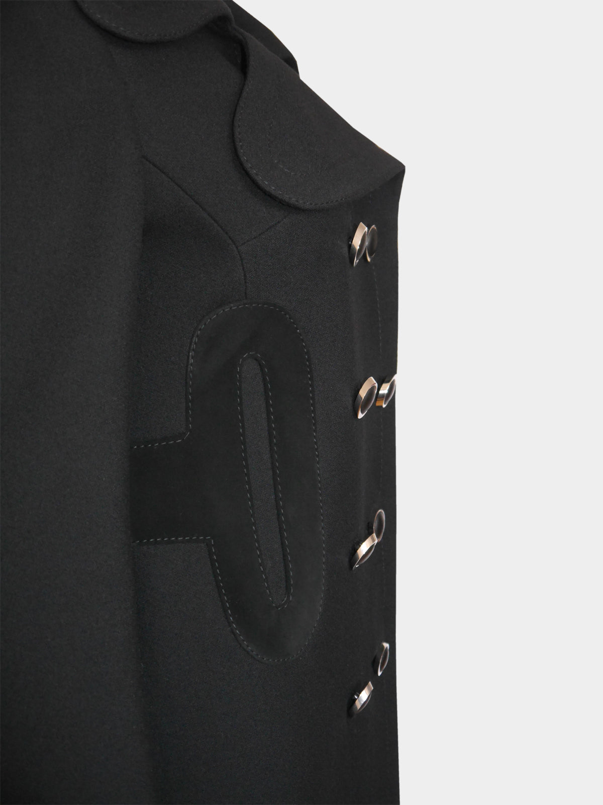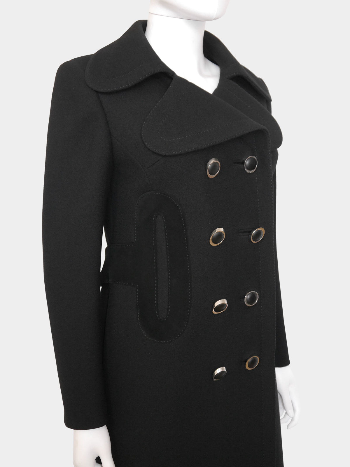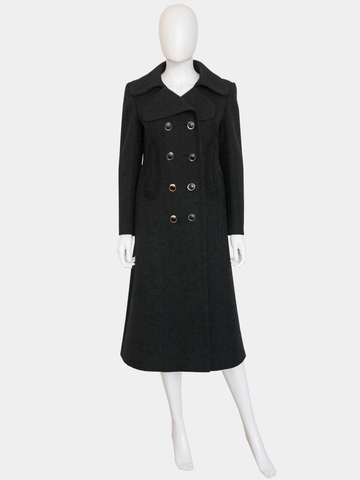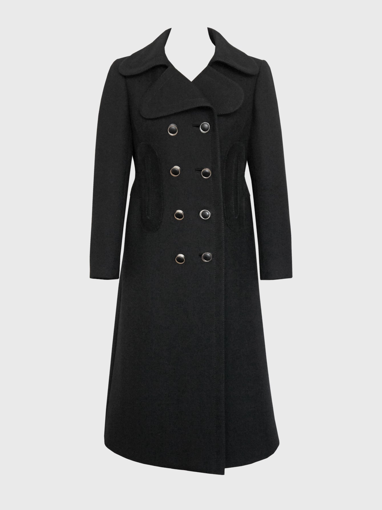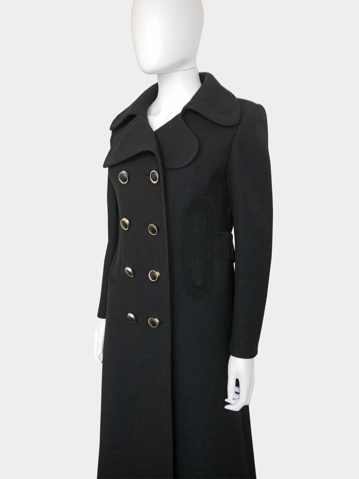 A spectacular coat by Pierre Cardin from the late 1960s. Made of a jet black wool fabric, it has a clean, sharp cut with a double-breasted closure with the original elliptical buttons in silver, large geometric appliqués in soft black suede at the waist that run around the back, and decorative stitching. Hidden side pockets. Midi length. The coat is warm and perfect for fall and winter. Fully lined. Made in France.