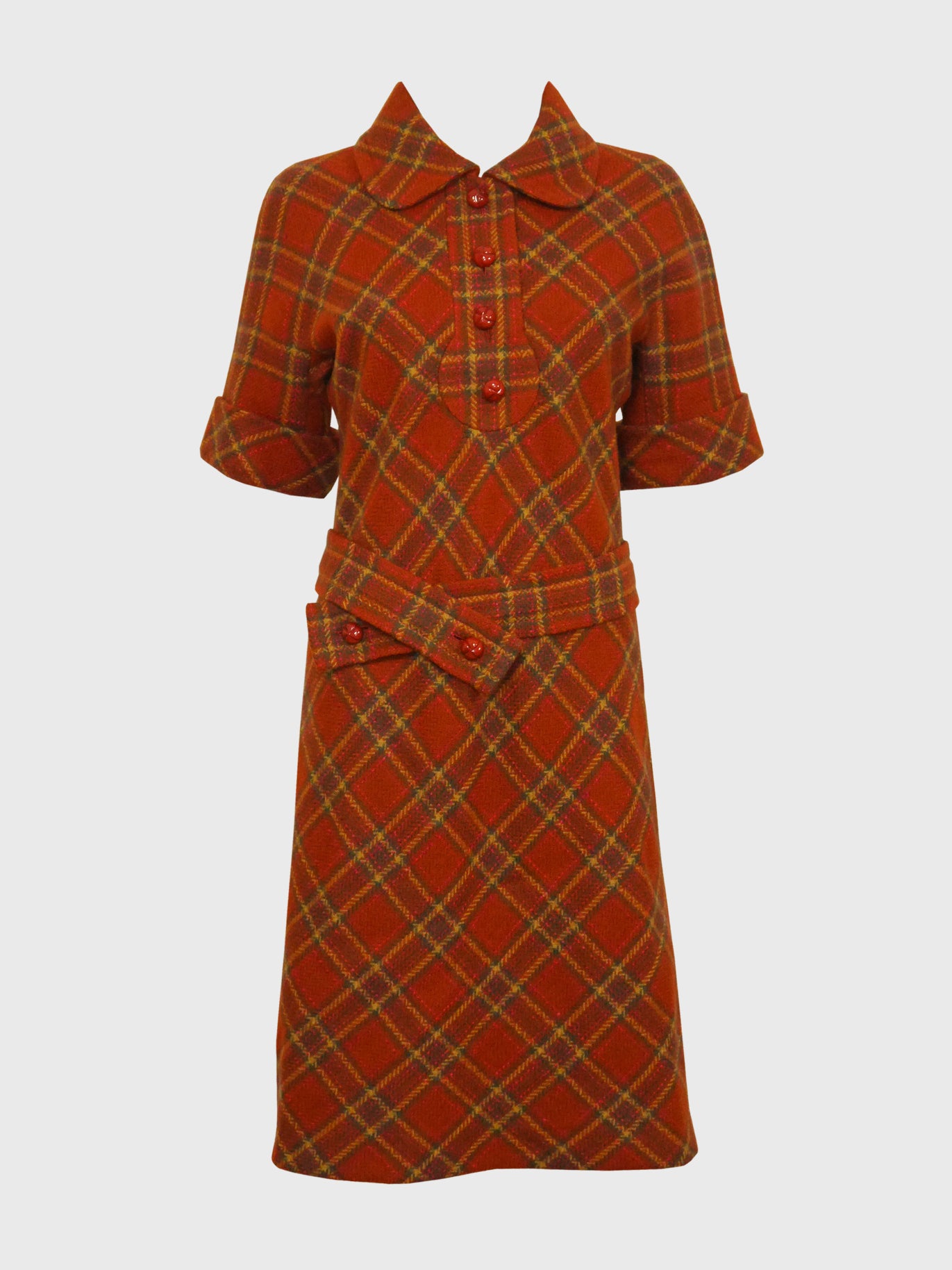 This Pierre Cardin dress from c. 1967-1970 is made of a warm wool fabric with a large-scale plaid pattern in mustard yellow, olive green and salmon pink against a rusty orangey brown background. The dress features a beautiful collar, a buttoned front with very decorative original buttons and a circle detail at the center. It has half-length sleeves with generous cuffs. There is a belt that is made of the same fabric that runs around the lower waist and is attached with two buttons. The skirt is slightly flared and sits at knee-length. The dress closes with a back zipper and is fully lined. The collar is further secured with a metal hook and eye.