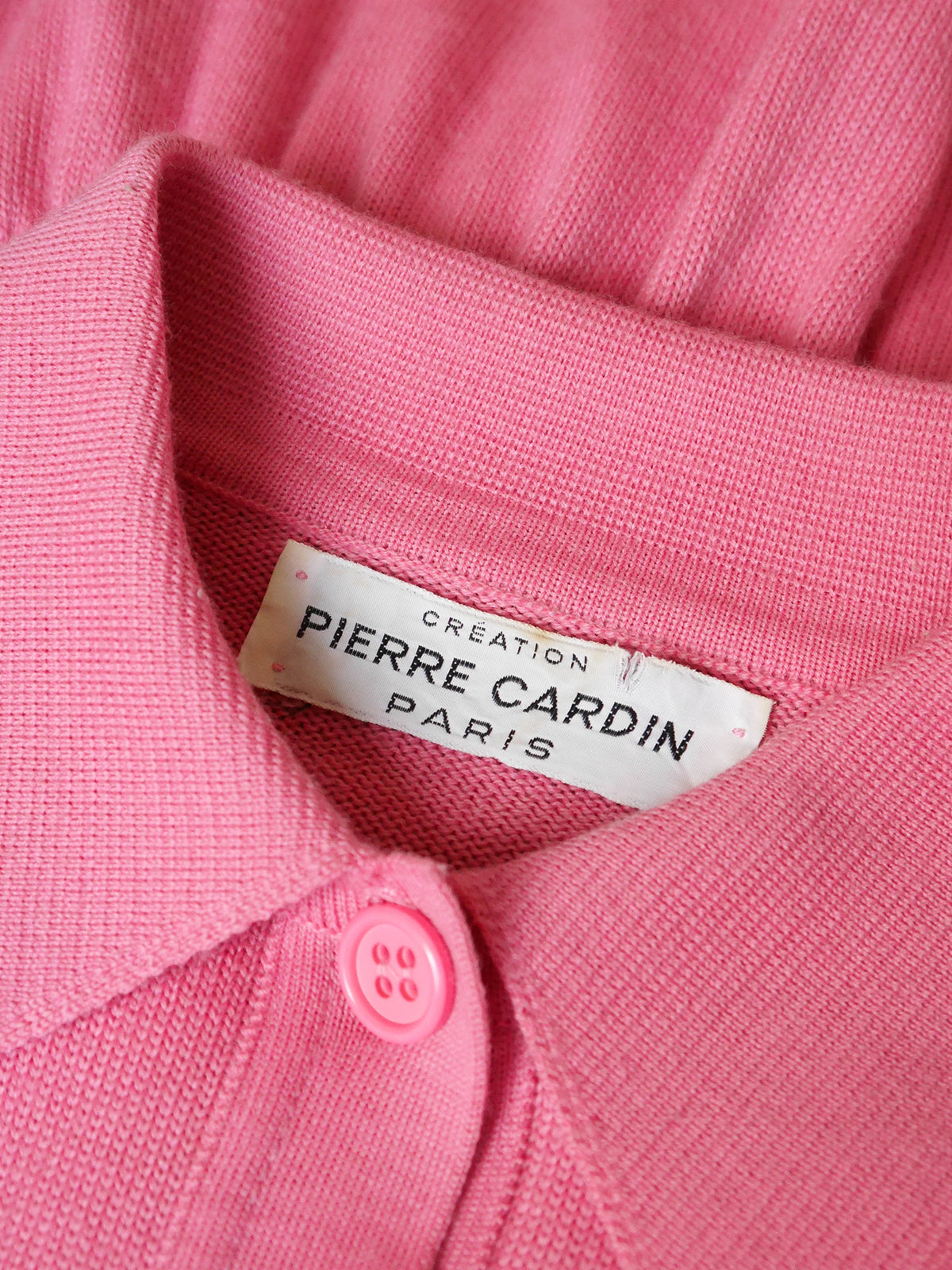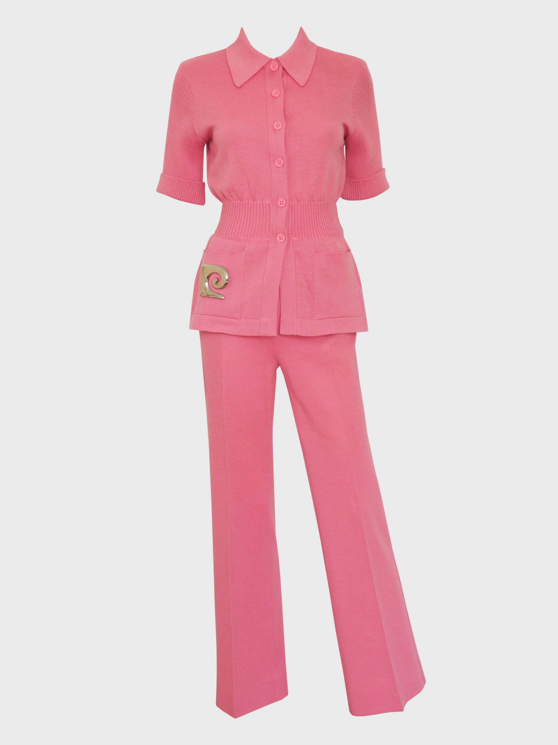 This rare vintage Pierre Cardin ensemble gives off a more casual and sporty vibe while maintaining a chic and sleek silhouette which is so characteristic of the early to mid 1970s fashion when it would have been created. The set is made in a fresh shade of pink and comprises a cute knit sweater jacket or cardigan and the matching jersey pants. The jacket features a pointed collar, ribbed half-length sleeves and cute front pockets, one of which is adorned with a very large eye-catching silver-tone signature "C" that leaves no doubt about the designer. It has a fitted cut, and the waist is further accentuated by the ribbed pattern. The pants feature a straight and slightly flared cut with a centered crease to each leg and close at the center front with a hidden zipper and a button. No material tag, both pieces are unlined. The pants are unlabeled.