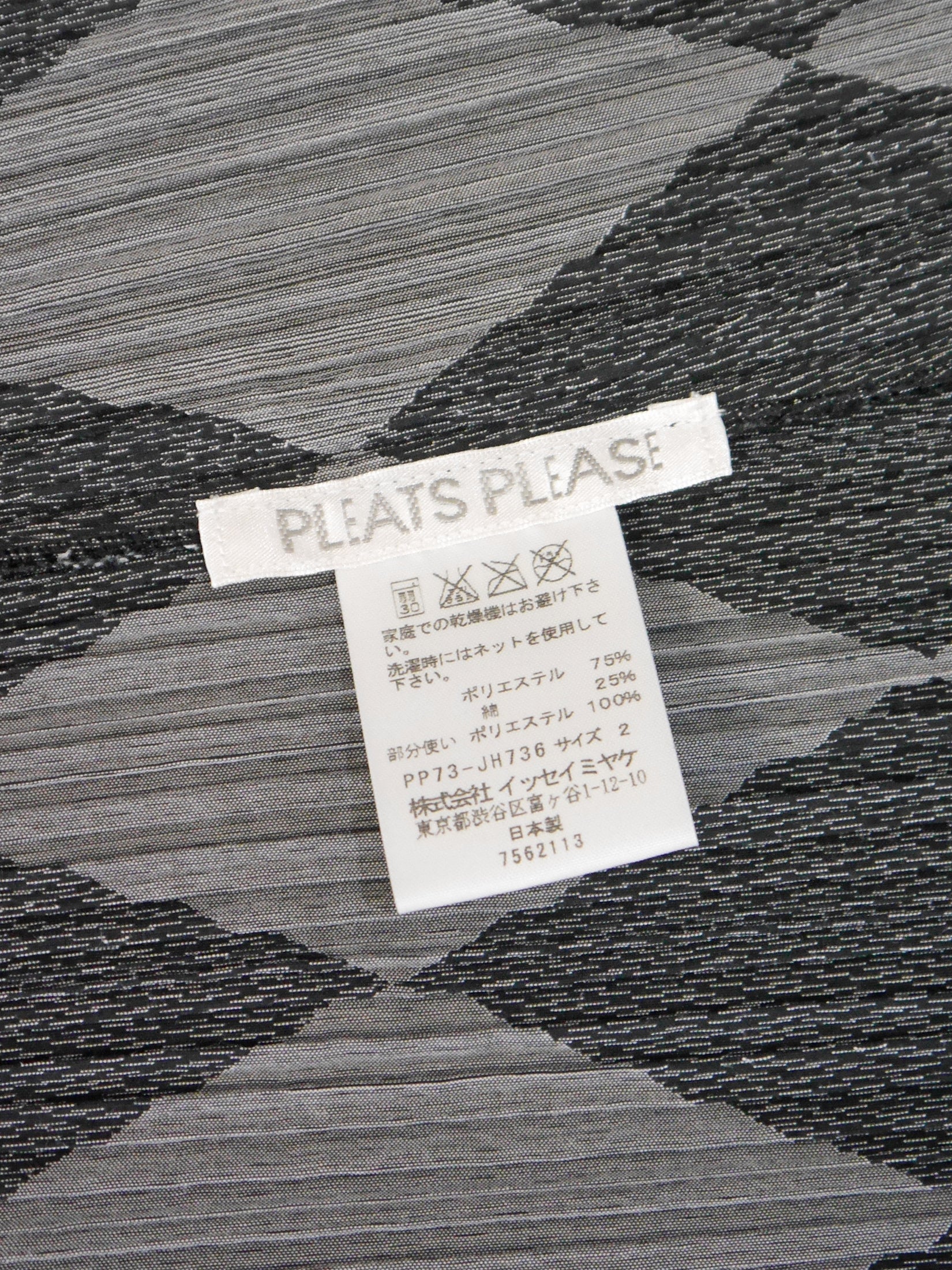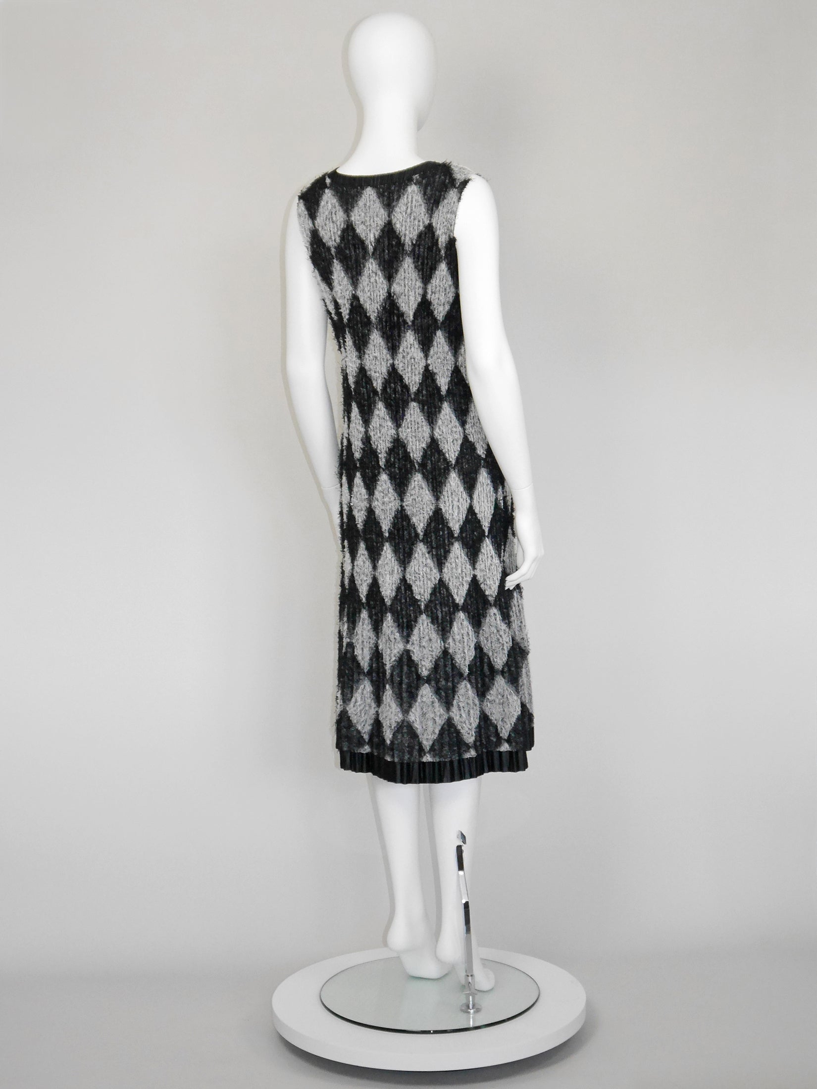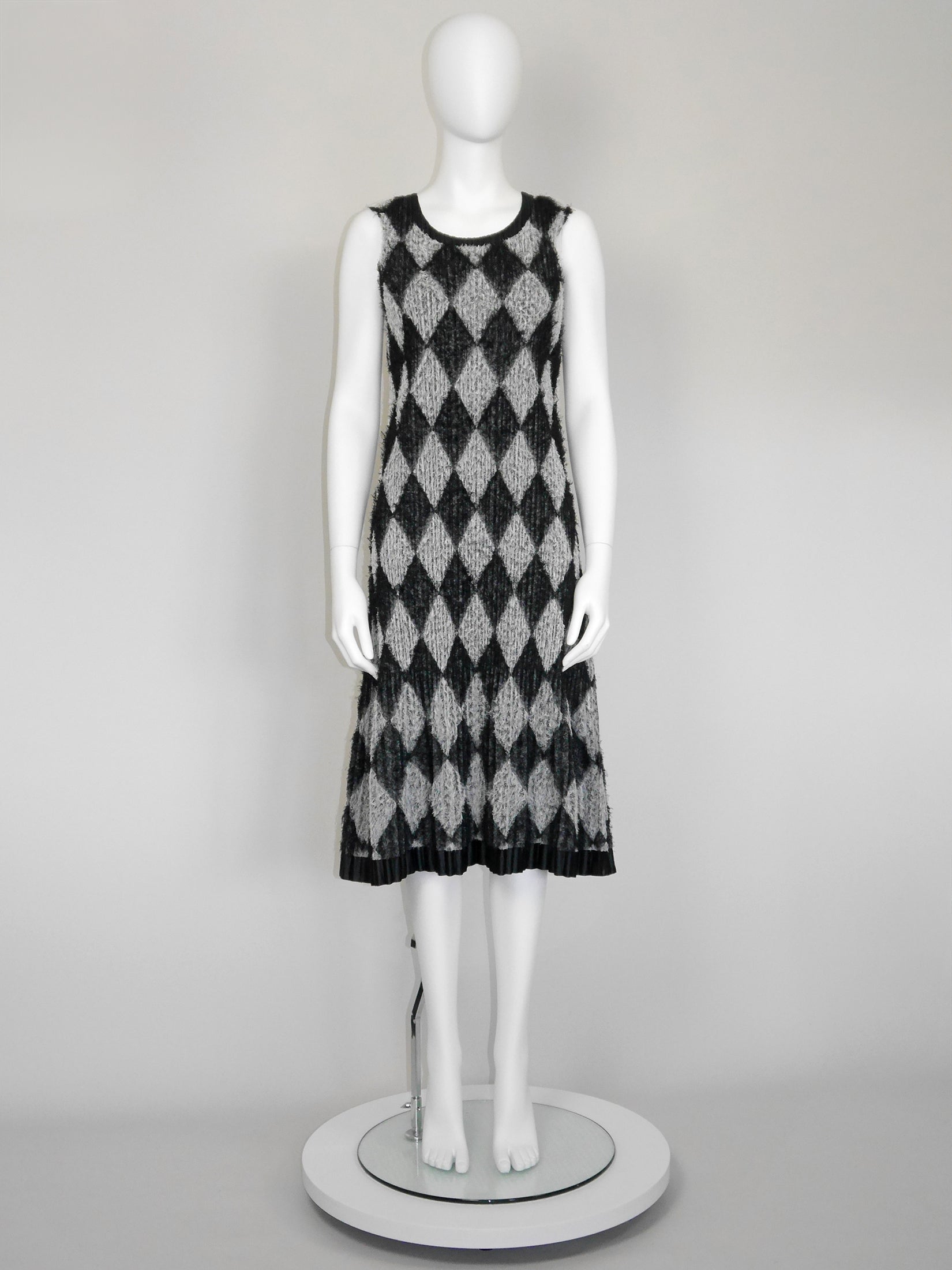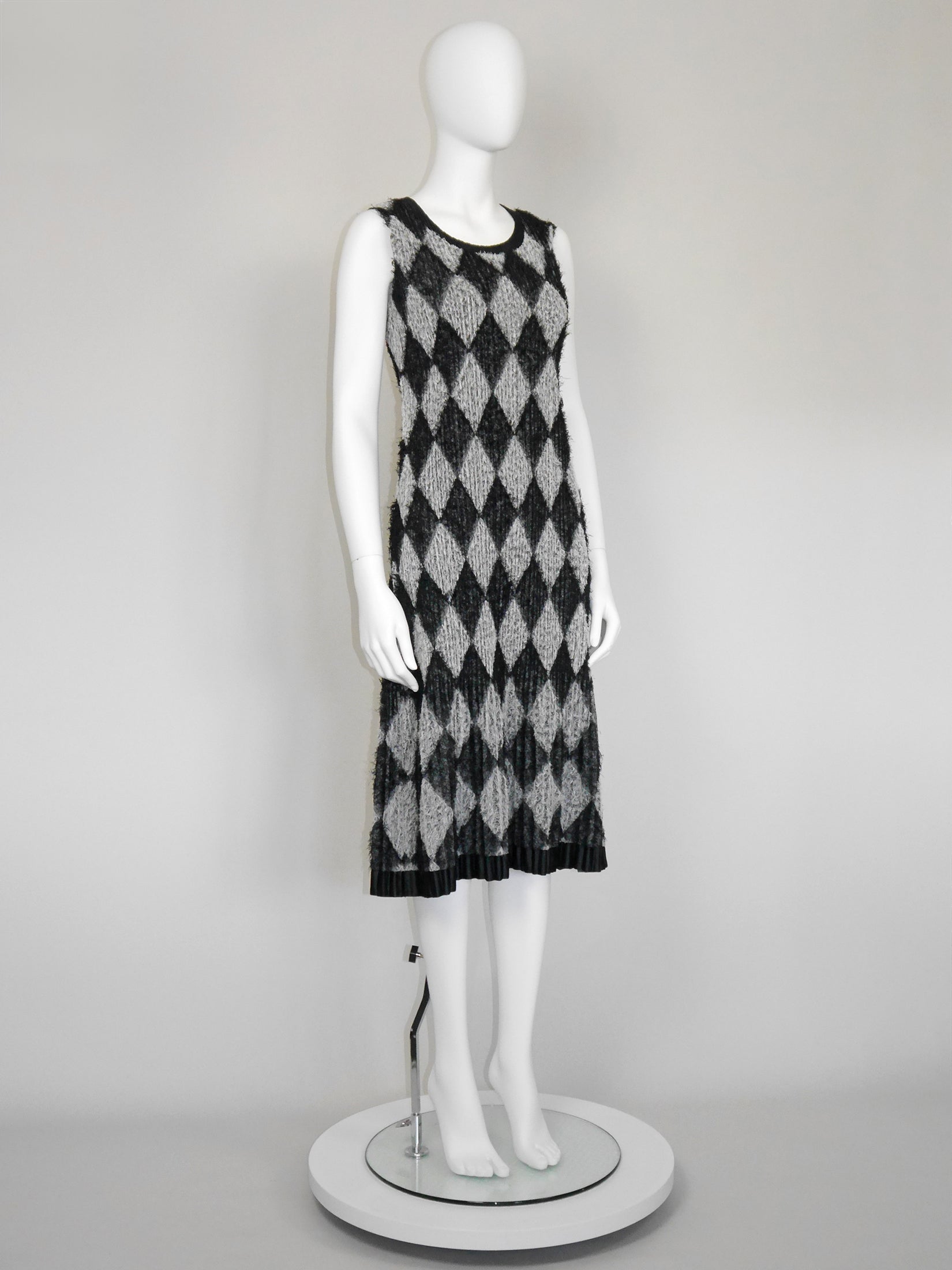 This vintage Pleats Please dress from Issey Miyake has everything that you would expect from a piece by the Japanese avant-garde brand: the famous pleats, a fascinating print and an unusual texture. The sleeveless dress is pleated throughout and features a black and gray diamond pattern with a black and white fuzzy wool surface. It slips on to wear and has a flared skirt that ends at midi-length.