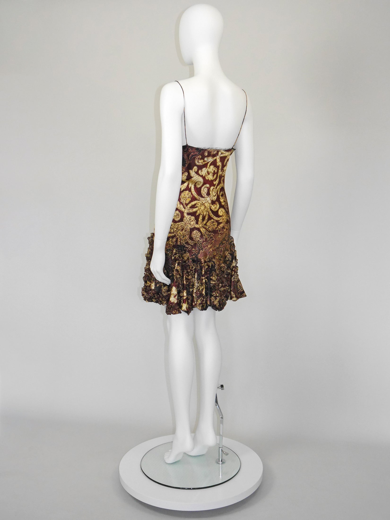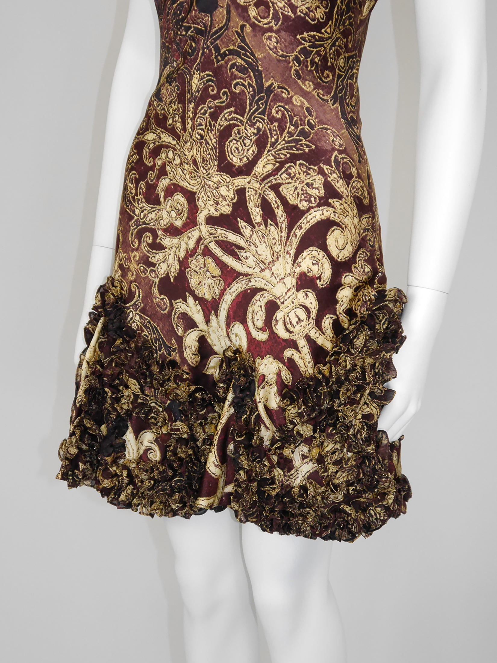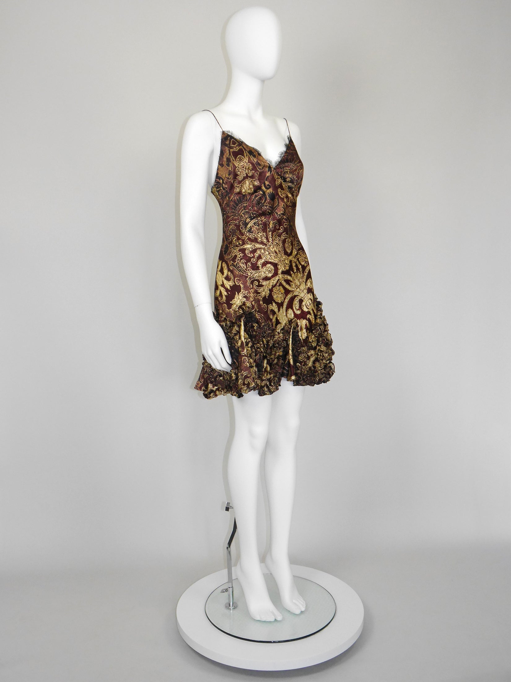 This iconic vintage Roberto Cavalli dress from Fall 2004 is made from fine burgundy silk with a golden baroque print and subtle golden glitter accents. The lingerie-style dress is cut on the bias and features a black lace edge, delicate spaghetti straps and a widely flared and lavishly ruffled mini skirt. The opulent ruffles add some weight to the dress and give it a three-dimensional effect. The skirt is incredibly full and simply stunning. Slips on to wear, no closure. 100% silk, unlined. Made in Italy.