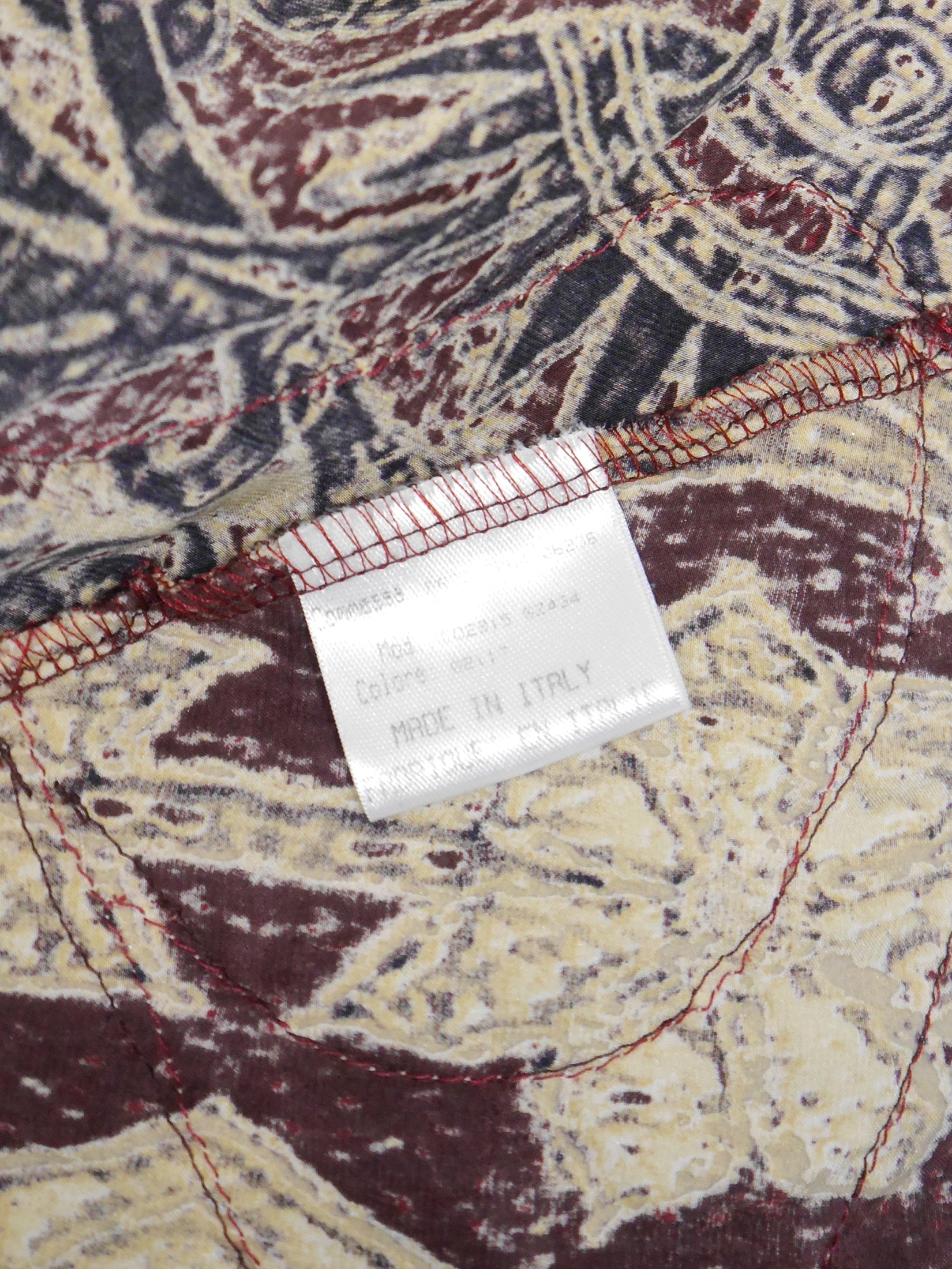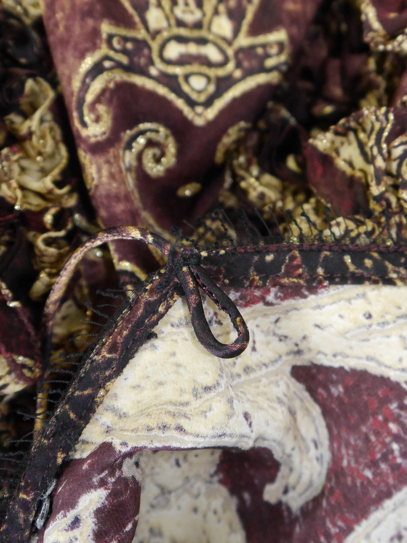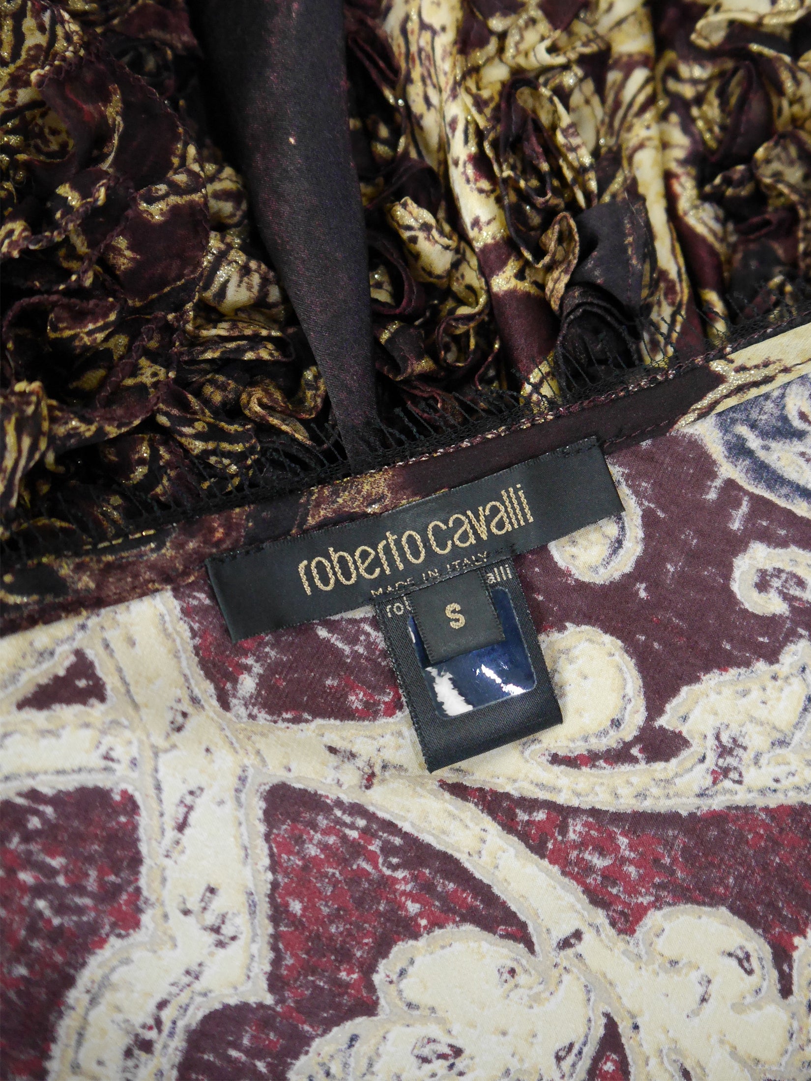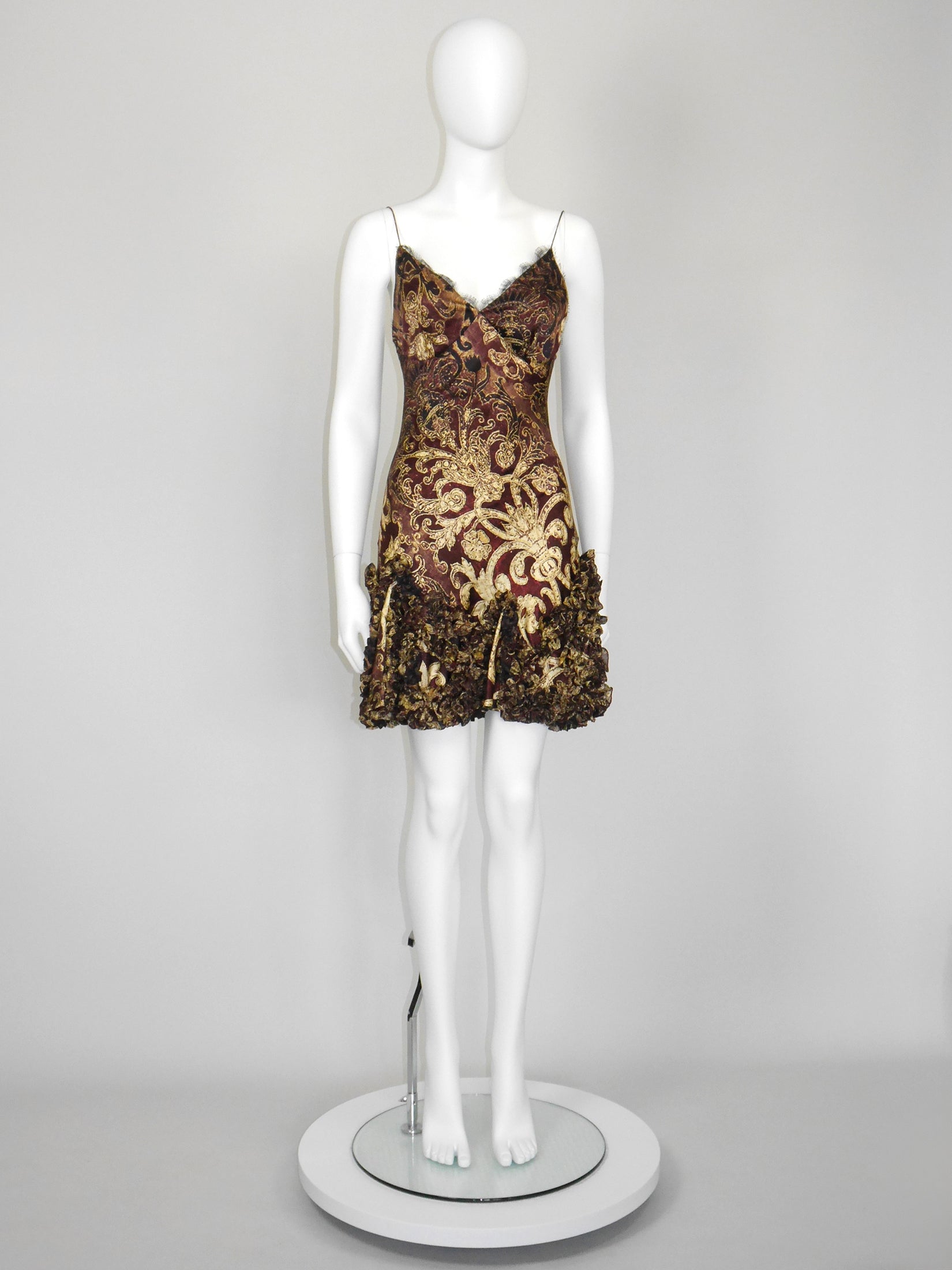 This iconic vintage Roberto Cavalli dress from Fall 2004 is made from fine burgundy silk with a golden baroque print and subtle golden glitter accents. The lingerie-style dress is cut on the bias and features a black lace edge, delicate spaghetti straps and a widely flared and lavishly ruffled mini skirt. The opulent ruffles add some weight to the dress and give it a three-dimensional effect. The skirt is incredibly full and simply stunning. Slips on to wear, no closure. 100% silk, unlined. Made in Italy.