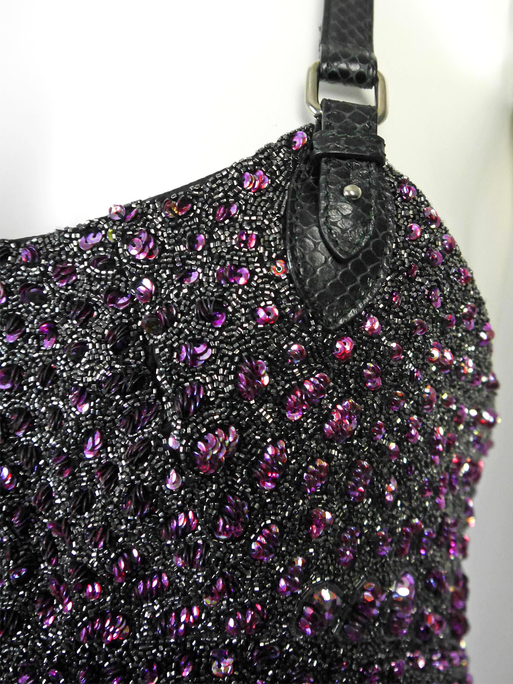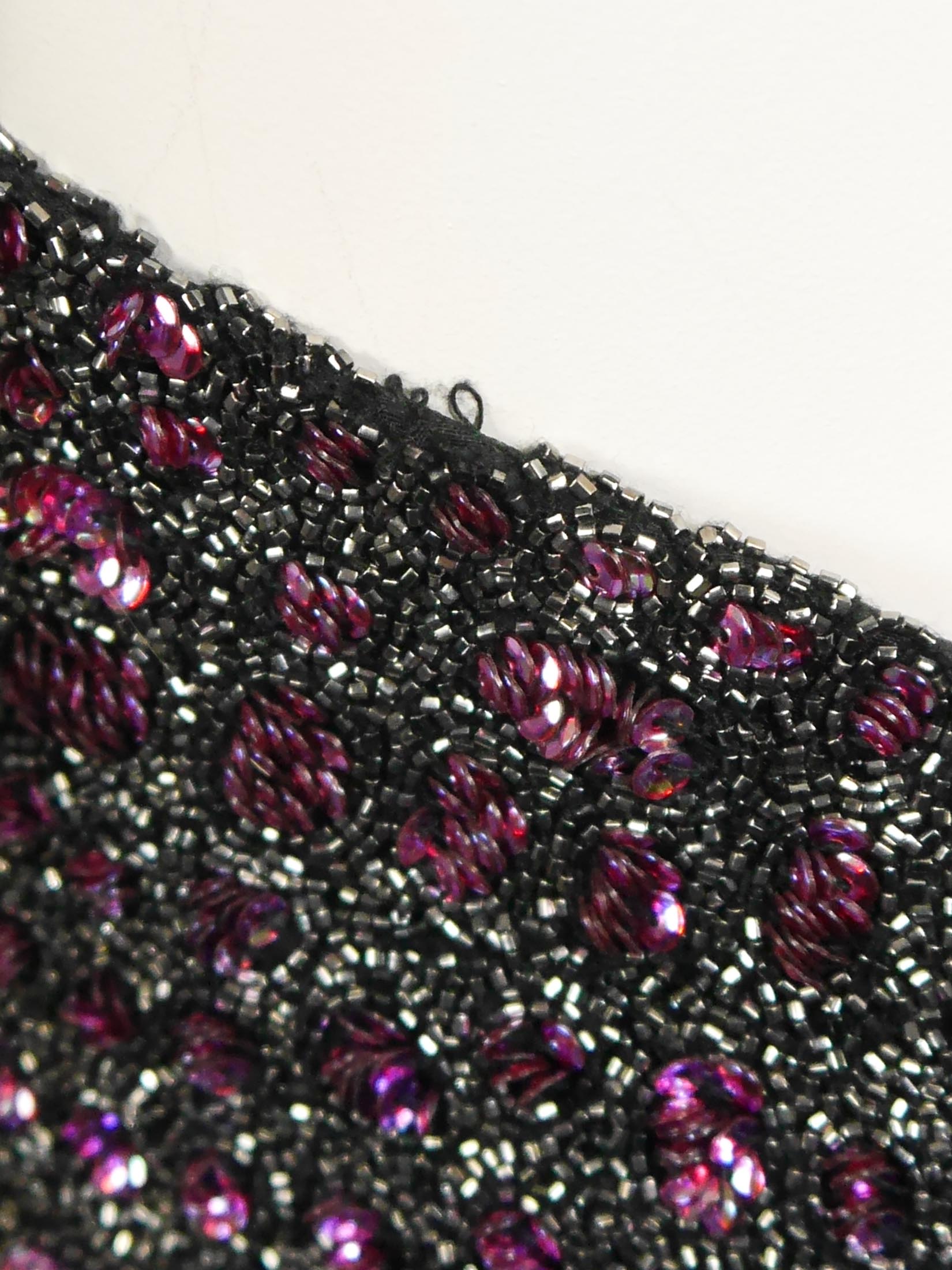 Excellent, unworn condition. Subtle wear on the metal zipper and minor bead loss (around 10 gunmetal beads) along the left edge of the zipper are the only imperfections.