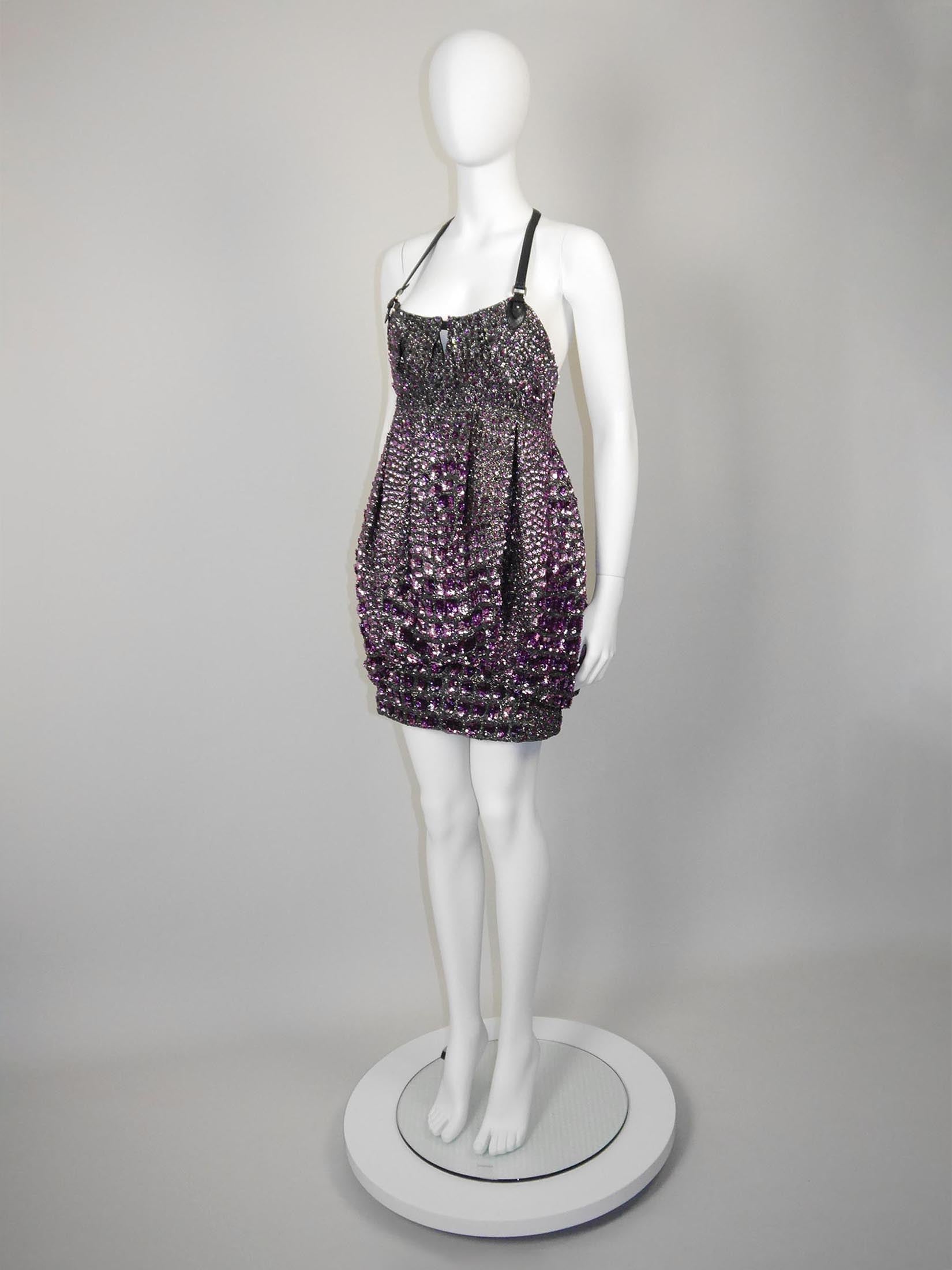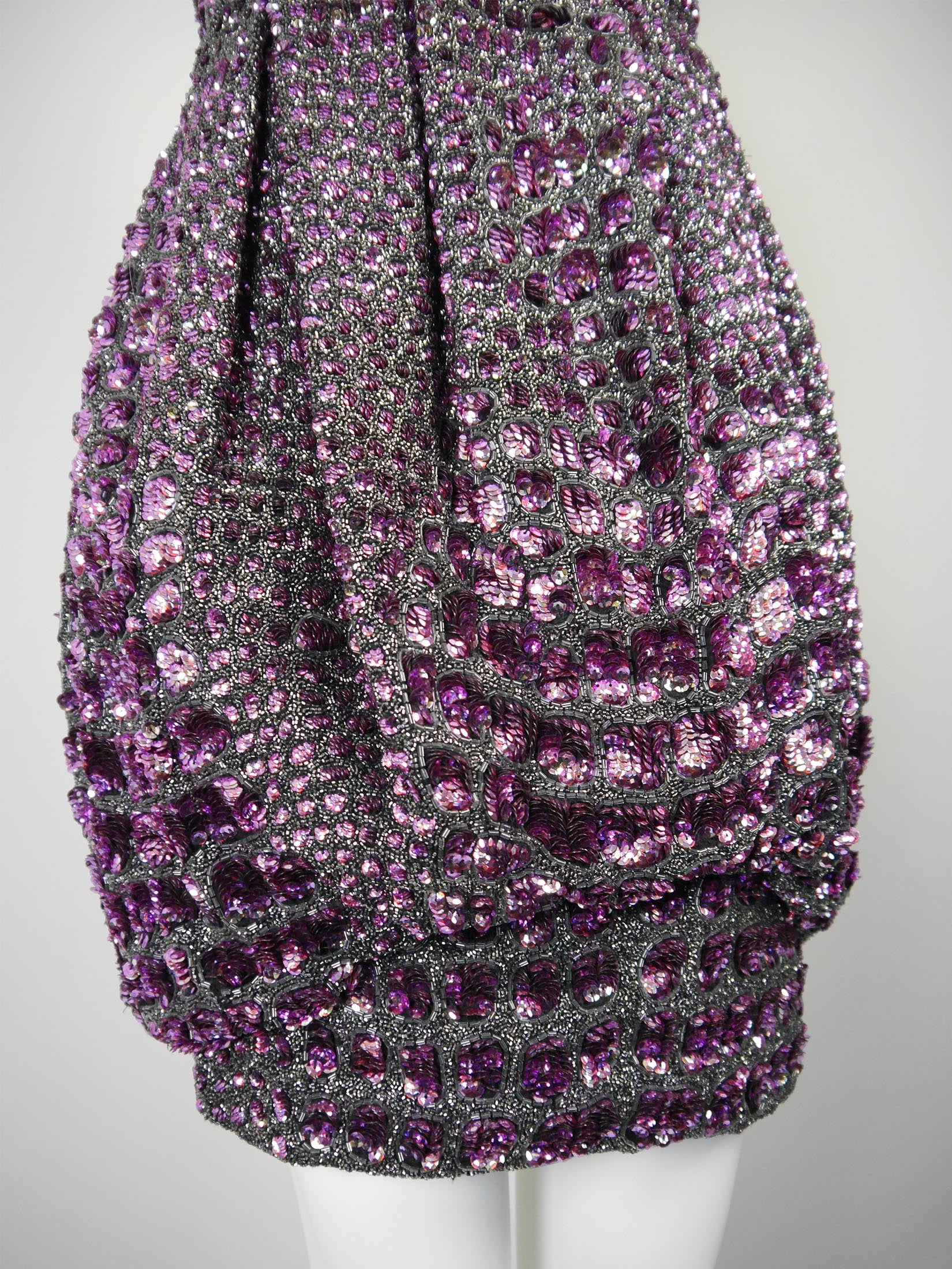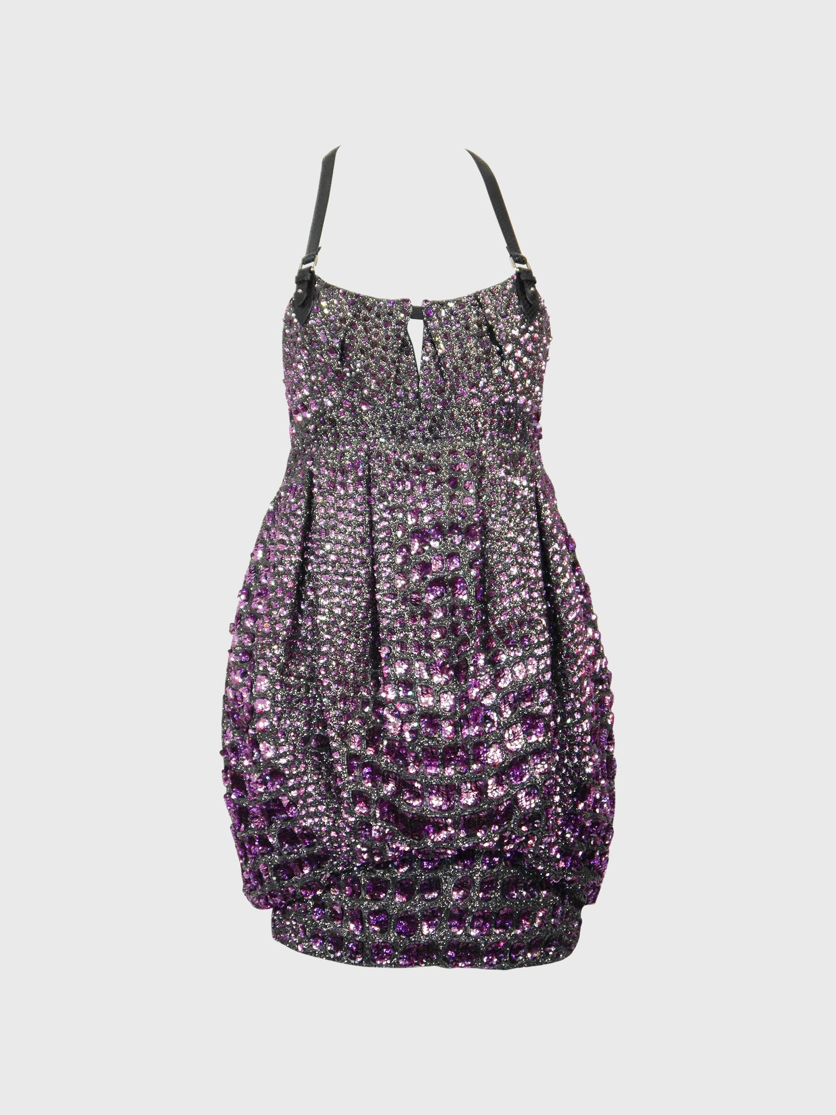 This is look 6 from the collection. A sculptural dress densely embroidered with gunmetal glass beads and amethyst sequins. The piece carries substantial weight, supported by a snake-print leather harness. The skirt is balloon-shaped, with beadwork and sequins arranged in an organic, almost otherworldly pattern. Fastens at the back with a concealed zipper and press studs. The leather shoulder straps open fully for ease and comfort when dressing.