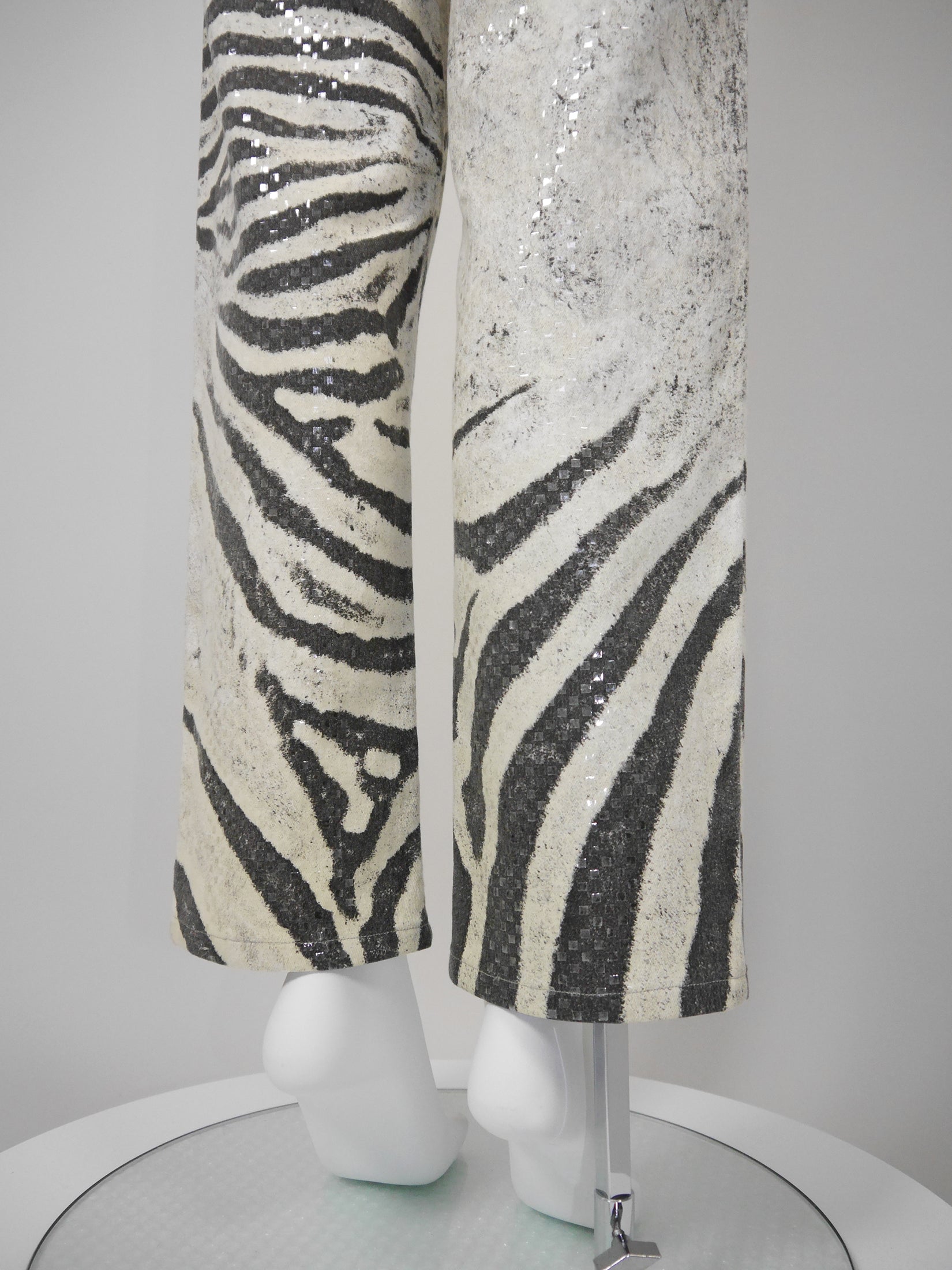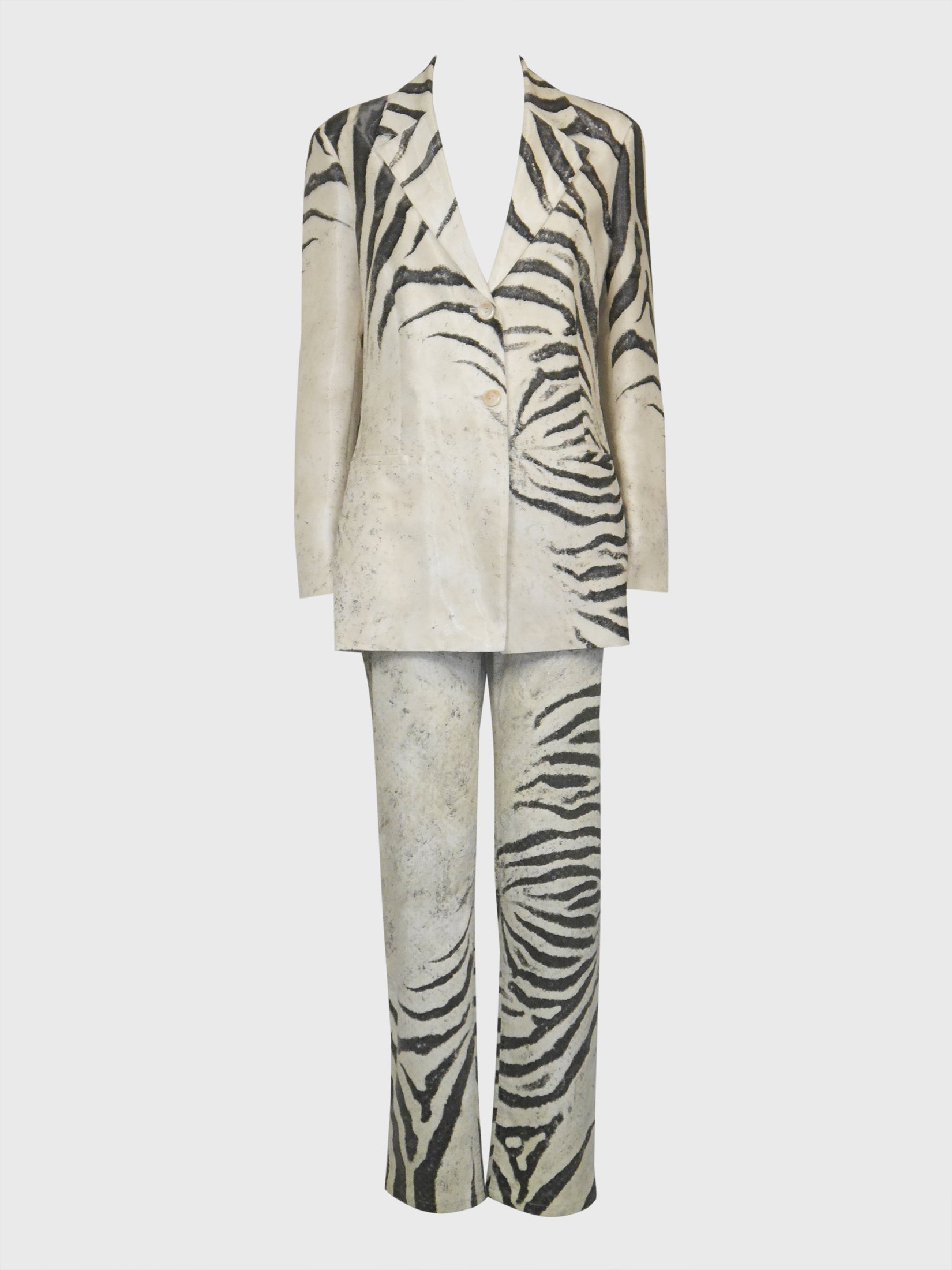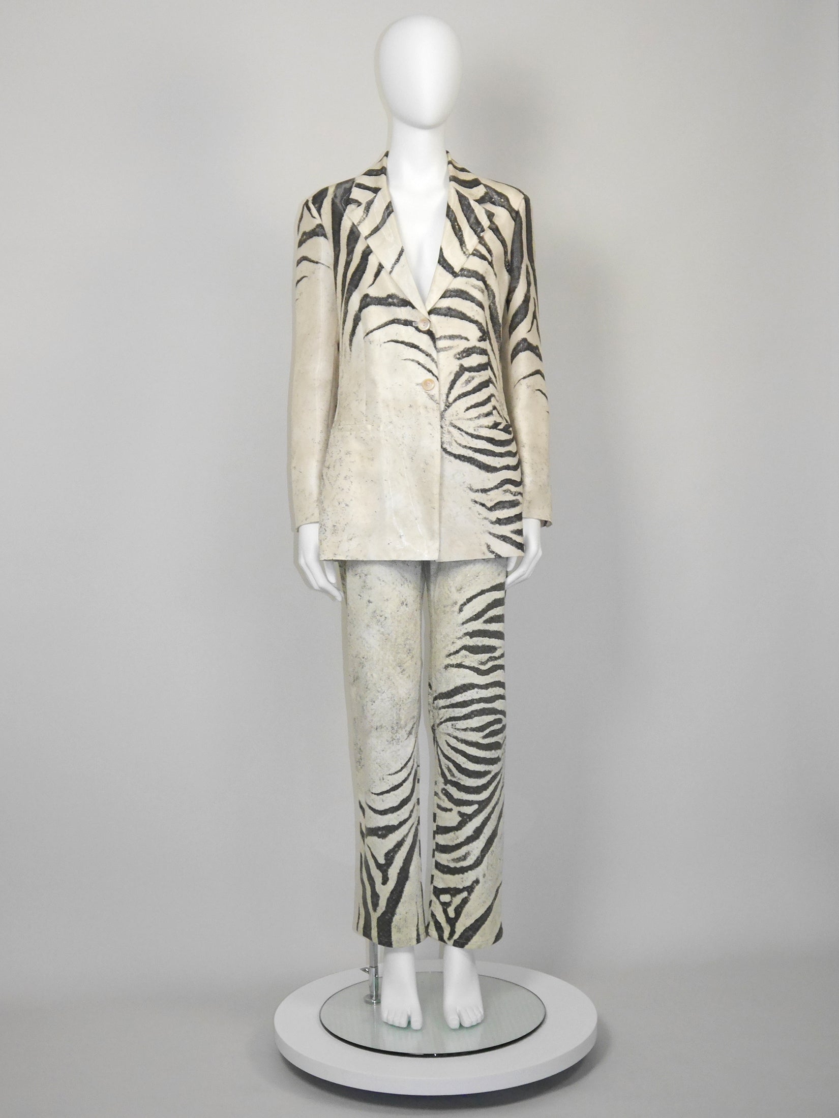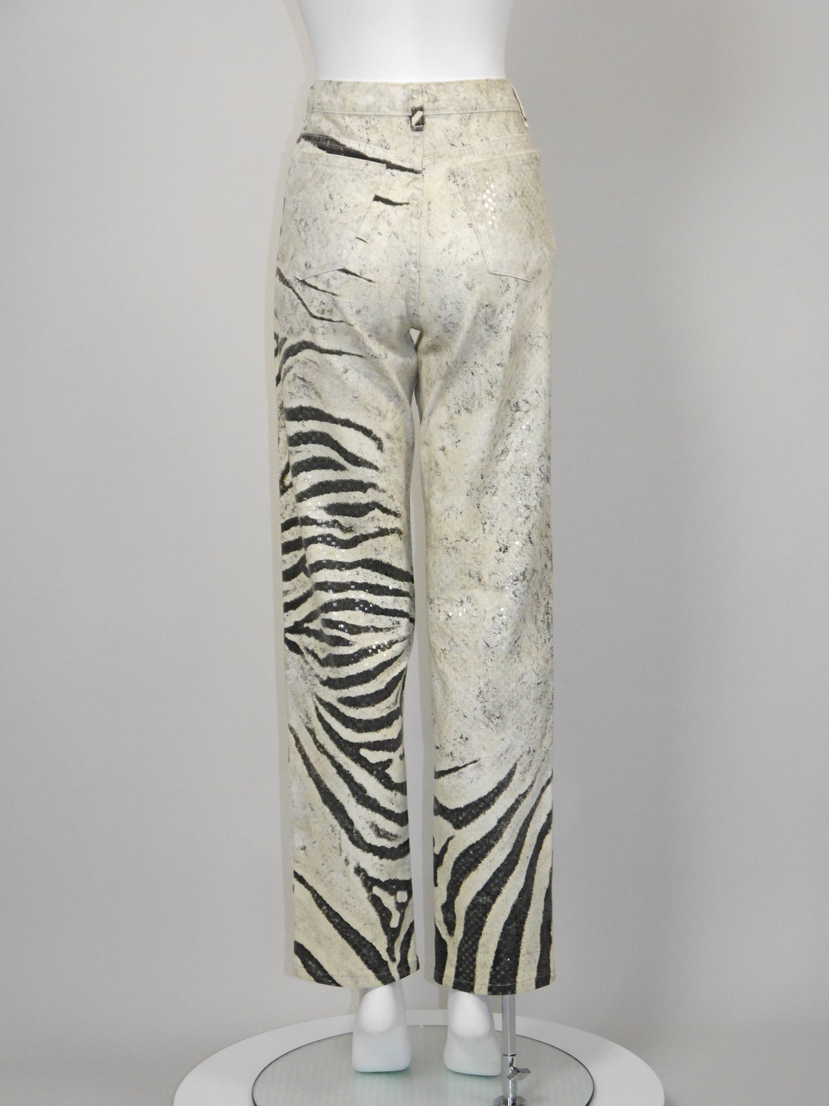 Go bold or go home! This iconic vintage Roberto Cavalli statement suit from Spring 1999 comprises a silk jacket and the matching denim pants that both feature the instantly recognizable zebra print that was a major theme of the collection. The lightweight jacket is made from a silk-nylon blend that has a certain stiffness and glamorous sheen to it. It features a relaxed oversized cut, elongated, with extra long sleeves, and buttons at the front. 77% silk, 23% nylon, fully lined in silky signature lining. The denim pants are made from cotton stretch that is covered with transparent glossy squares that reflect the light. They feature a classic five-pocket design with a high waist and straight legs. Silver-tone hardware. Front closure with a concealed zipper and button. 98% cotton, 2% elasthane. Made in Italy.