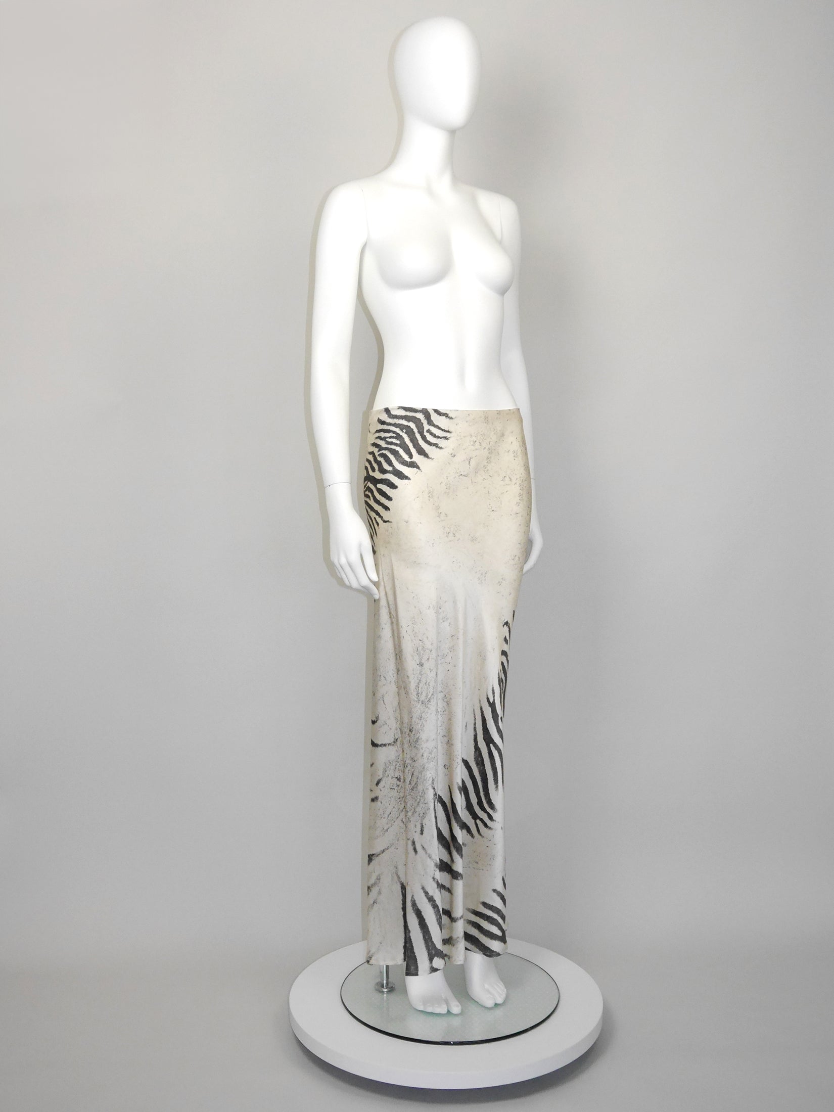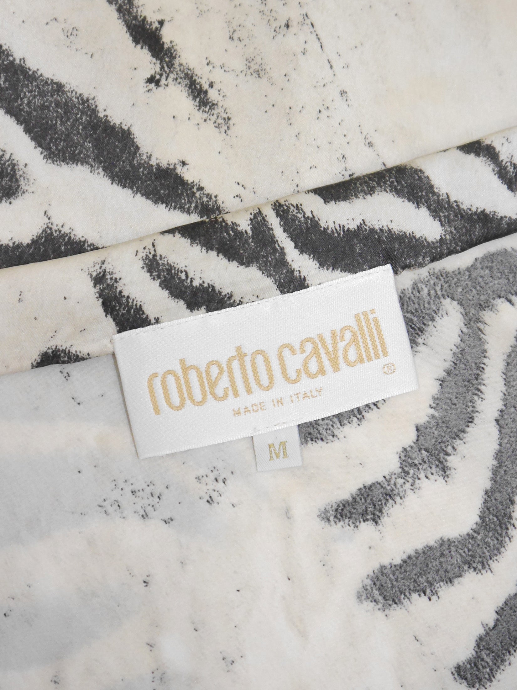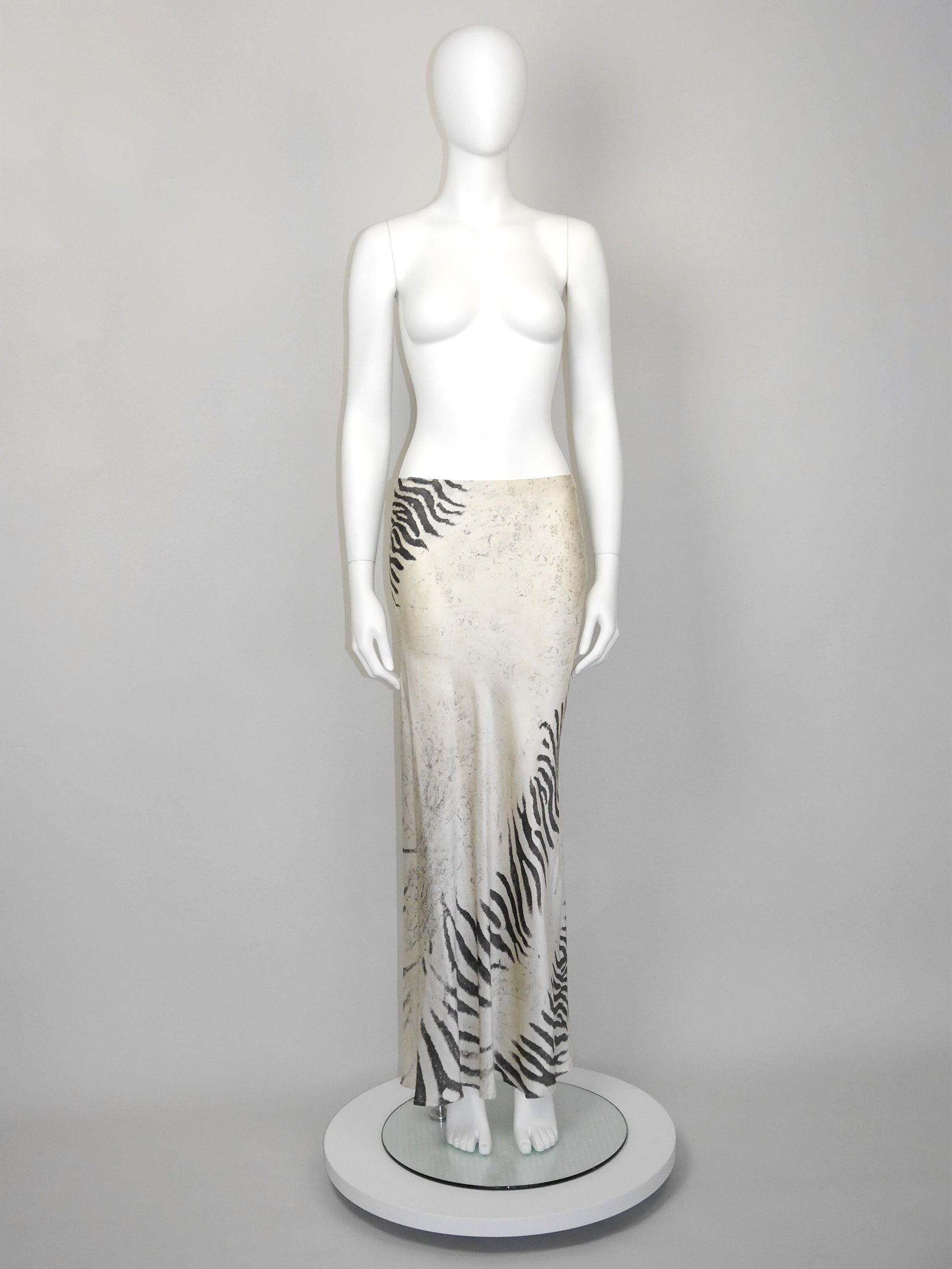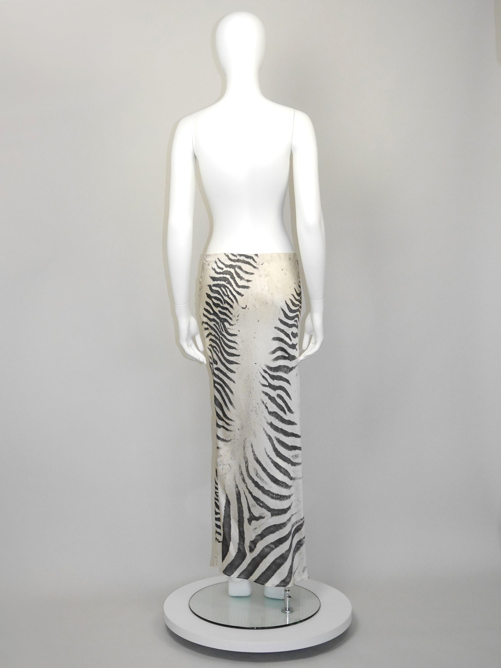 This amazing vintage Roberto Cavalli skirt from his iconic Spring 1999 collection is made of fine silk with the instantly recognizable zebra print. Elasticated waist, full length. 100% silk, unlined. Made in Italy. An iconic vintage Cavalli design that offers versatile styling options. Thanks to the elasticated waist, it can also be worn as a bandeau dress, falling just below the knee, or styled with a belt for a knee-length look. A perfect piece for a chic vacation wardrobe!