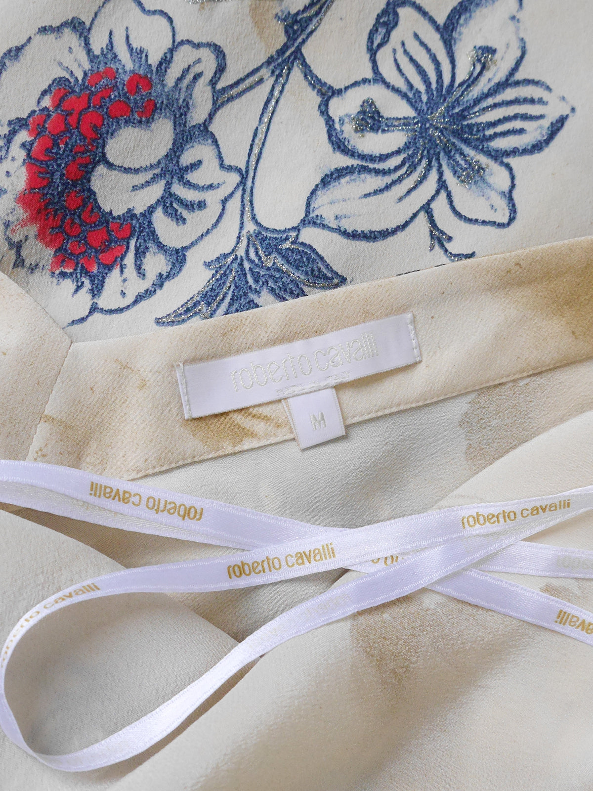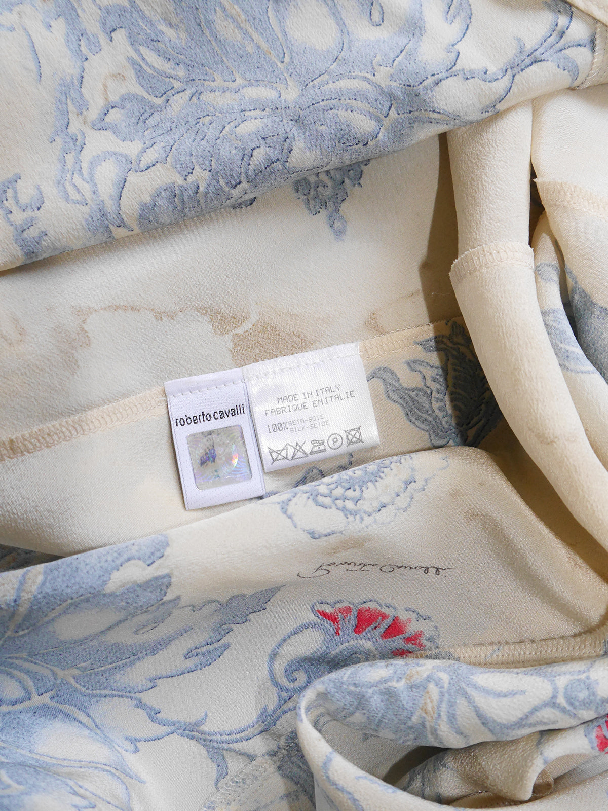 This amazing vintage Roberto Cavalli slip dress from Spring 2003 is made of a densely woven, soft and fluid silk crêpe with an iconic tattoo print including florals, Cavalli's signature tiger and "Amour Cavalli" flags in inky shades of blue, dark brown and red with silver glitter accents against a marbled cream and gold background. The "Roberto Cavalli" signature is scattered throughout. Please have a look at the detail pictures to get an impression of the first-class quality of this stunning fabric. The dress slips on to wear and features a very sexy bias cut with a deep waterfall neckline (with an incorporated weight keeping it in place), an open back and neckholder straps that tie at the back of the neck. Figure-hugging around the hips, the skirt flares out from the knees down into a twirling trumpet hemline with incredible movement, finishing at calf-length. 100% silk, unlined. Made in Italy. Reference photo: Roberto Cavalli Spring 2003 ad campaign with Kamila Szczawińska, shot by Mario Testino.