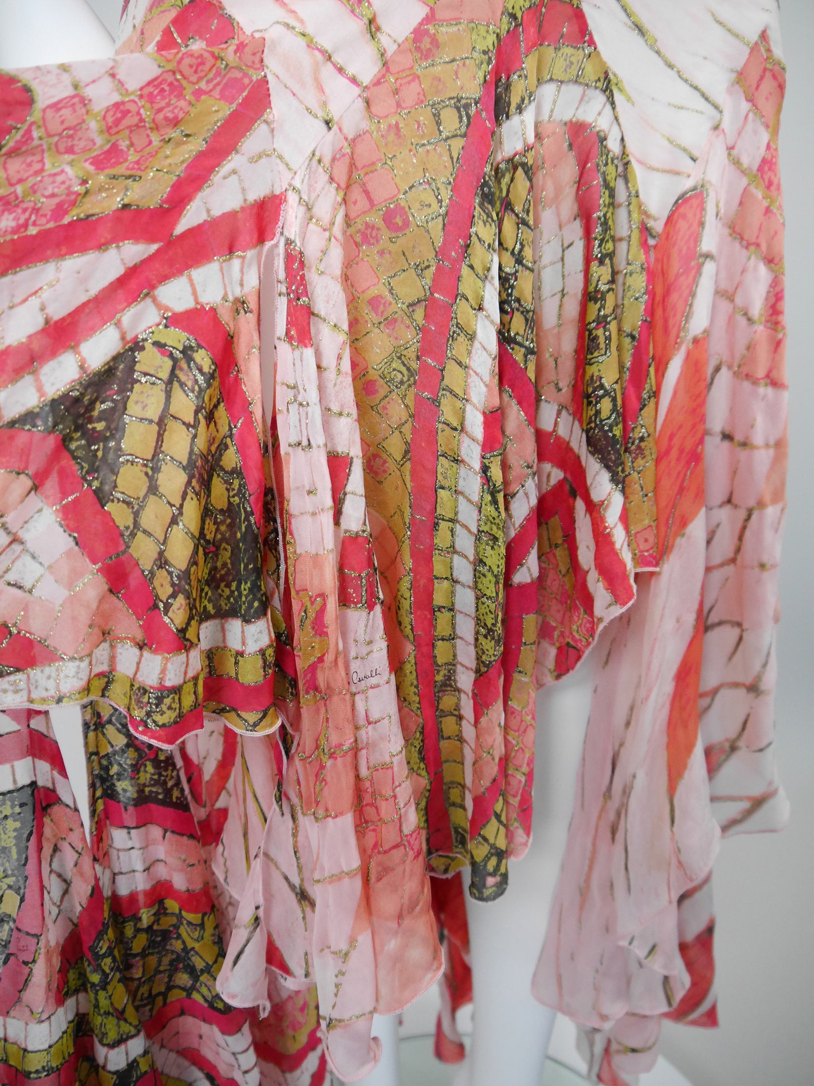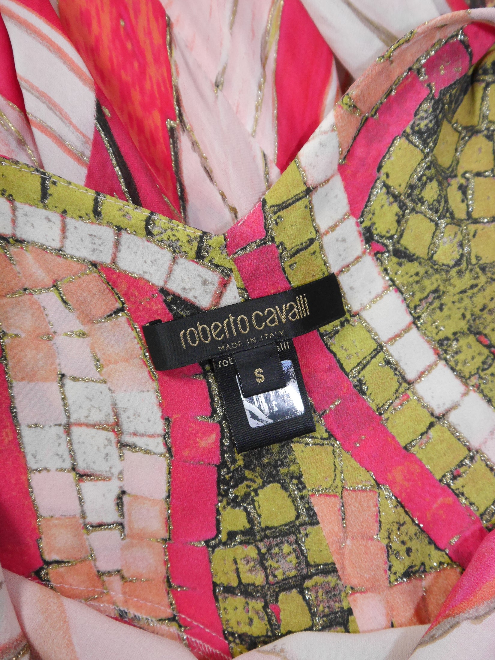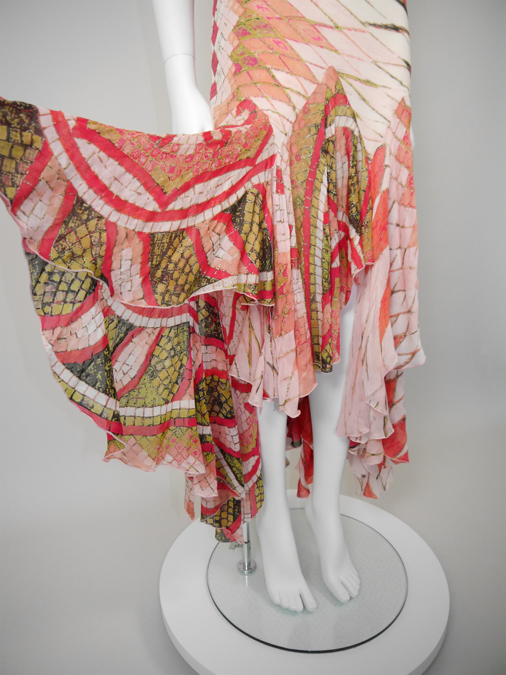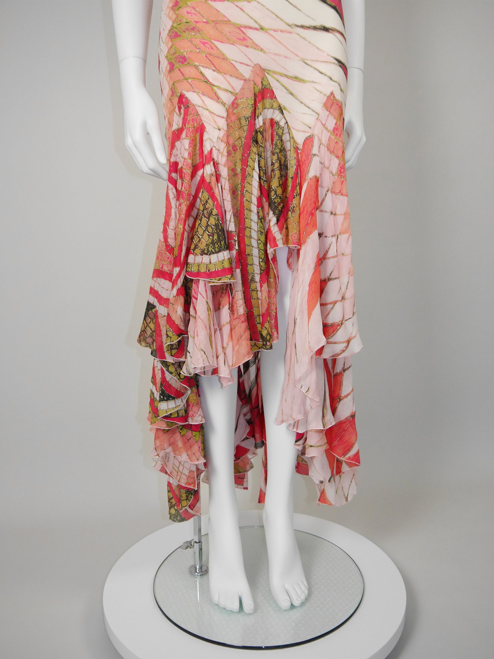 This stunning vintage Roberto Cavalli evening dress is crafted from silk stretch featuring one of the most distinctive prints of the Spring 2004 collection with gold glitter accents and the Roberto Cavalli signature in the fabric. The dress has a fitted backless bodice with delicate shoulder straps that will adjust to your body and a show-stopping skirt with a sexy high-low handkerchief hemline achieved through multiple large fine silk panels with fantastic movement. No closure, slips on to wear. 96% silk, 4% lycra. Skirt panels 100% silk. Made in Italy.