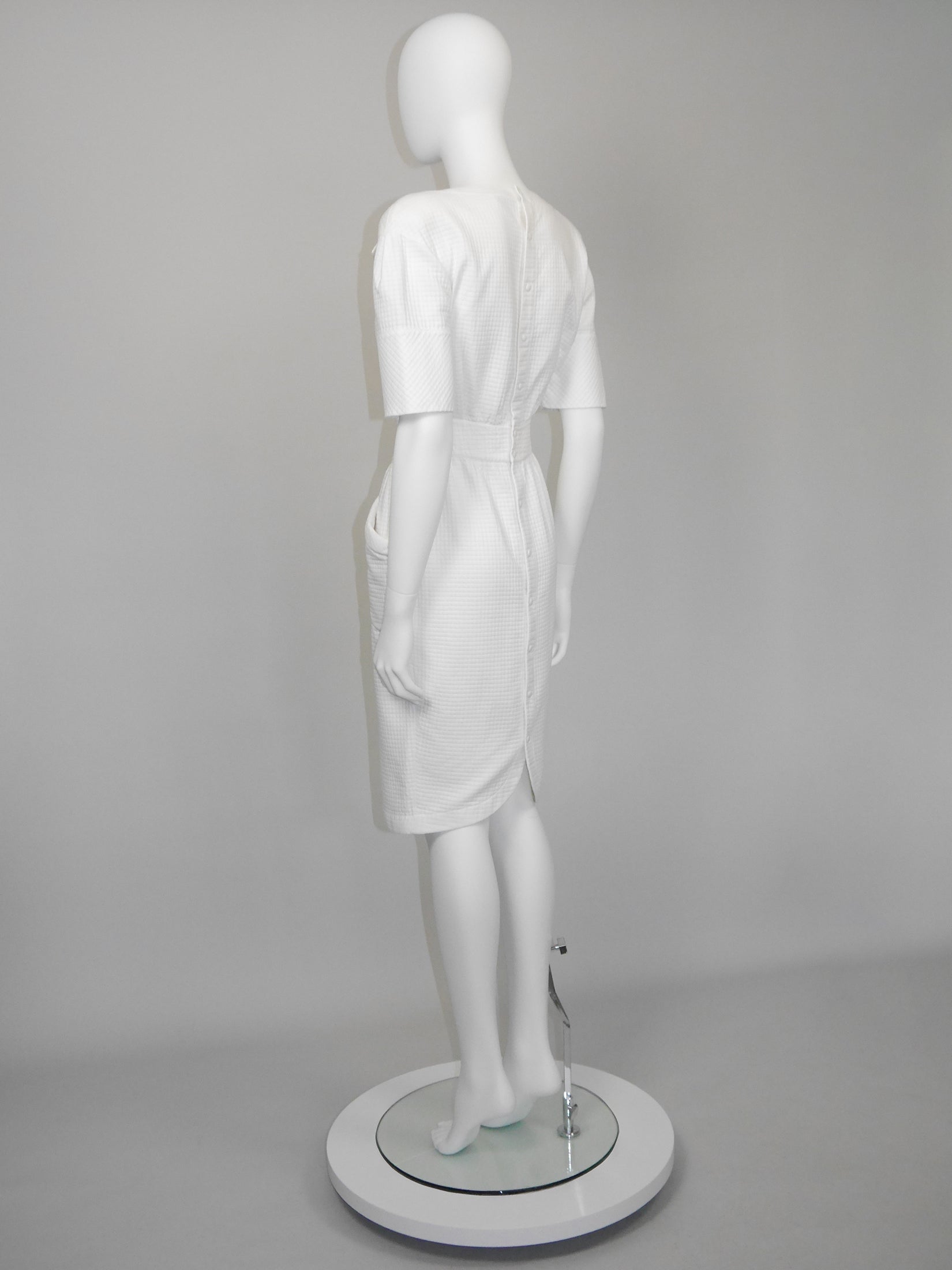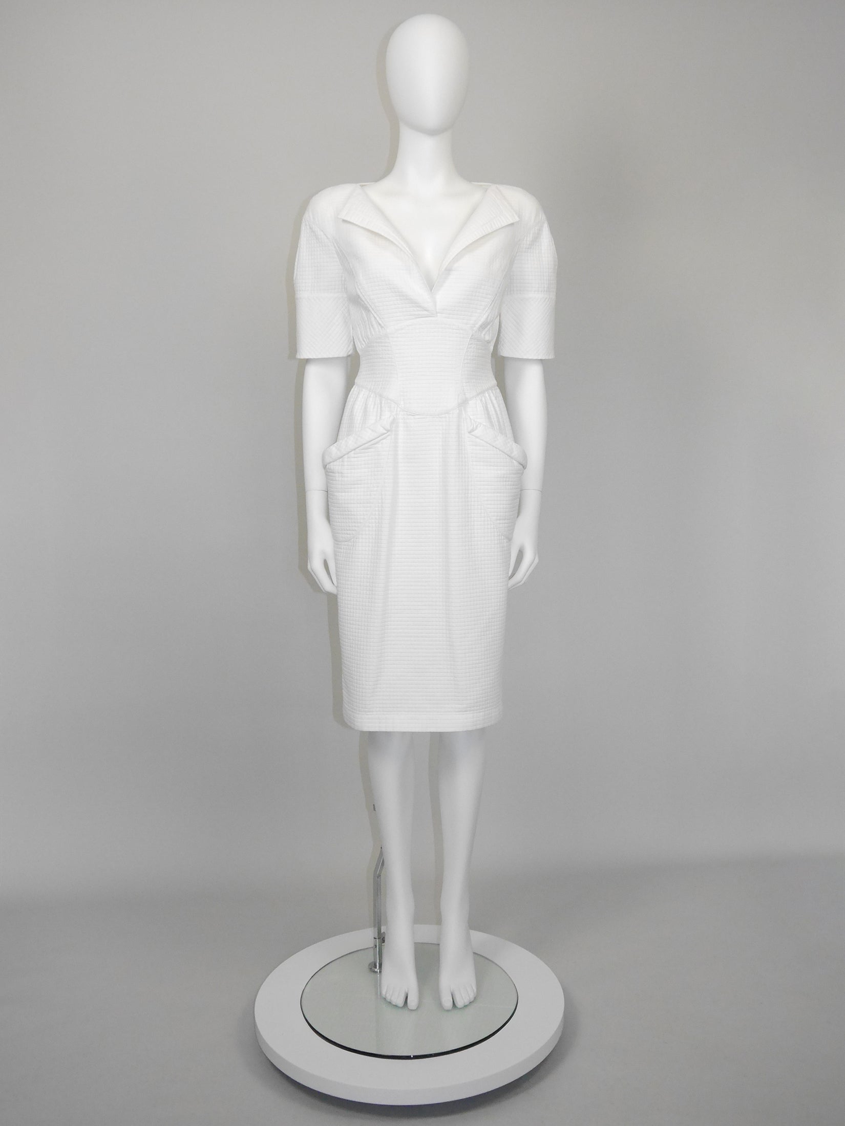 This rare and spectacular vintage dress by Thierry Mugler from the 1980s or 1990s is made from white waffle weave cotton and features an intriguing cut with oversized padded shoulders, a v-neckline, a clearly fitted waist, eye-catching pockets and a tapered skirt with a rounded hem that ends below the knee. The dress closes with a row of white press studs at the back. 100% cotton, unlined. Made in France.