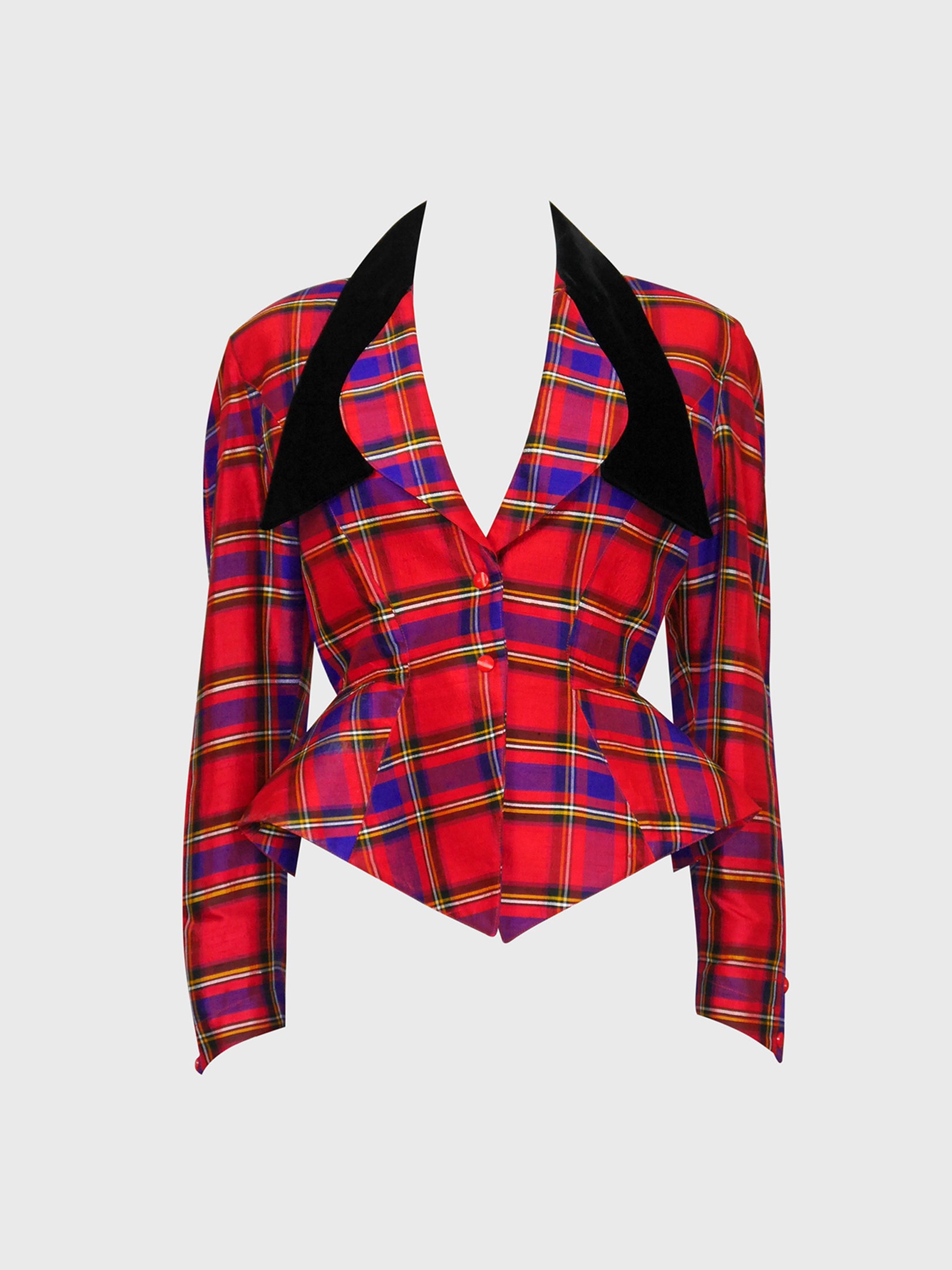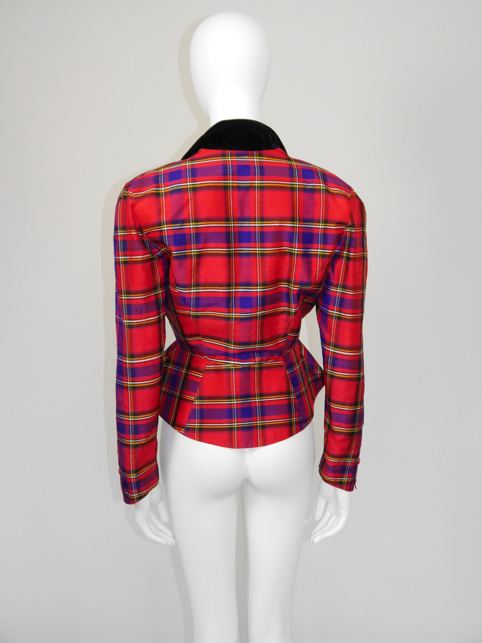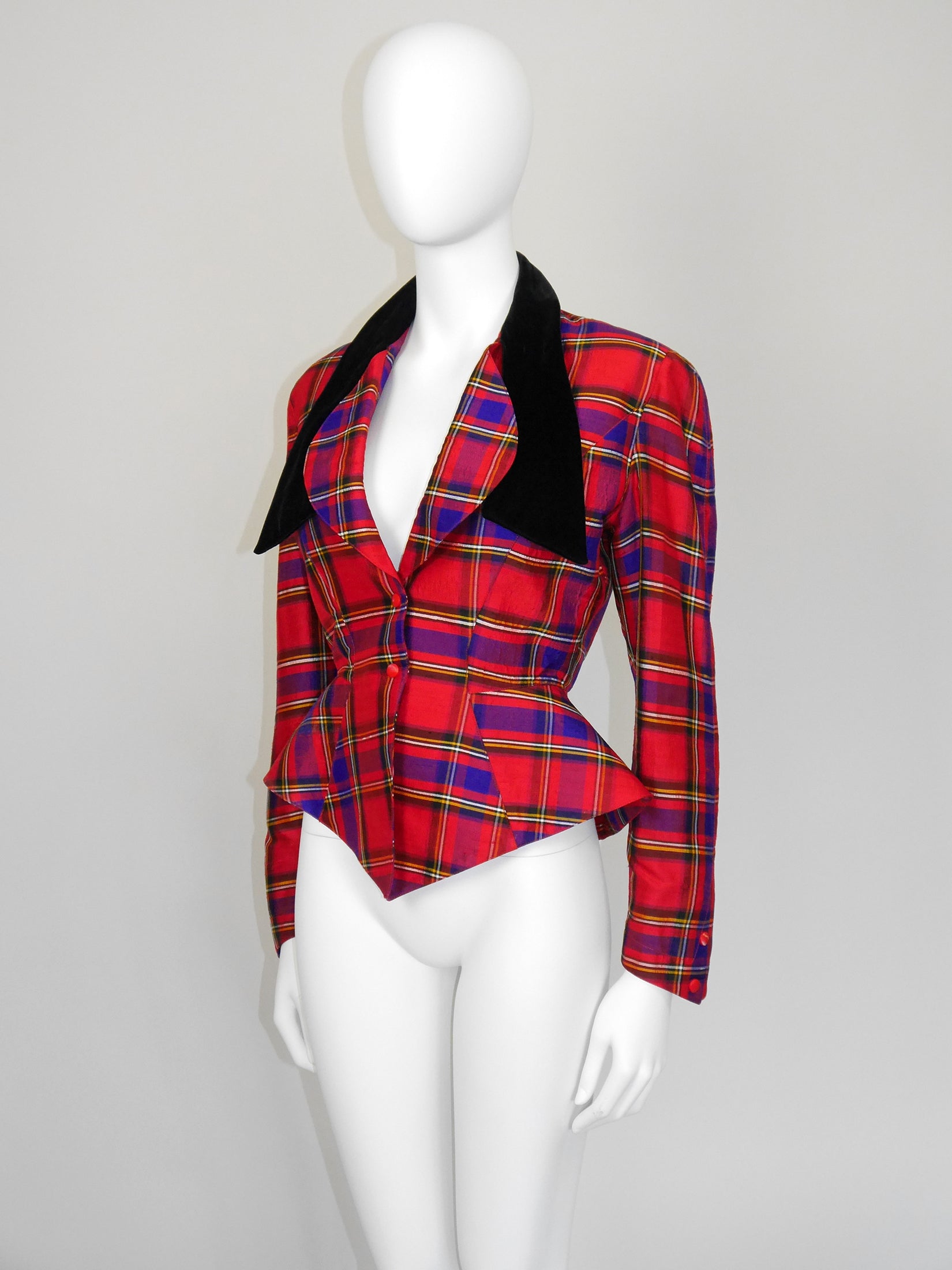This iconic vintage Thierry Mugler evening jacket from the 1990s is crafted from raw silk with a rich texture and a classic tartan pattern on a deep red background. The design features lightly padded shoulders, a black velvet collar with ties that can be worn open or fastened, and a sharply defined waist accentuated by a peplum reinforced from within to preserve its dynamic, pointed shape. The front and cuffs close with snap buttons.