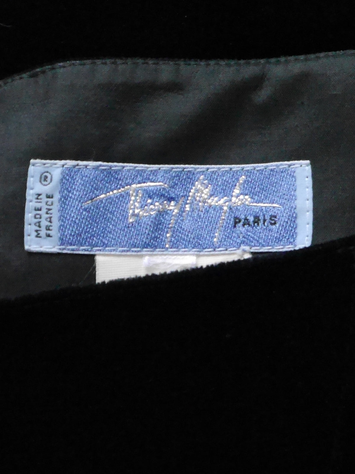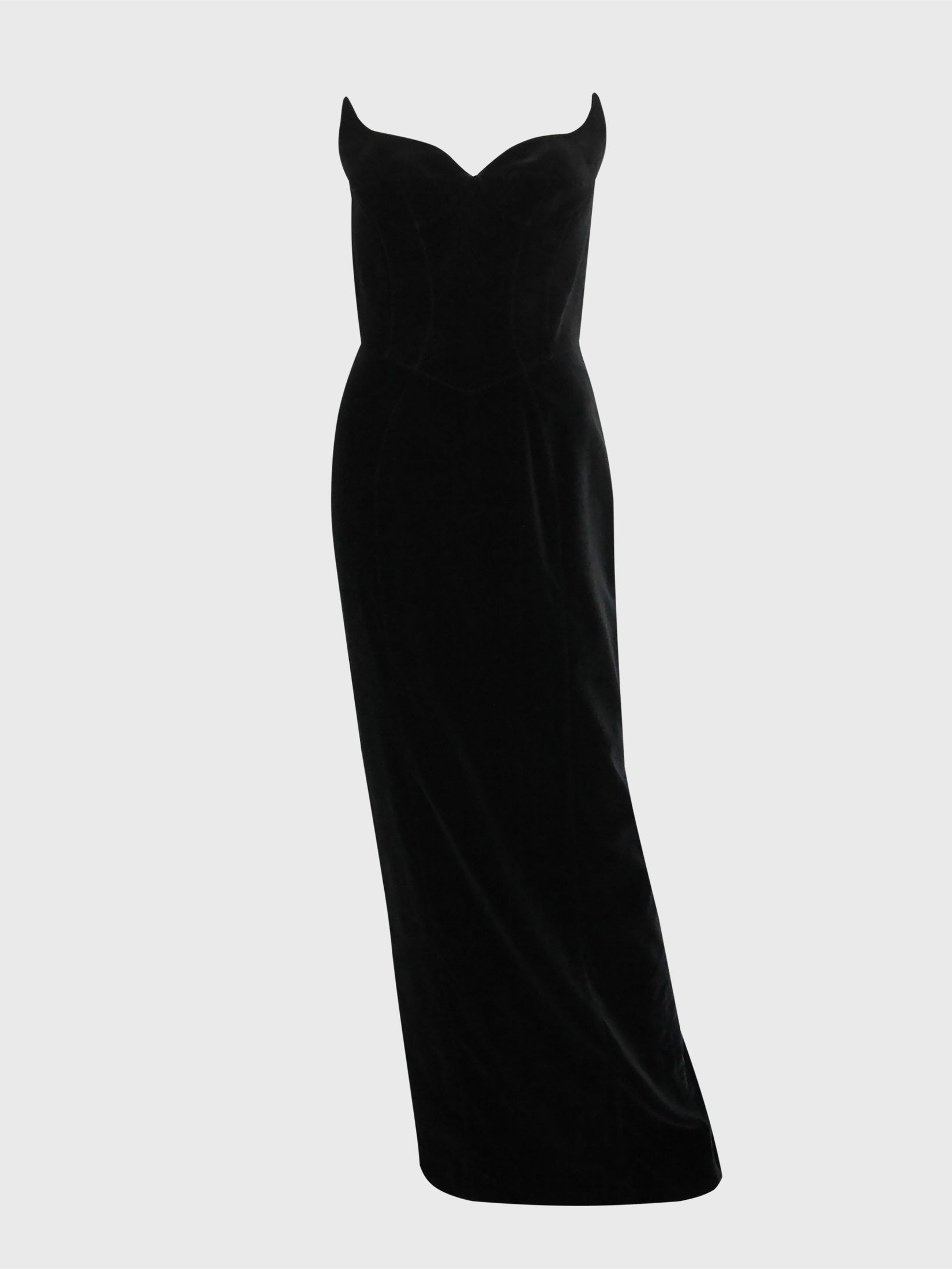 A rare Thierry Mugler evening dress from Fall 1998 - actress Kyra Sedgwick wore the twin of this dress to the 2011 SAG Awards. This dress features a boned "wing" bustier bodice and a floor-length skirt with a back slit. It is made of thick highest quality velvet in a deep black. The dress closes with a hidden back zipper plus metal hook. 100% cotton, fully lined in acetate. Made in Italy. Runway picture available upon request.