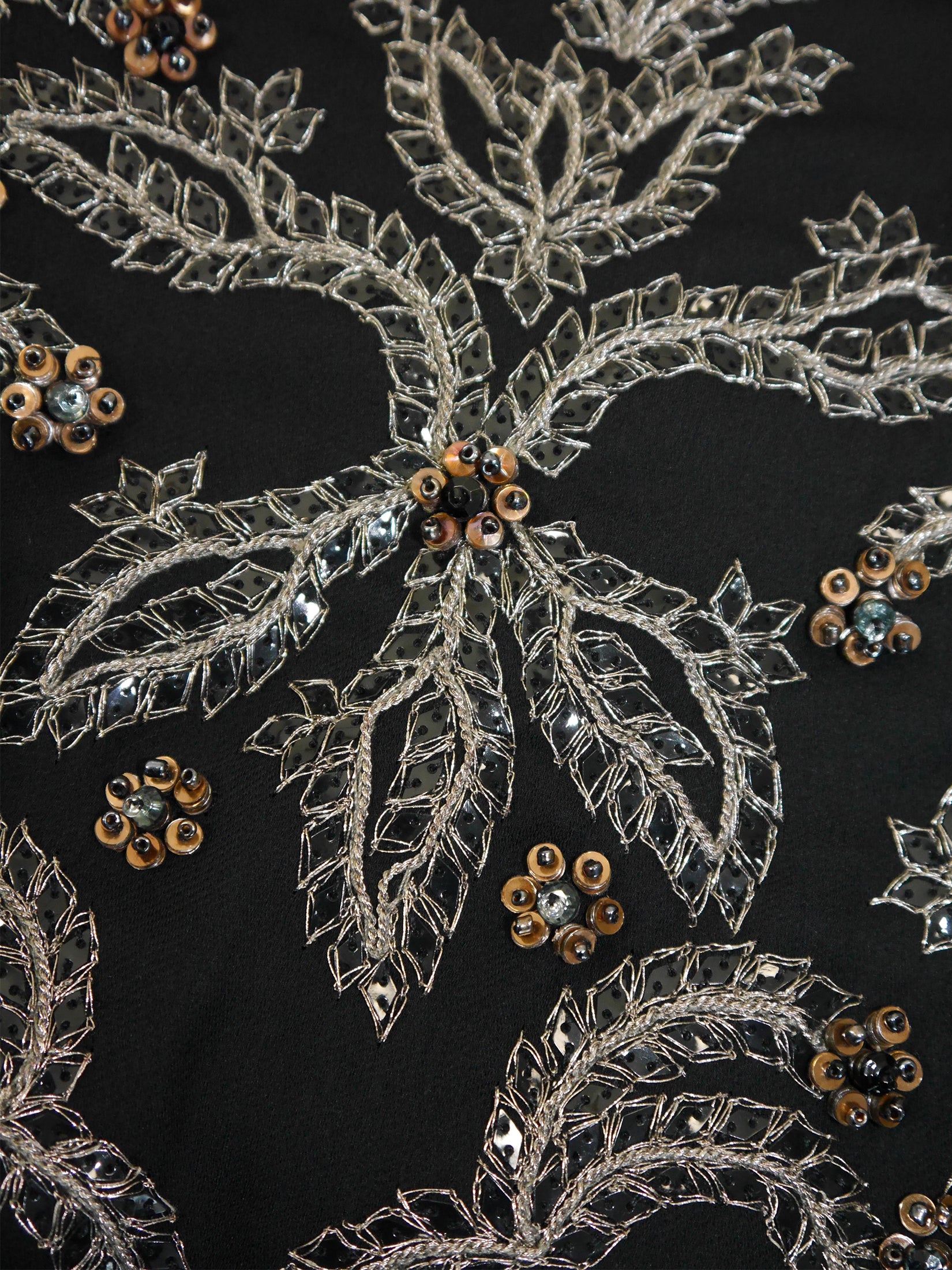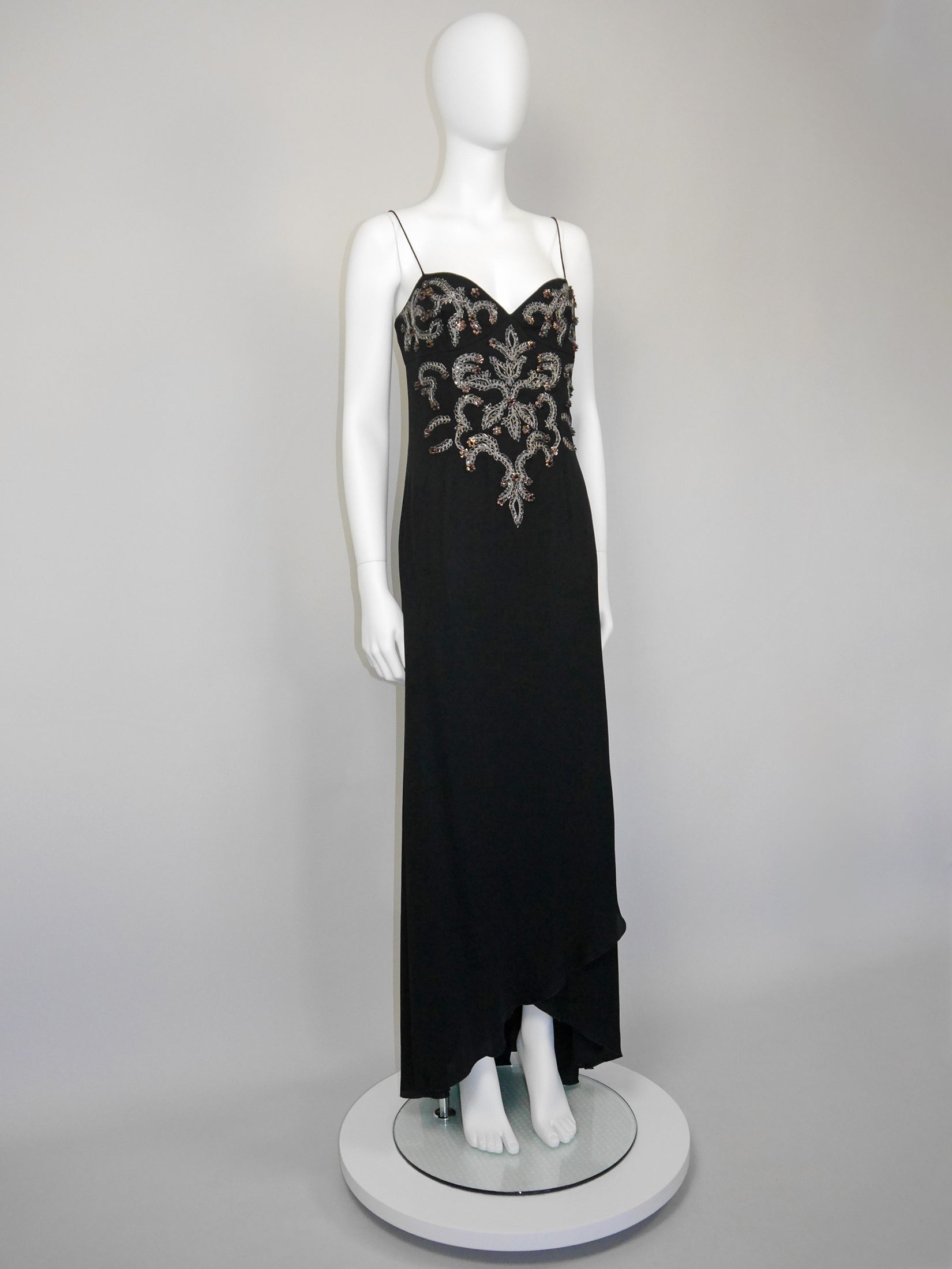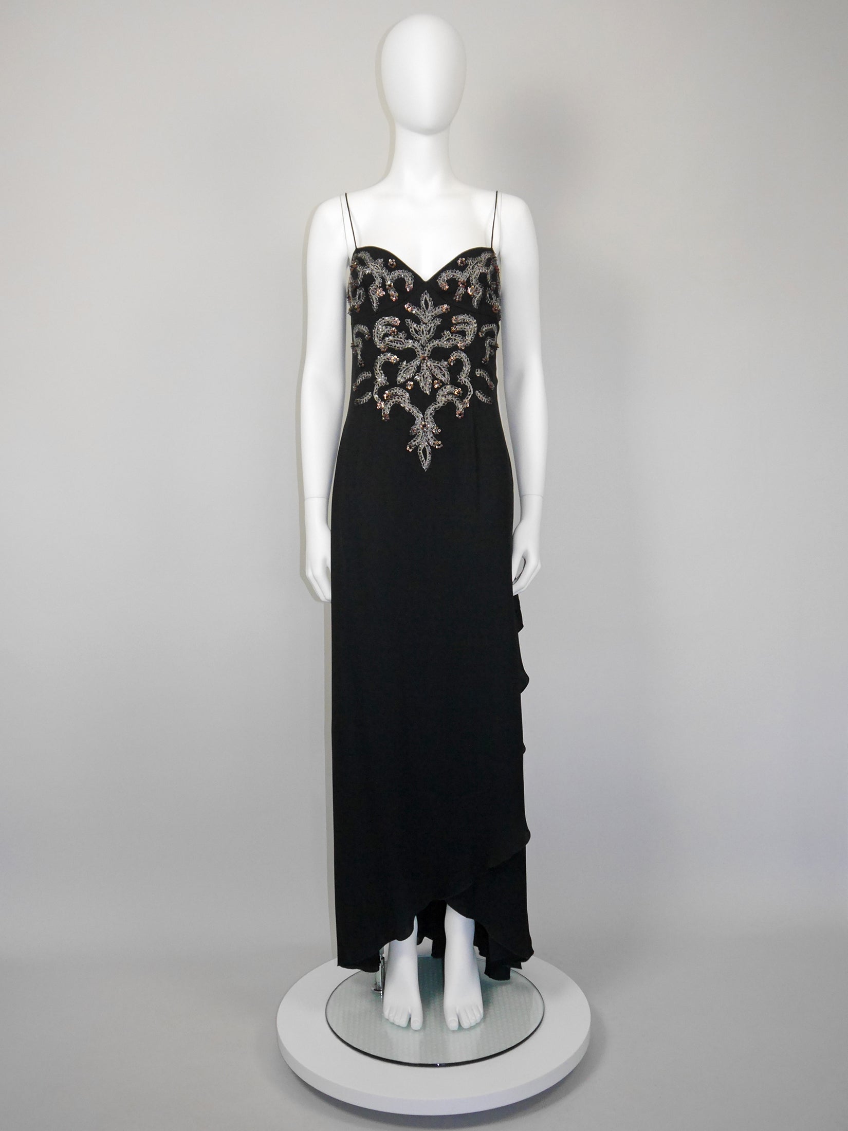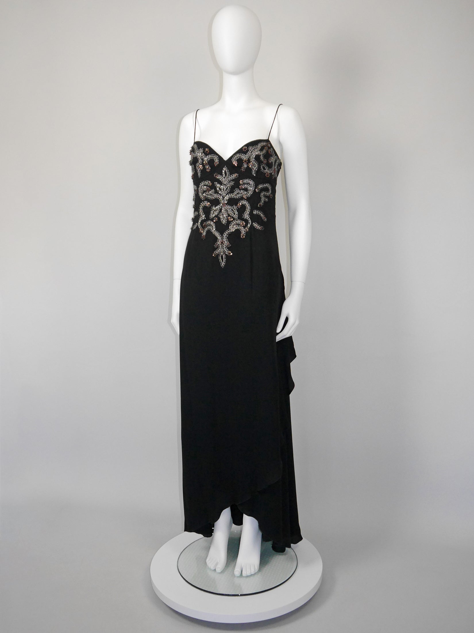 This stunning 1990s or 2000s vintage Valentino maxi evening gown is made of a smooth black acetate-silk blend with perfect drape and weight. The dress features an elegant cut with delicate shoulder straps, a lavishly embellished front (with silver embroidery and countless black and copper sequins and beads), and a cascading floor-length skirt with an asymmetrical overlay hem. Side zipper. 52% acetate, 28% polyamide, 20% silk. Lined in 100% polyester. Made in Italy.