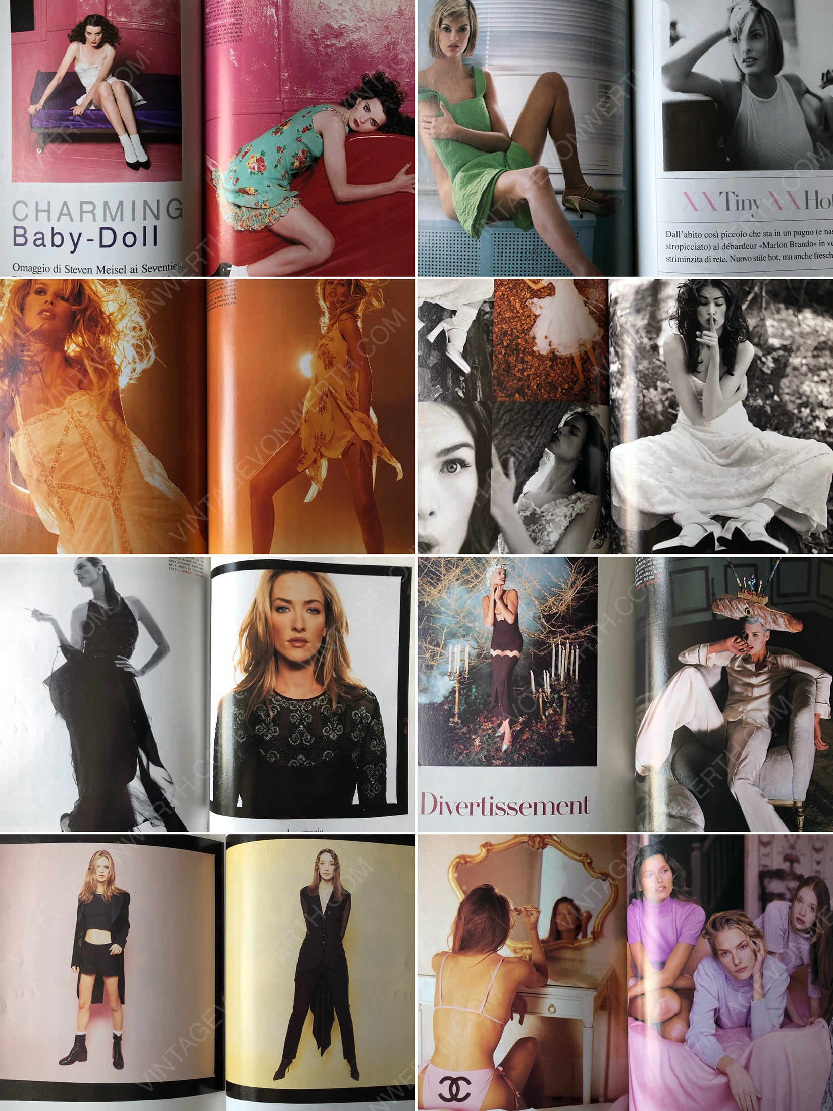 This rare and stunning February 1994 issue of Vogue Italia features an iconic Claudia Schiffer cover, amazing ads (Valentino with Christy Turlington, Giorgio Armani, Guess, Calvin Klein with Kate Moss, 4 pages Chanel by Karl Lagerfeld with Brandi Quinones, Dolce & Gabbana, Alberta Ferretti, 4 pages Prada with Christy Turlington, Karl Lagerfeld with Nadja Auermann, 4 pages Jil Sander with Amber Valletta, and many more) and iconic fashion photography by acclaimed artists such as Steven Meisel (8 pages with Michele Hicks and Trish Goff, 12 pages with Linda Evangelista, 4 pages with Claudia Schiffer), Bruce Weber (8 pages), Peggy Sirota (6 pages), Walter Chin (22 pages), Michel Comte (8 pages with Tatjana Patitz, plus another 4 pages), Francesca Sorrenti (8 pages with Marisa Berenson and Kate Moss, among others), Satoshi Saikusa, and more. 6 pages on Leonor Fini. The photos in this issue are exceptional and perfectly capture the vibe of the mid-1990s. A superb issue and a coveted collector's item.