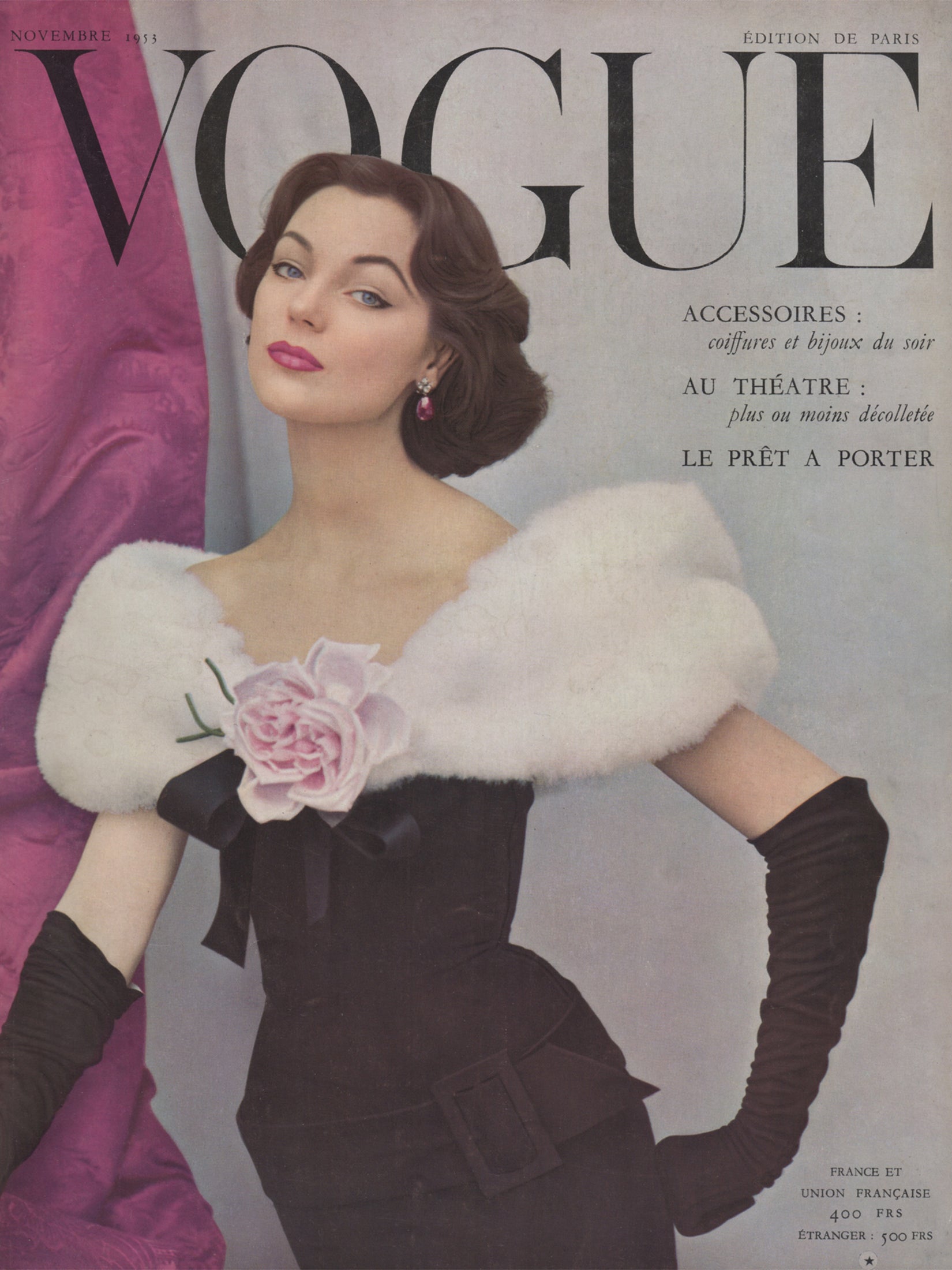 This rare and exceptional November 1953 issue of Vogue Paris features stunningly beautiful advertisements and standout fashion photography by Henry Clarke, Robert Randall, Sabine Weiss, Jacques Boucher, among others, showcasing the work of prestigious couturiers such as Christian Dior, Maggy Rouff, Lanvin-Castillo, Jacques Griffe, Manguin, Jacques Fath, Balenciaga, Jacques Heim, Givenchy, Nina Ricci, and many more. The magazine perfectly captures the spirit of the early 1950s in its pages and is a highly sought after collector's item, featuring spectacular fashion imagery.