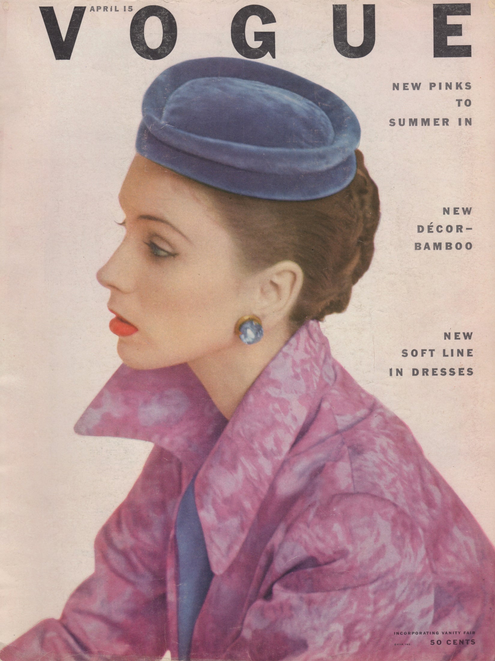 This rare US Vogue from April 15, 1952 features stunning fashion and beauty advertisements, striking illustrations, and iconic fashion and lifestyle photography by Richard Rutledge, Roger Prigent, Ernst Haas, John Rawlings, Frances McLaughlin, Randall, and Clifford Coffin, showcasing beautiful models, illustrious society figures, and the work of prestigious couturiers. Morocco special with photos by Irving Penn.