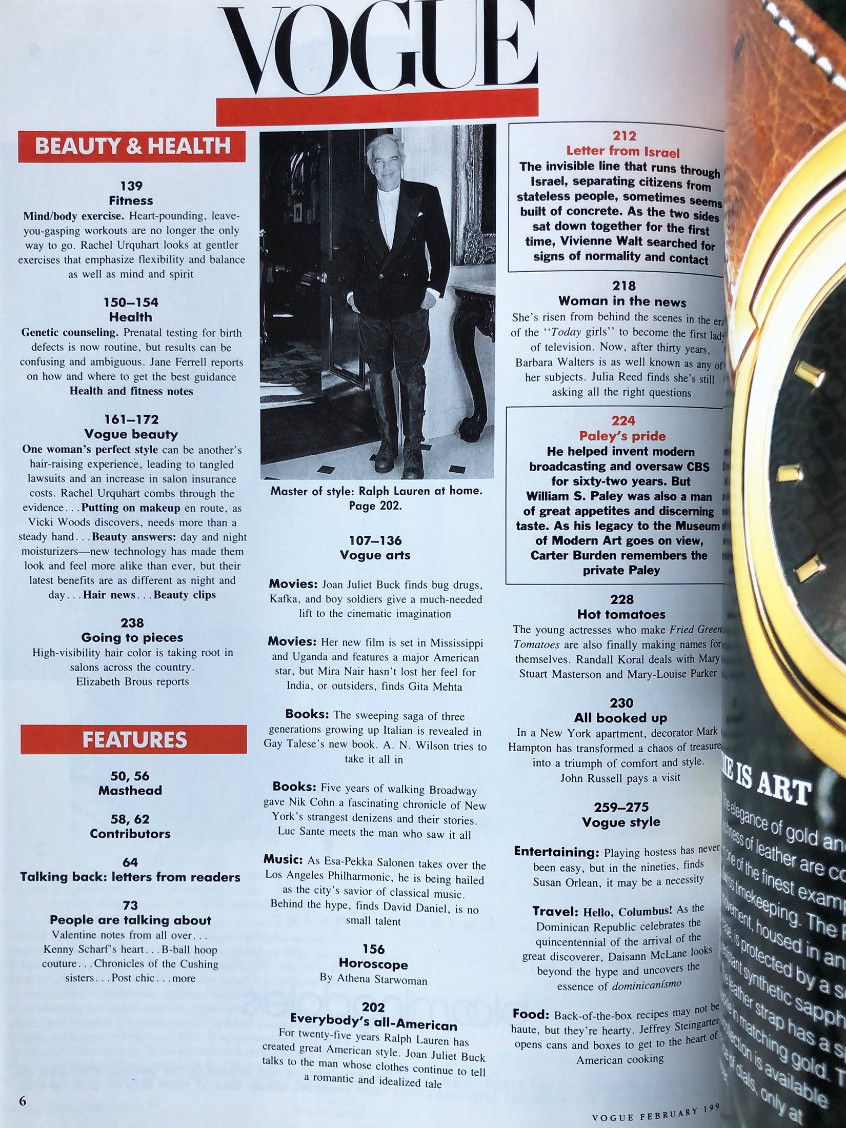 Highlights include a 3-page feature on Anna Sui, 10 pages on Ralph Lauren (photography by Patrick Demarchelier), and 4 pages on William S. Paley.
