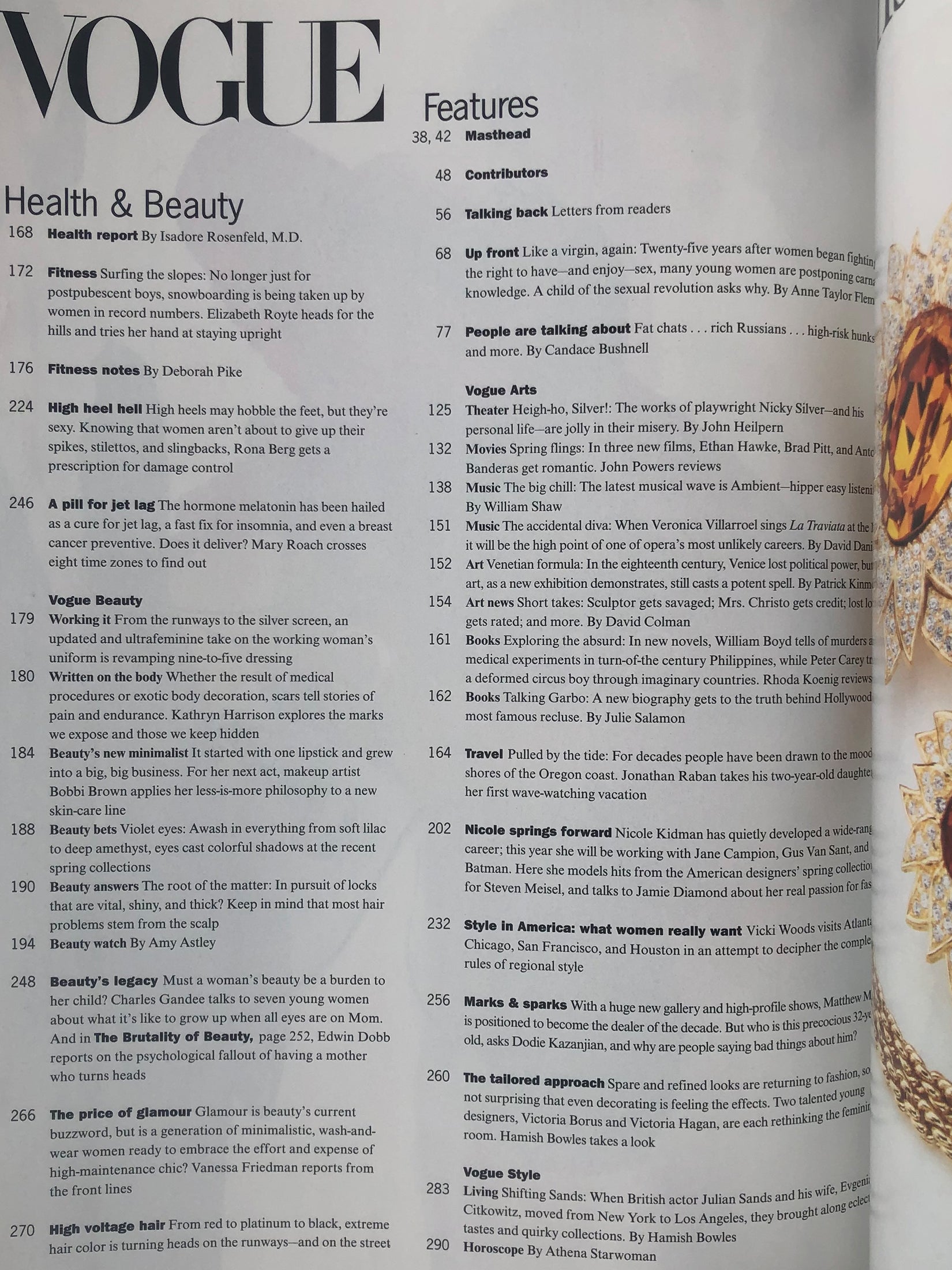 Additional features include a 2-page spotlight on Isabel Toledo, one page on Bobbi Brown, an 8-page feature on designer Richard Tyler (including 2 pages fashion modeled by Nadja Auermann, shot by Juergen Teller), and a 6-page homestory on Victoria Borus and Victoria Hagan with photos by Eric Boman.