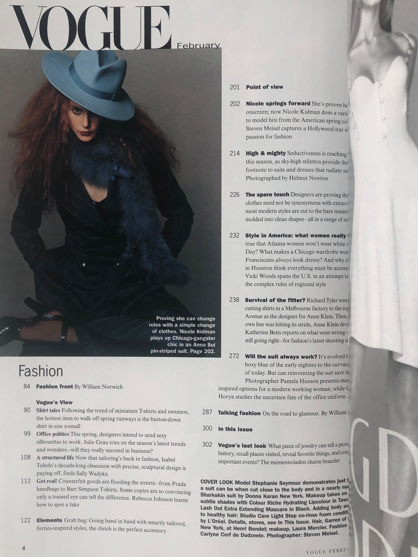 The issue showcases exceptional photography by renowned artists, including Steven Meisel (12 spectacular pages with Nicole Kidman), Helmut Newton ("High & Mighty" - 10 groundbreaking pages with Nadja Auermann), Juergen Teller (6 pages with Stephanie Seymour), and Pamela Hanson (7 pages with Tatjana Patitz and another model).