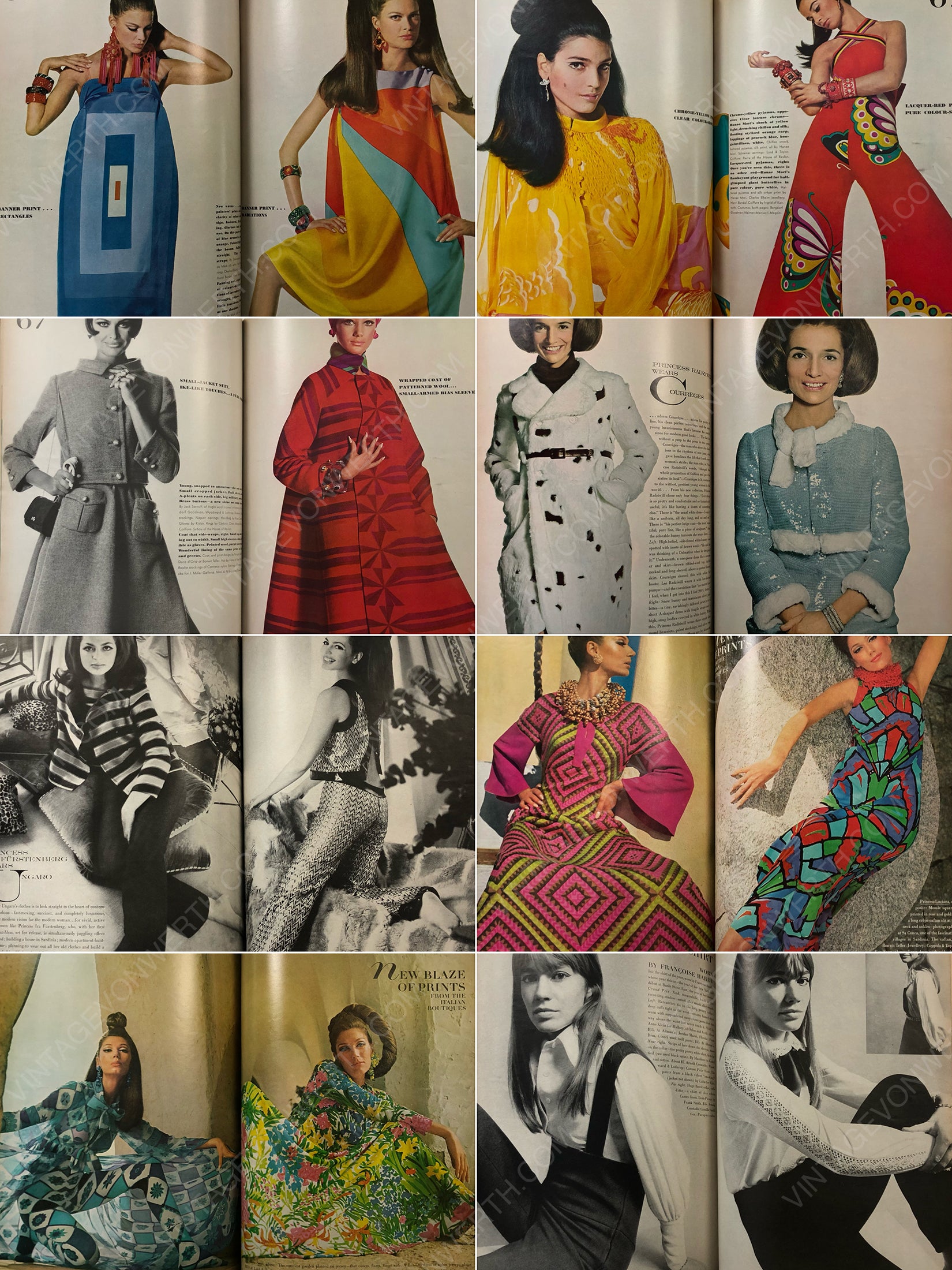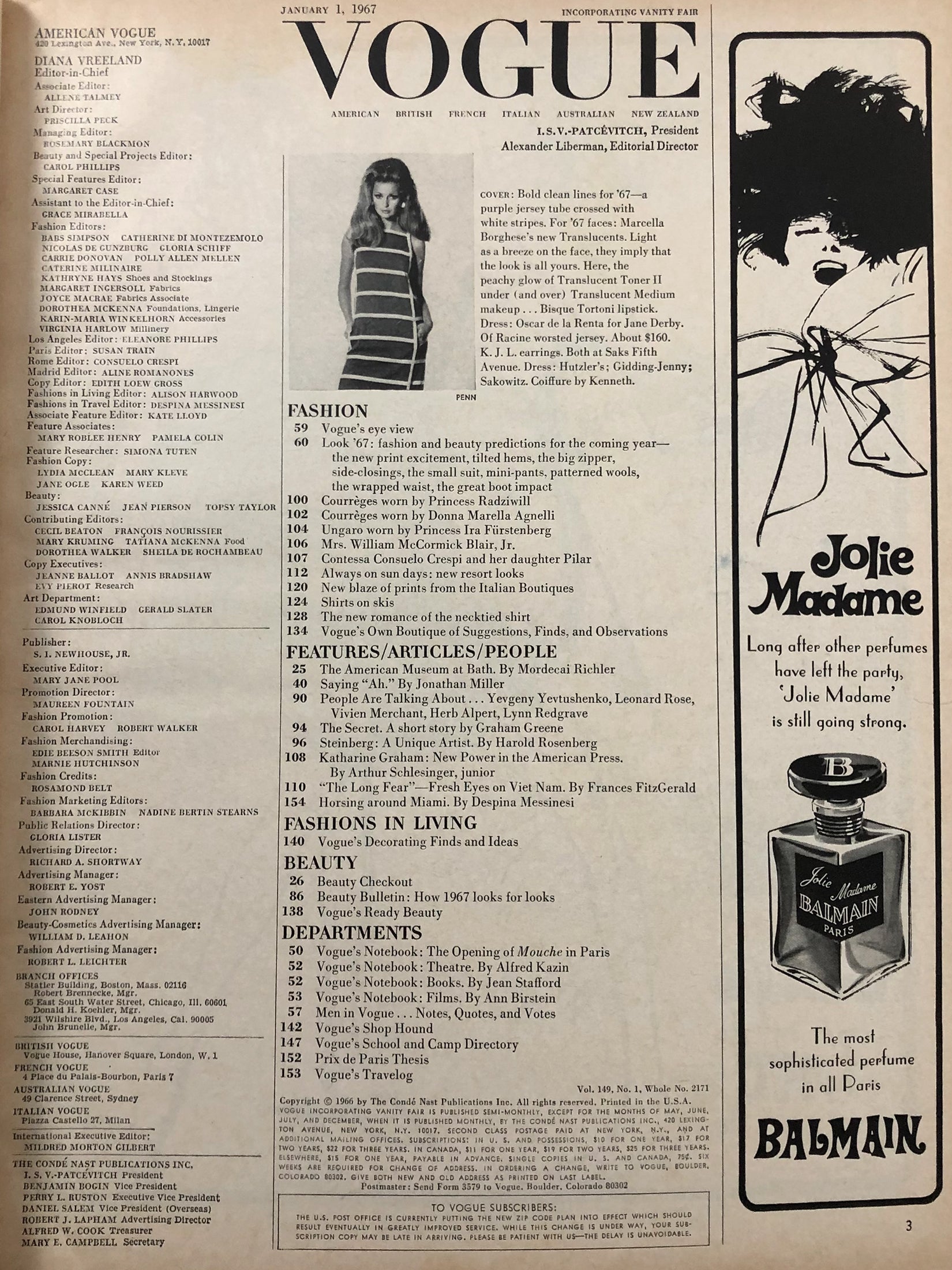 A rare and beautiful New Year's issue with fashion and beauty predictions for 1967 and iconic fashion and lifestyle photography by Richard Avedon, Irving Penn, Cecil Beaton, Henry Clarke (2 pages of Donna Marella Agnelli in Courrèges, 2 pages of Princess Ira Fürstenberg in Ungaro), Bert Stern, Franco Rubartelli and more. Models include Veruschka, Lauren Hutton, Benedetta Barzini, Marisa Berenson, among others. 2 pages of Lee Radziwill in Courrèges, photographed by Penn. 2 pages with Françoise Hardy.