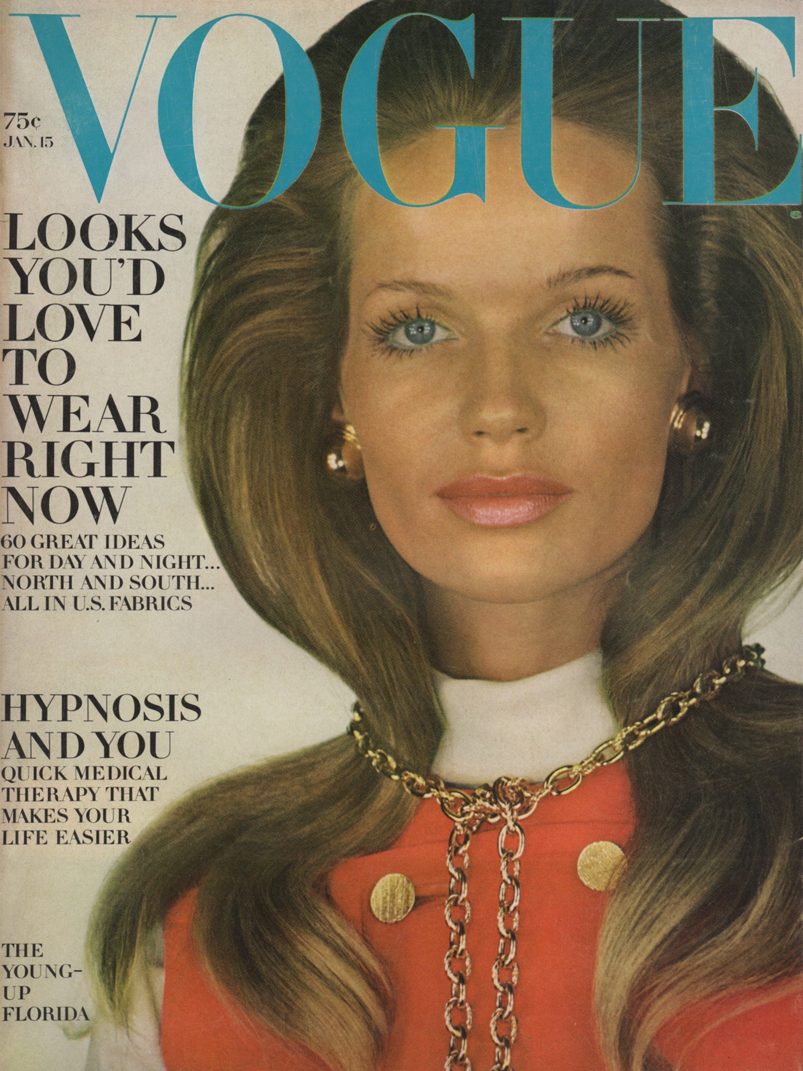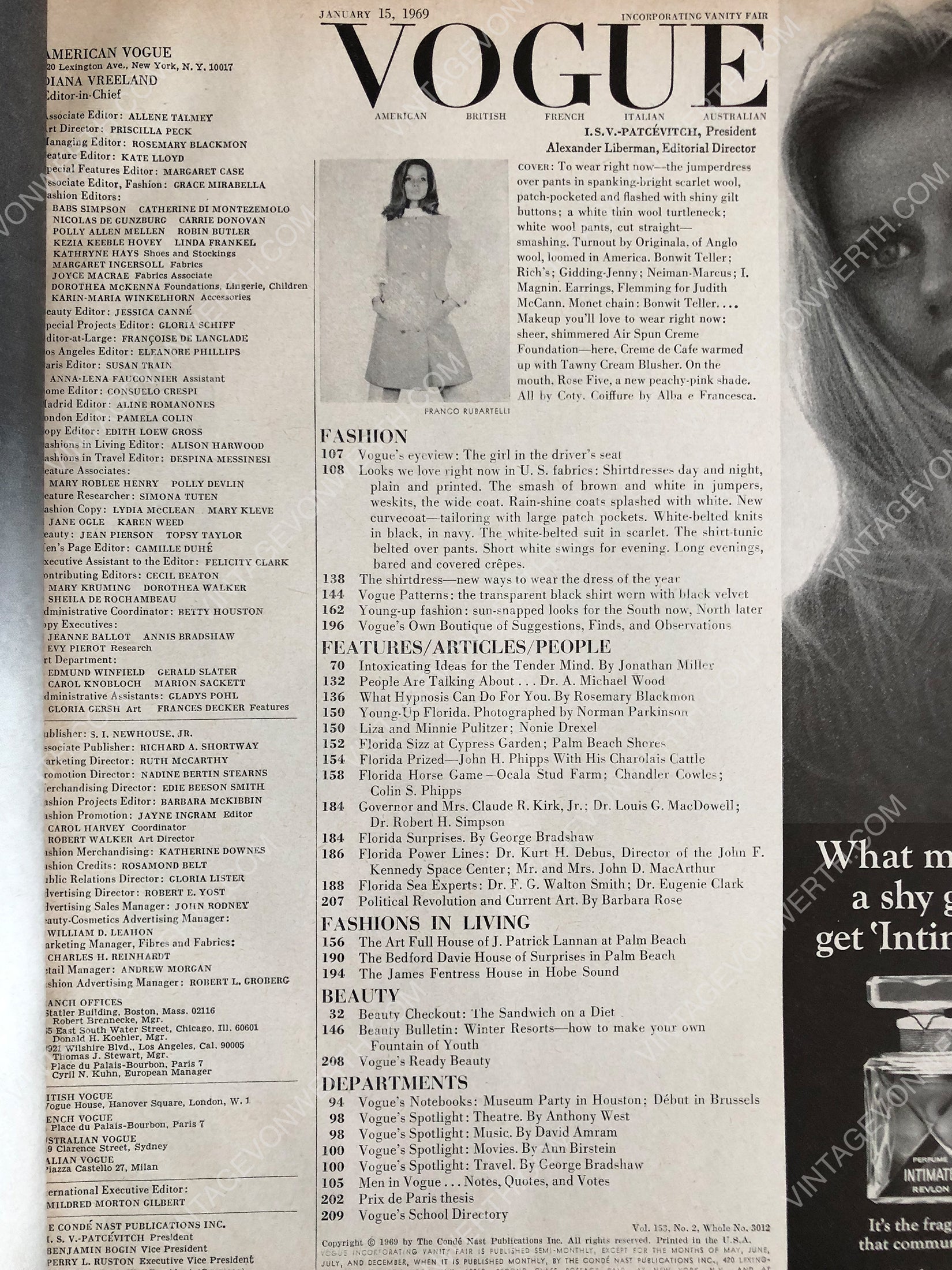 This rare and wonderful Vogue US issue from January 15, 1969 features iconic fashion and lifestyle photography by Bert Stern (18 pages with Birgitta af Klercker and Ann Turkel, among others), Alexis Waldeck (4 pages evening wear with Ann Turkel), Franco Rubartelli (8 pages with Veruschka), Norman Parkinson (34 pages fashion and travel plus 6 pages home stories), Patrick Lichfield, and more. The photos in this issue are exceptional and perfectly capture the vibe of the late 1960s. A superb edition and a coveted collector's item.