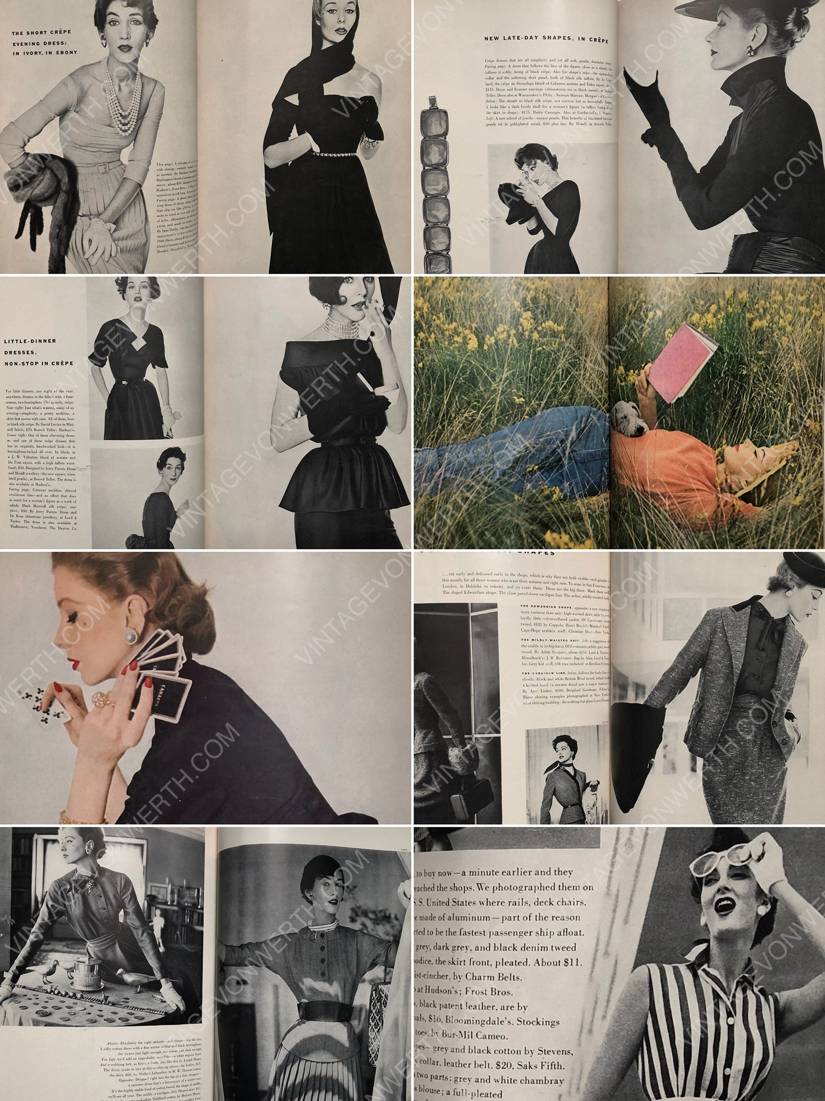 A beautiful summer issue stunningly beautiful advertisements, magnificent fashion illustrations and iconic fashion and lifestyle photography by Irving Penn, Erwin Blumenfeld, Clifford Coffin, Horst P. Horst, Richard Rutledge, Ted Croner, and more. A mix of black-and-white and brilliantly coloured pages, beautiful paper quality. From the first to the last page, this issue is a visual feast, a testimony of its time and highly collectible.