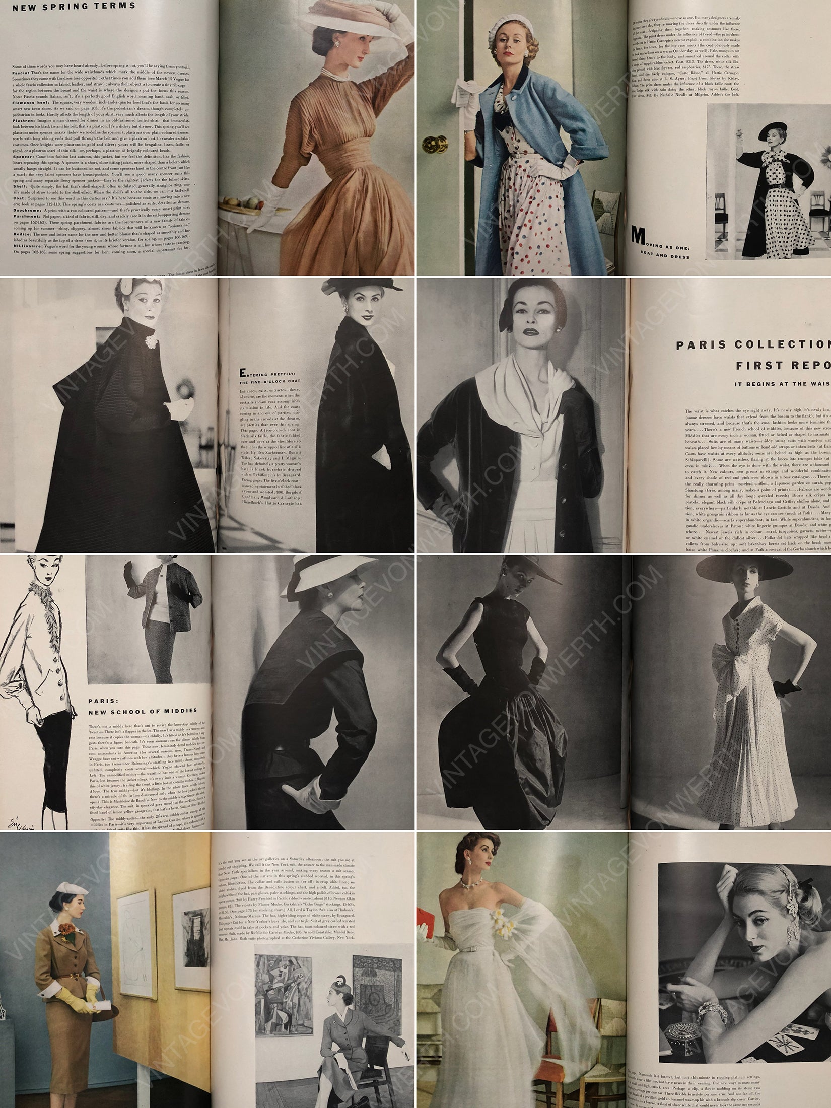 This rare US Vogue from March 1, 1952 features stunning fashion and beauty advertisements, striking illustrations, and iconic fashion and lifestyle photography by Richard Rutledge, Frances McLaughlin, Horst P. Horst, Henry Clarke, John Rawlings, and Roger Prigent, showcasing beautiful models, illustrious society figures, and the work of prestigious couturiers. Among the highlights of this issue is the Paris collections report, spanning 16 pages and featuring designs by Christian Dior, Givenchy, Madeleine de Rauch, Lanvin-Castillo, Balenciaga, Jacques Griffe, Jean Patou, Jacques Fath, and Jean Dessès.