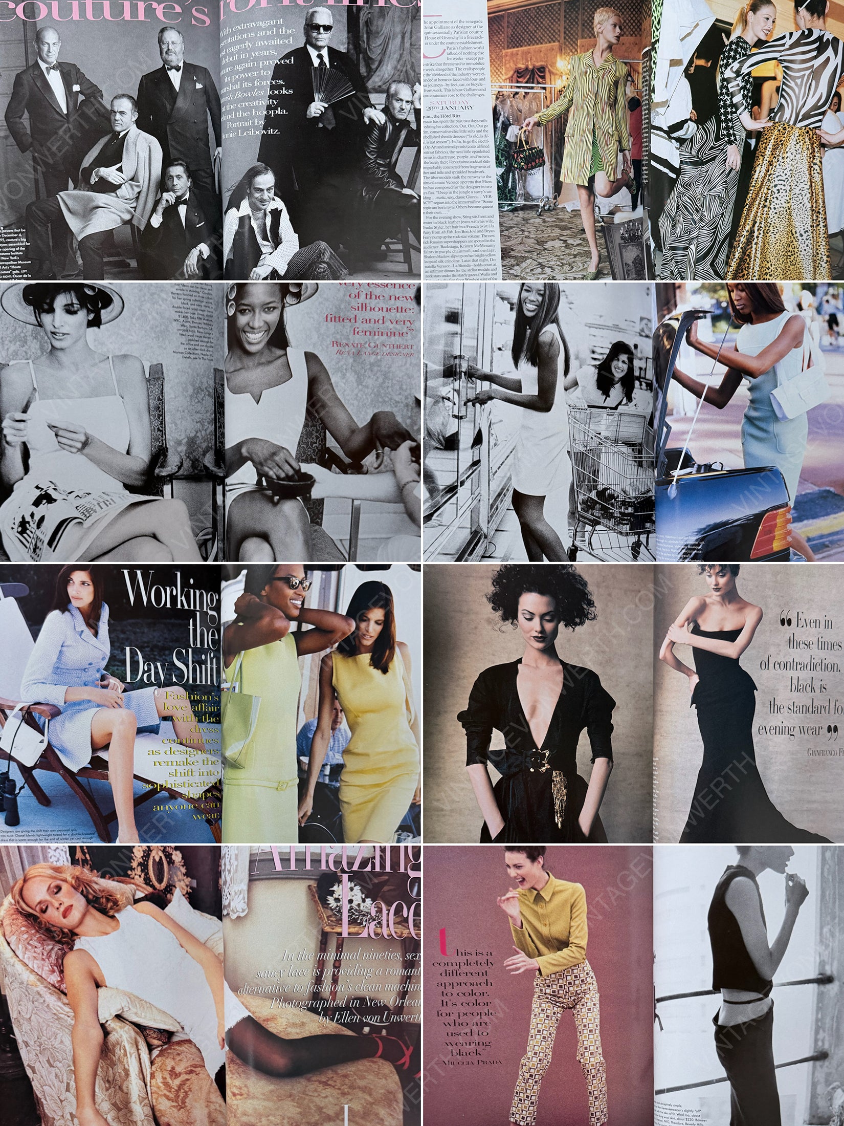 It features an amazing Claudia Schiffer cover and striking camapigns from all major fashion houses, including Calvin Klein with Christy Turlington, Escada with Paulina Porizkova, Céline with Karen Mulder, Bill Blass with Chrystèle Saint Louis Augustin, Gucci by Tom Ford (8 pages), Gianni Versace with Amber Valletta (6 pages), Chanel, Alberta Ferretti with Amber Valletta and Shalom Harlow, Herve Leger with Sibyl Buck, Fendi, Kenzo, Moschino, Dolce & Gabbana, Chloé with Linda Evangelista, and Jil Sander, among many others.