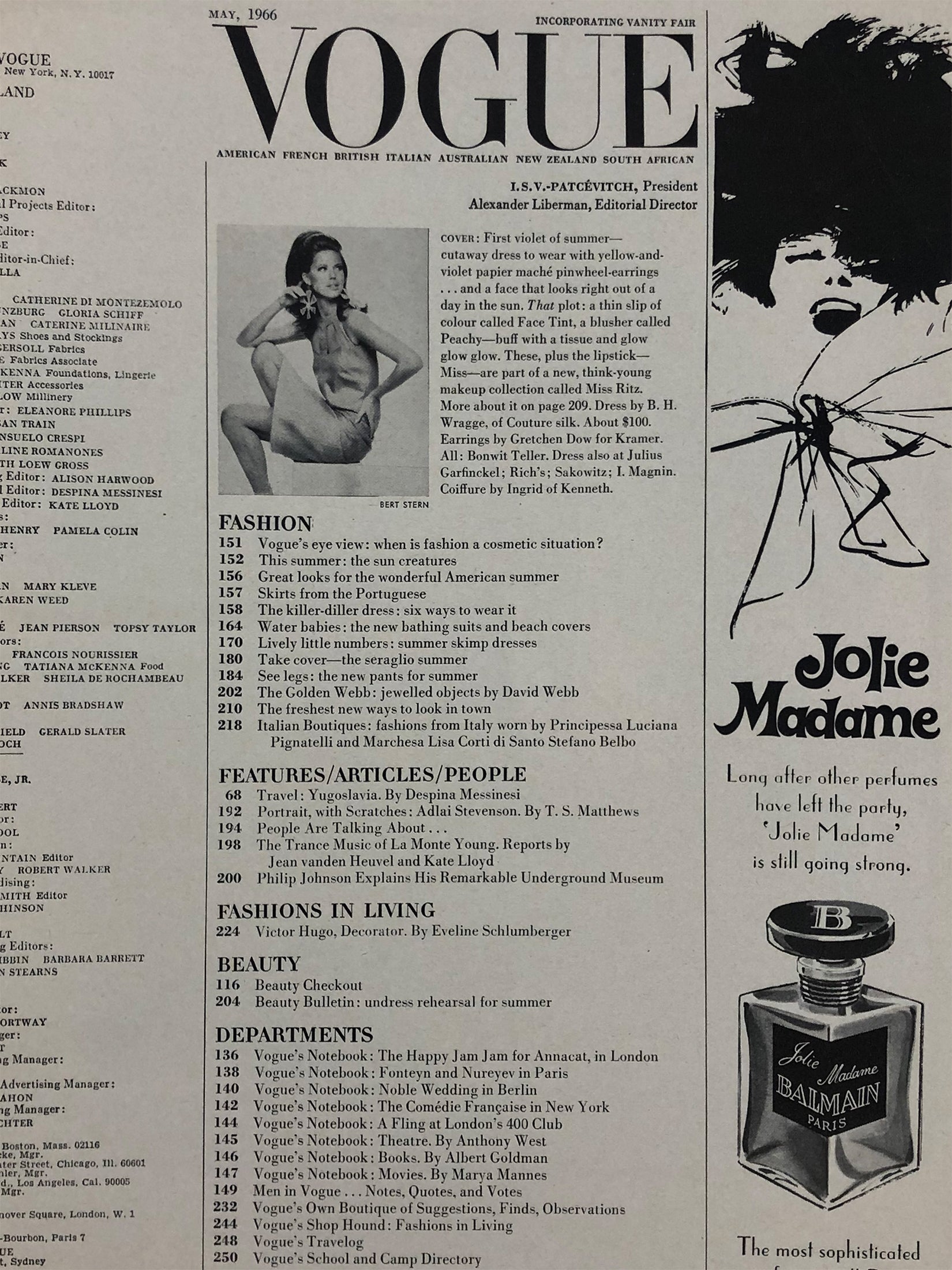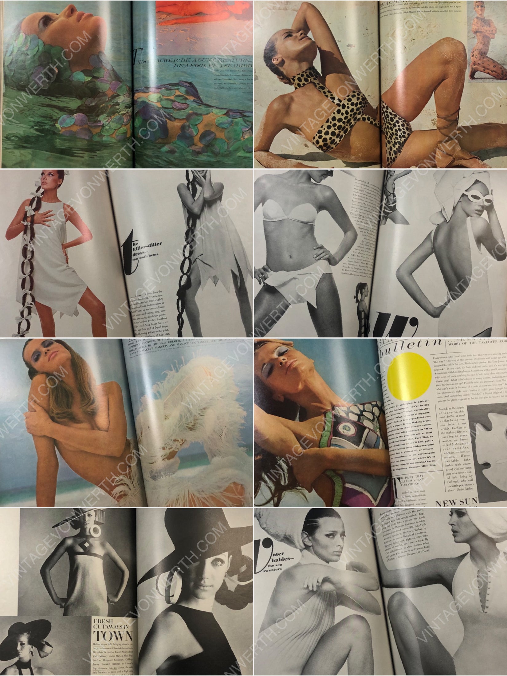 This 250+ pages strong May 1966 edition of Vogue US is a rare and exceptional Spring issue with iconic fashion and lifestyle photography by Franco Rubartelli (8 spectacular pages with Veruschka), Bert Stern (36 pages of summer fashions and beach wear with Birgitta af Klercker, Marisa Berenson and others), Tad Wakamatsu, Irving Penn (8 pages with Veruschka, Marisa Berenson and others), Henry Clarke, and Guy Bourdin, among others.