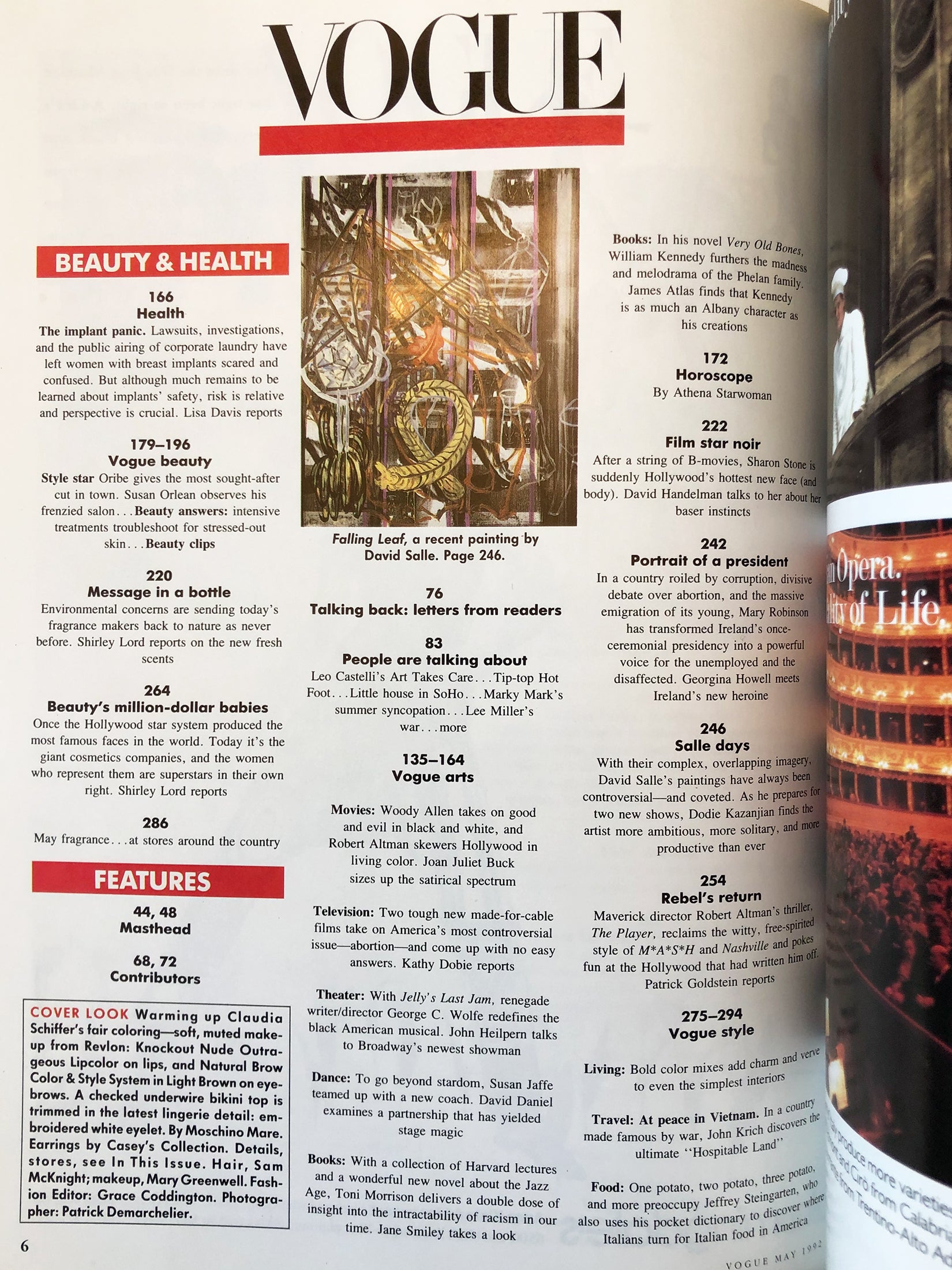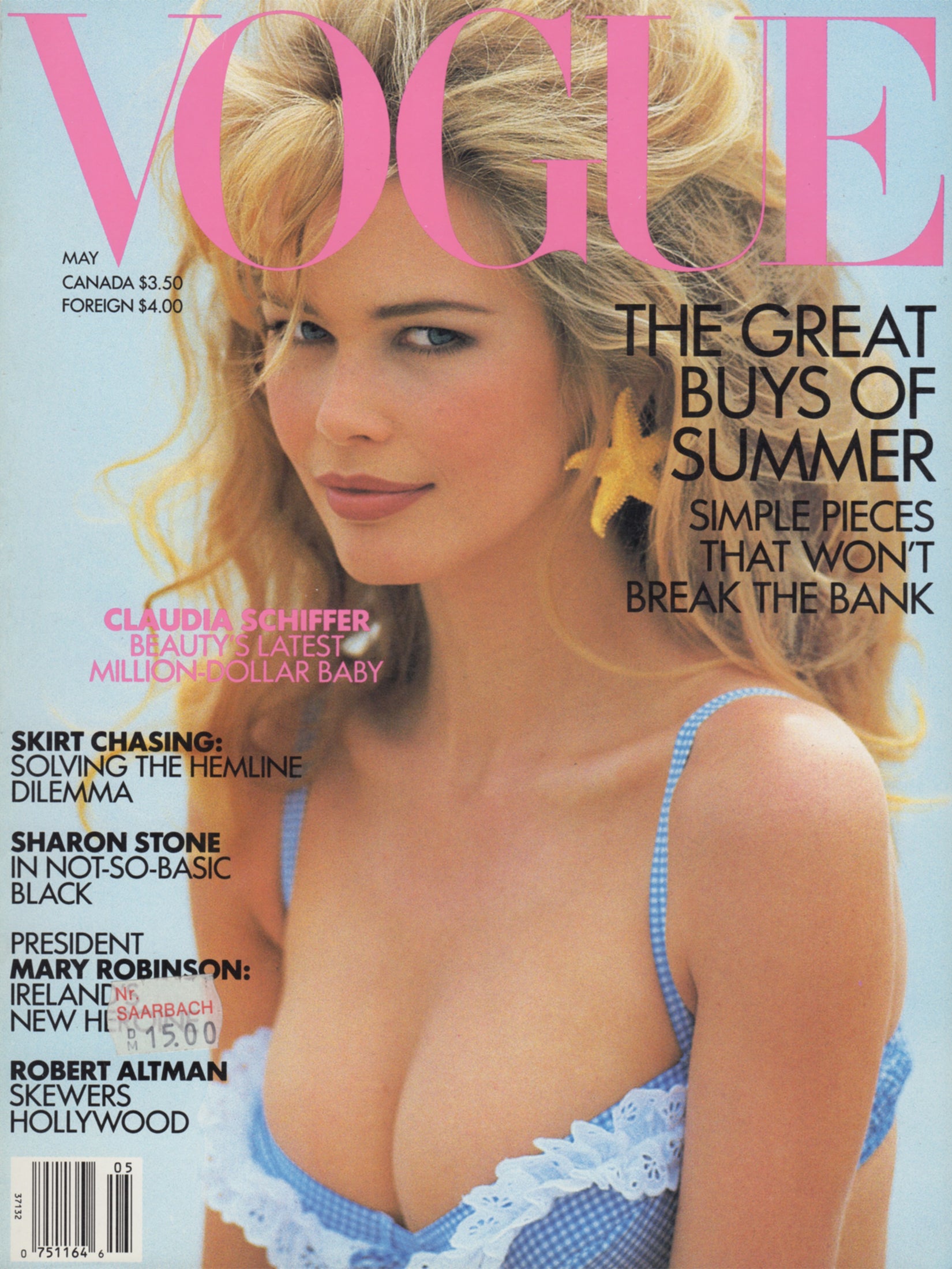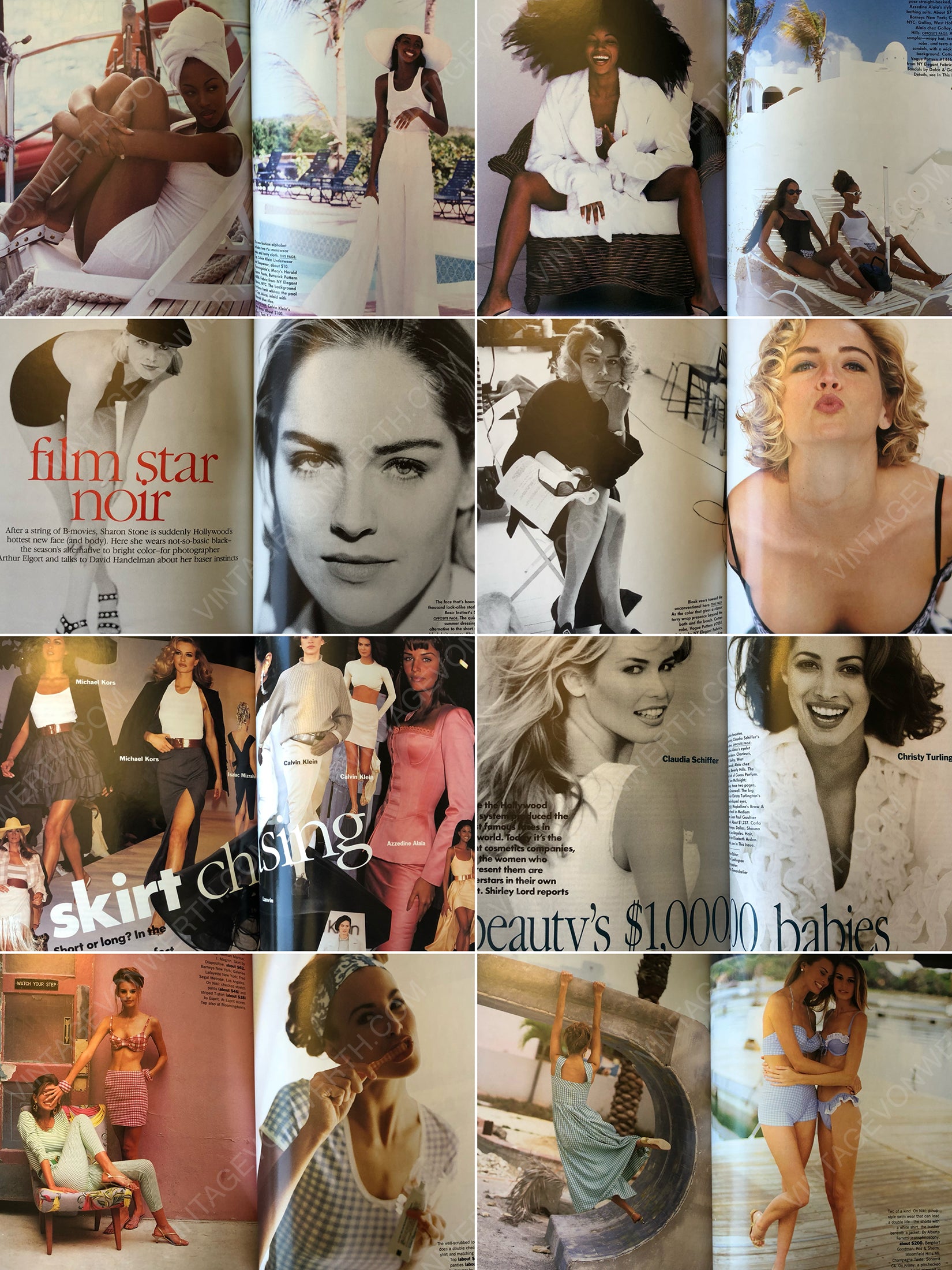 This rare and exceptional May 1992 issue of Vogue US is a treasure trove of high fashion and lifestyle, bursting with stunning shots of all the original supermodels. It features an amazing Claudia Schiffer cover, stunning advertisements from iconic brands (Guess with Claudia Schiffer, Gianni Versace with Helena Christensen, and many more), along with superb fashion and lifestyle photography by acclaimed artists, including Patrick Demarchelier (21 pages with Naomi Campbell, Tyra Banks, and Beverly Peele), Arthur Elgort (9 pages with Sharon Stone), Ferdinando Scianna (10 pages with Magali Amadei), Dewey Nicks (6 pages with Niki and Krissy Taylor), and others.
