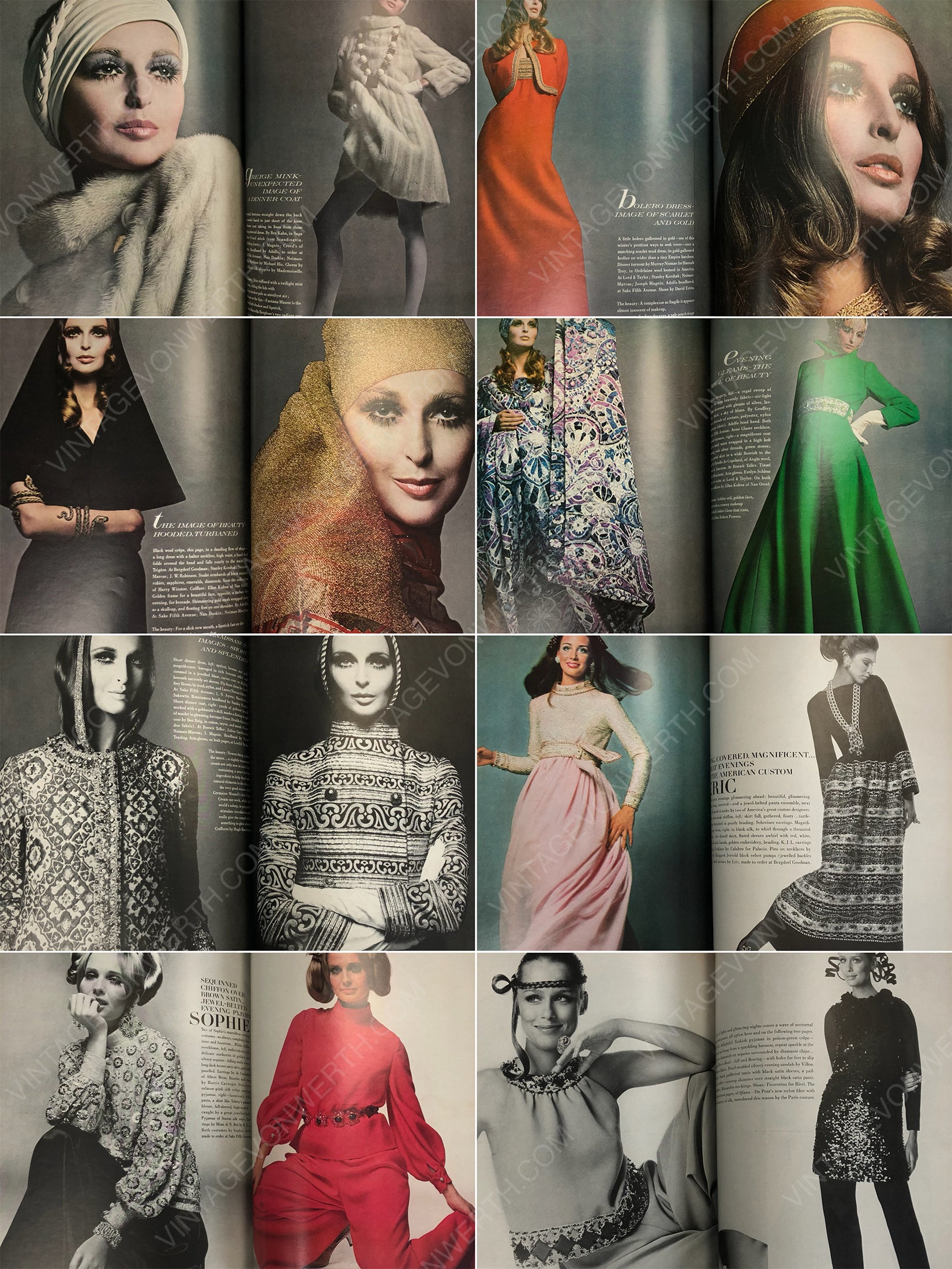 A beautiful fall issue with a strong advertisement section and iconic fashion and lifestyle photography by Arnaud de Rosnay (portrait of Anjelica Huston with her mother Ricki), Franco Rubartelli (portrait of Veruschka with her three sisters), Richard Avedon (20 iconic pages with Samantha Jones), Bert Stern (6 pages on Norman Norell and more), Irving Penn, Henry Clarke, Alexis Waldeck, Gianni Penati, Gene Laurents, Horst (Hélène Rochas in her Paris office) and more. Models include Marisa Berenson, Lauren Hutton, Windsor Elliott and more.