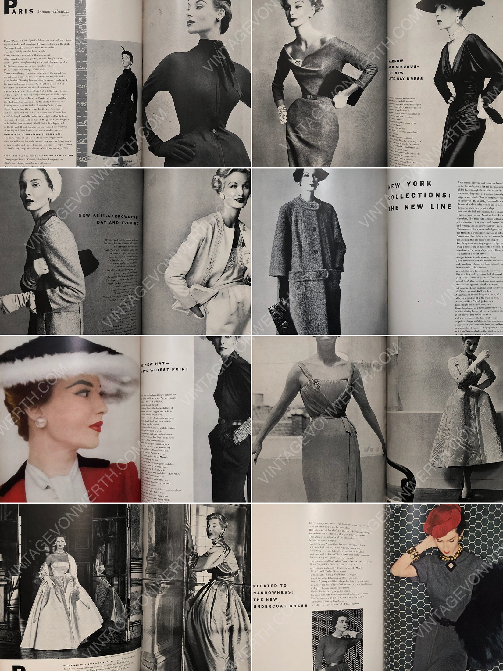 Among the highlights of this issue is the Paris collections report, spanning 22 pages and featuring designs by Christian Dior, Balenciaga, Lanvin-Castillo, Jacques Fath, Grès, Jean Dessès, Givenchy, Schiaparelli, and Madeleine de Rauch.