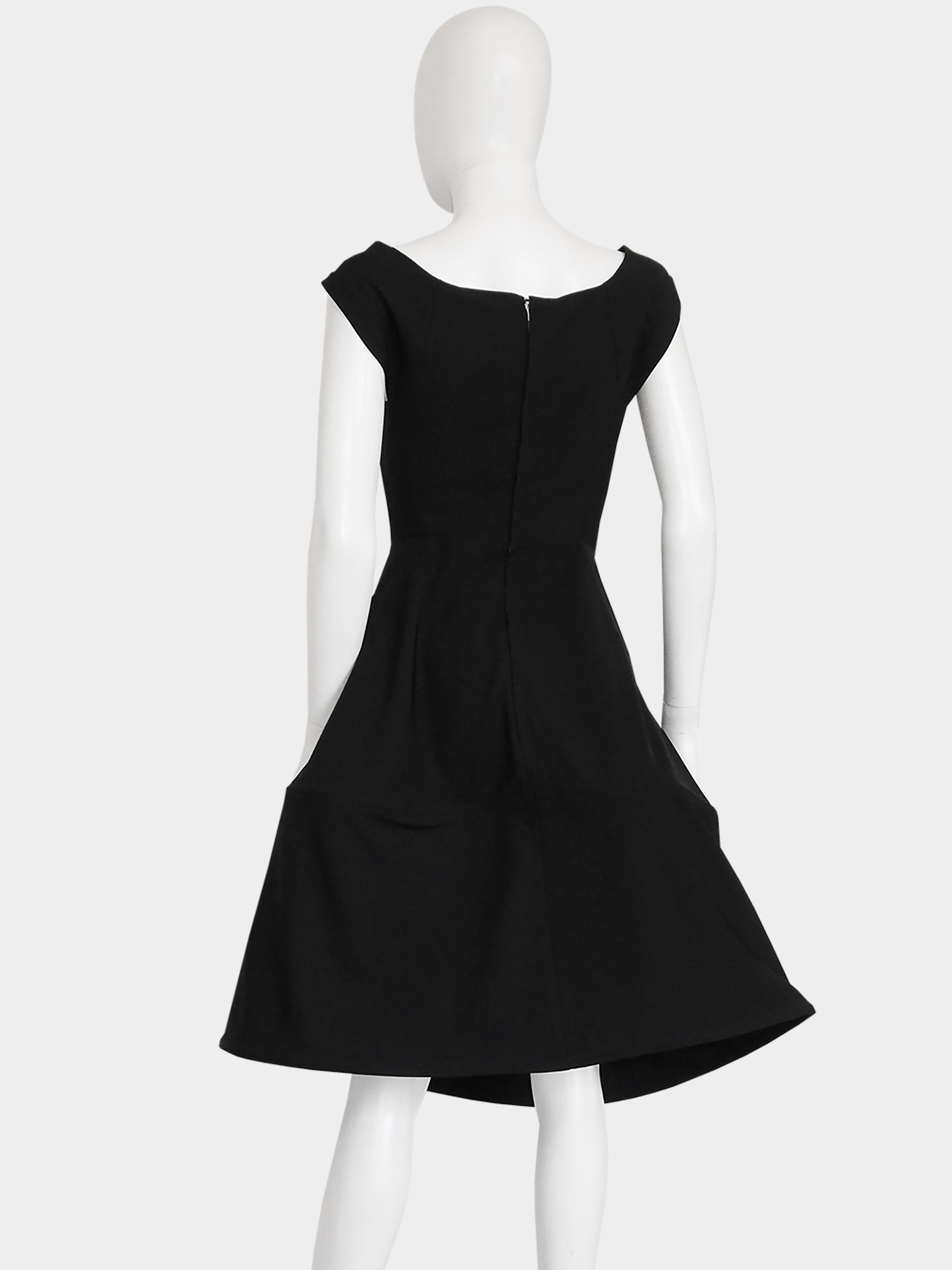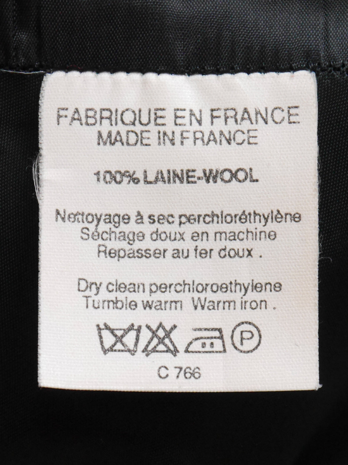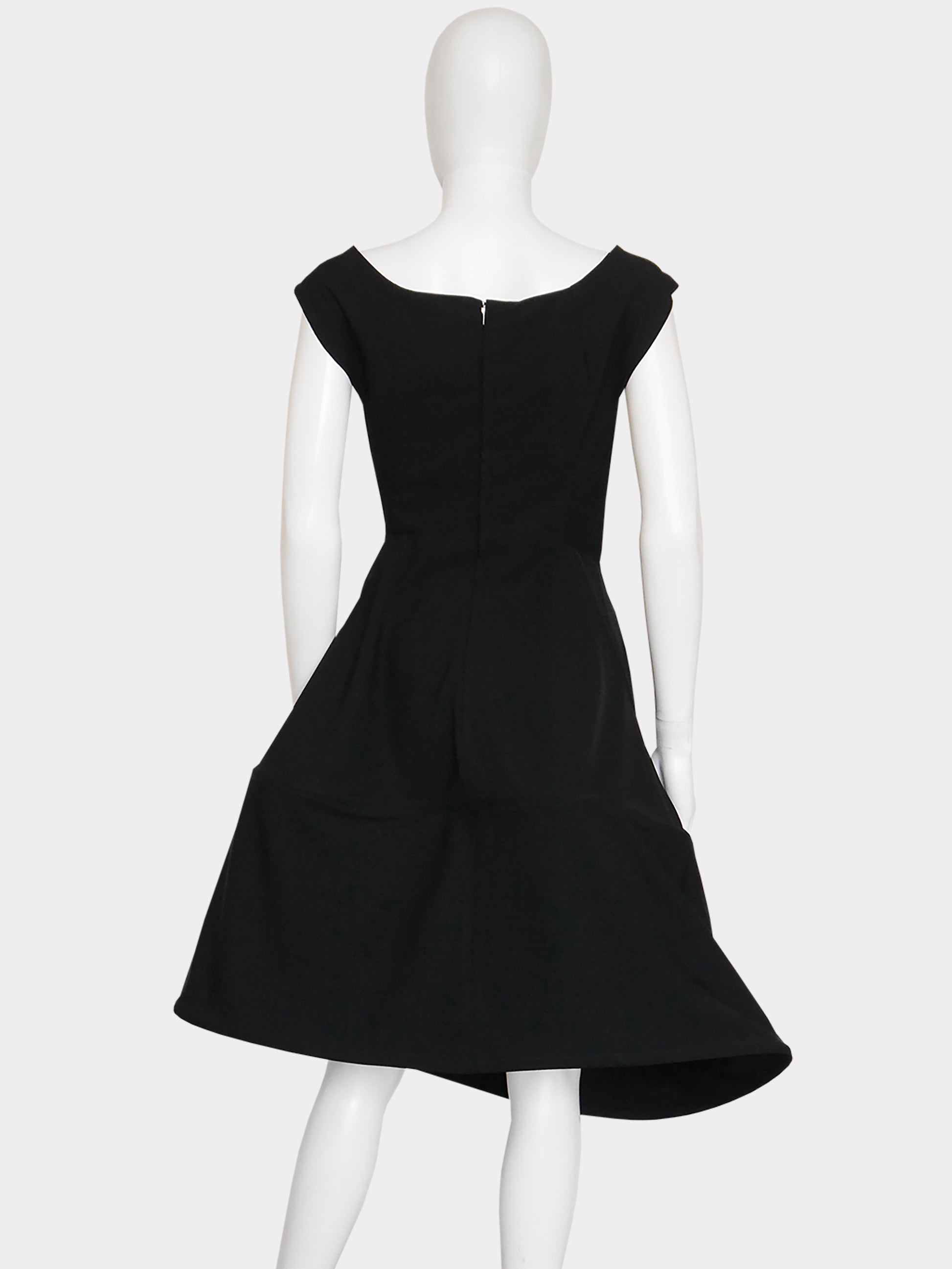 The dress is crafted from a fine and lightweight black wool fabric and features a slim-fitting bodice and an incredible asymmetrical skirt with four integrated hoops that create a very unique three-dimensional and somewhat distorted shape. The dress closes with a concealed silver-tone metal zipper and a metal hook & eye at the back. 100% wool, silky black lining. Made in France.