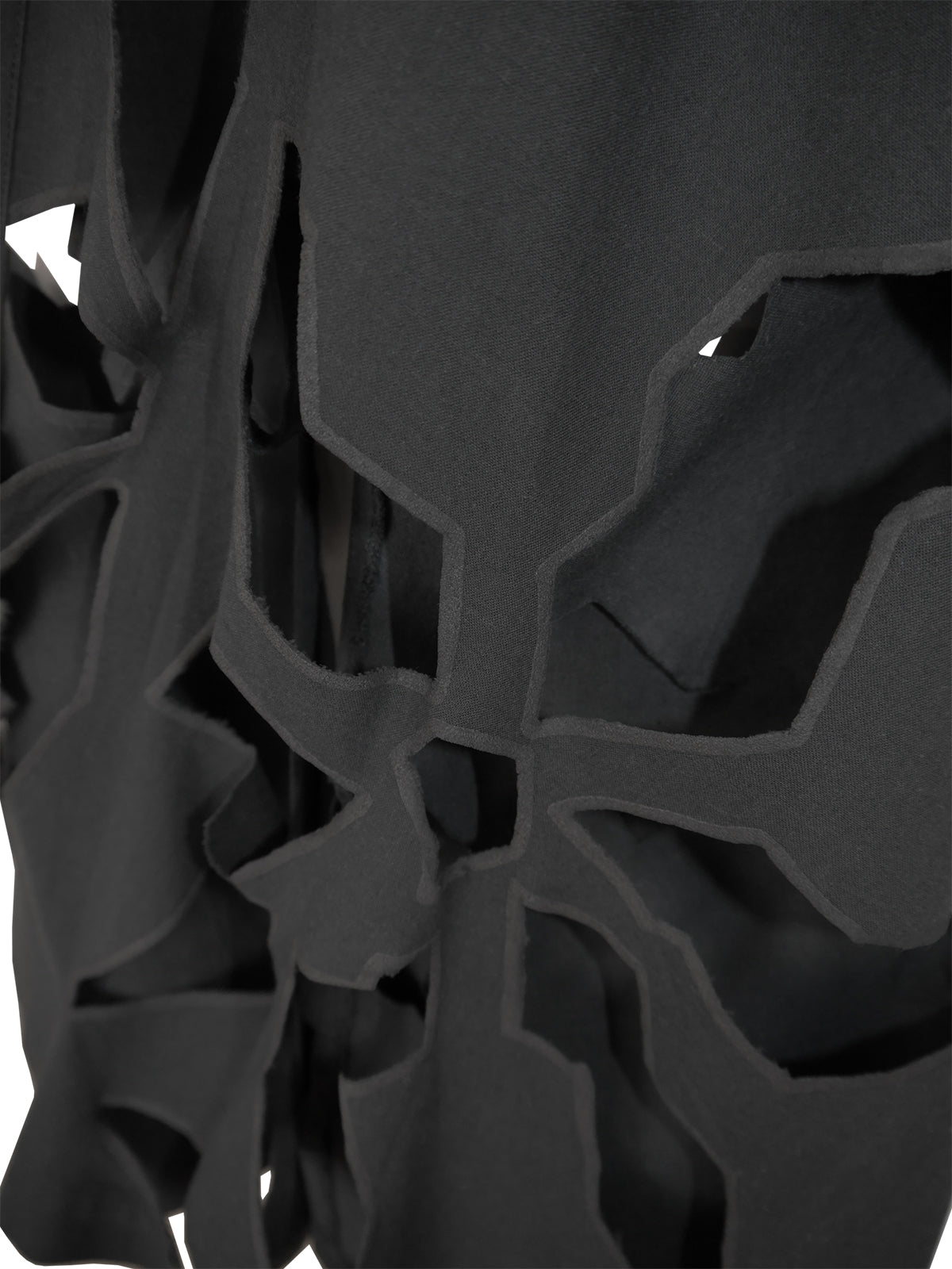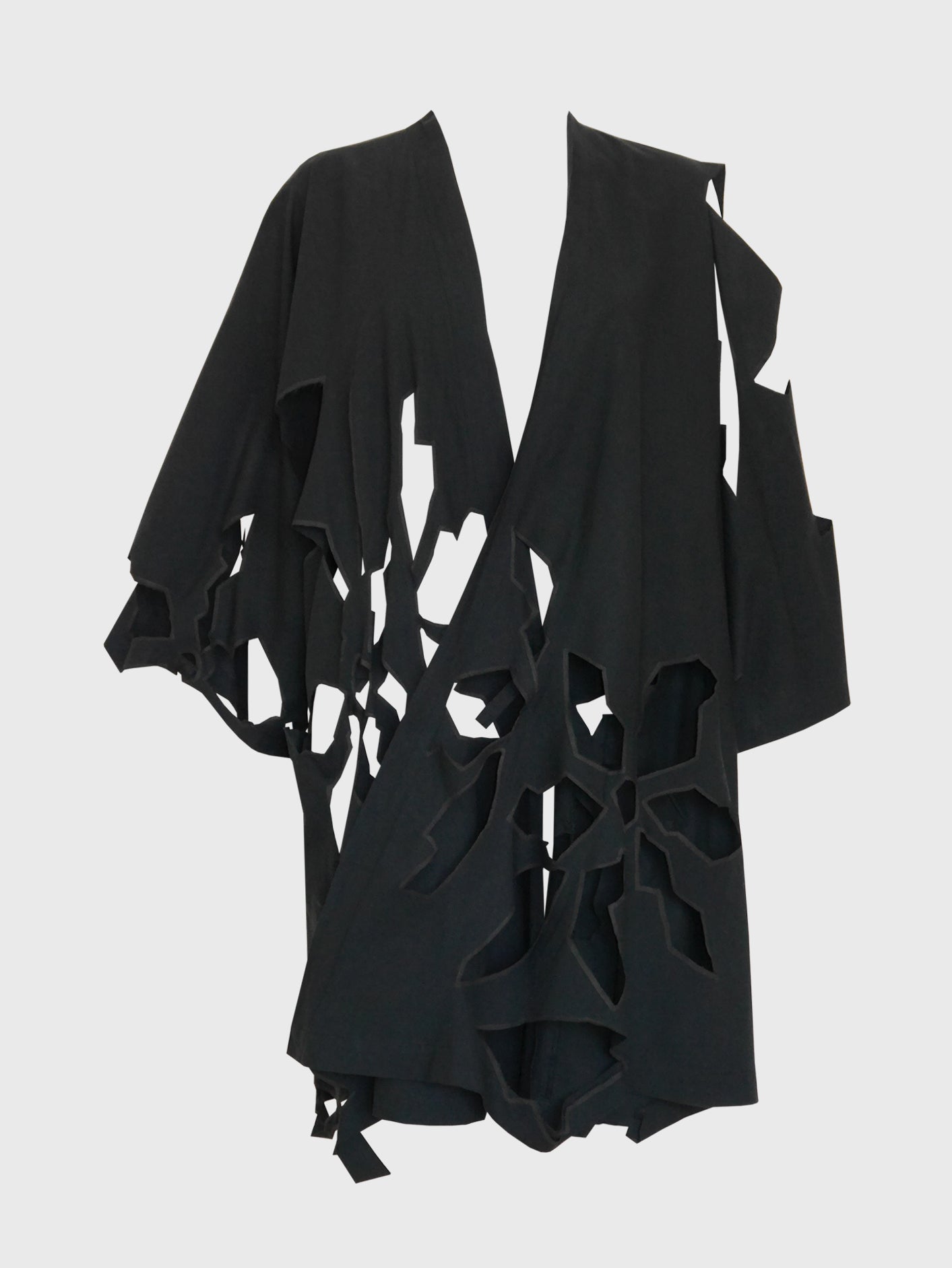 The kimono wraps around the front of the body and ties to close. It is made of black cotton with large cut-outs forming floral motifs with jagged edges. Wide cut, knee-length. 100% cotton, unlined. Made in Japan.