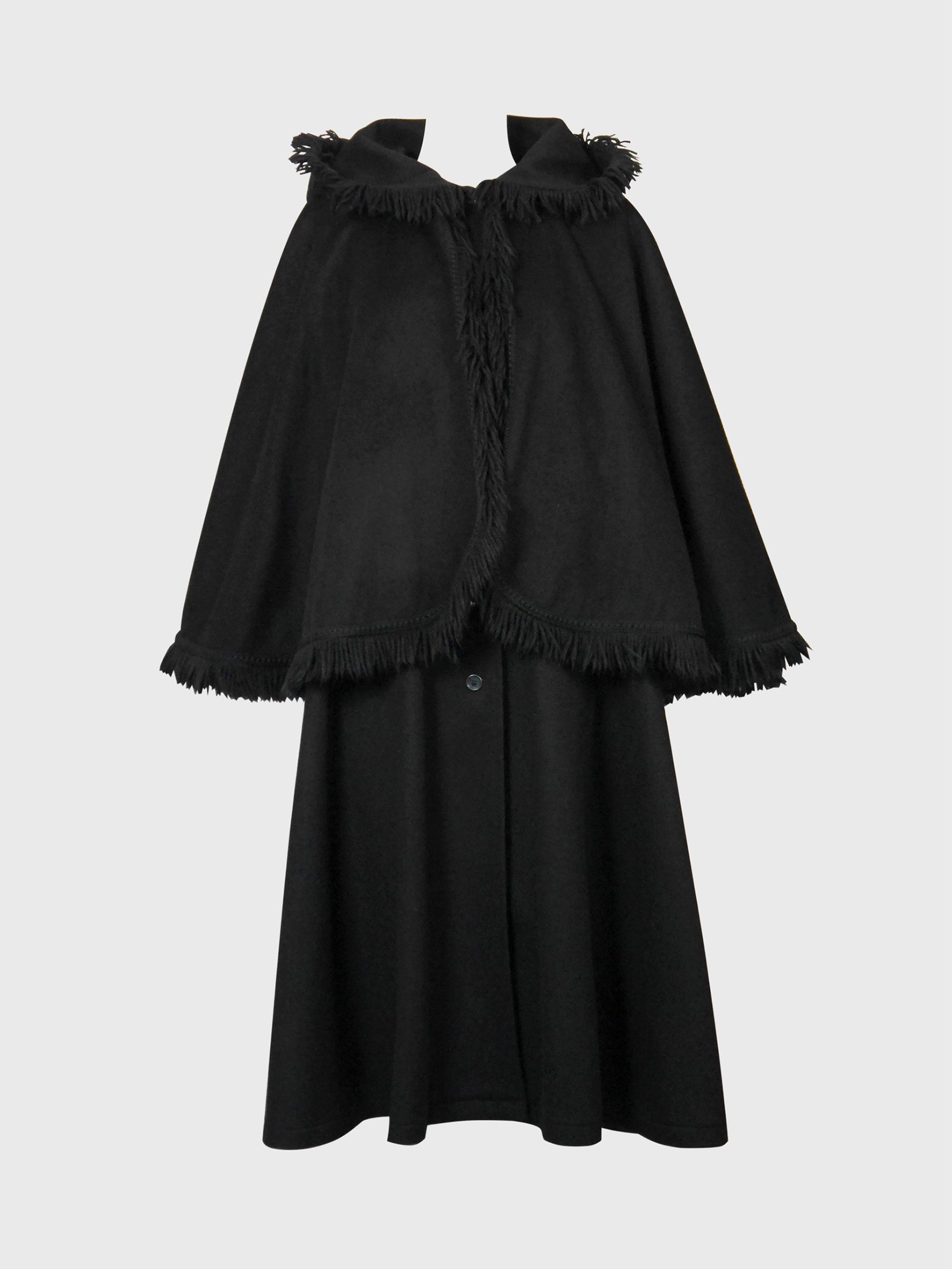 Brace the cold in style with this iconic vintage Yves Saint Laurent hooded cape coat from the late 1970s. Made from a heavy black wool fabric, the coat is ultra warm and has substantial weight. It features a flared calf-length cut with long sleeves, side pockets, a front button closure and an adorable ultra wide swing cape (4 meters hem circumference!) with wool fringes and a large hood. No material tag, probably 100% wool. Made in France.