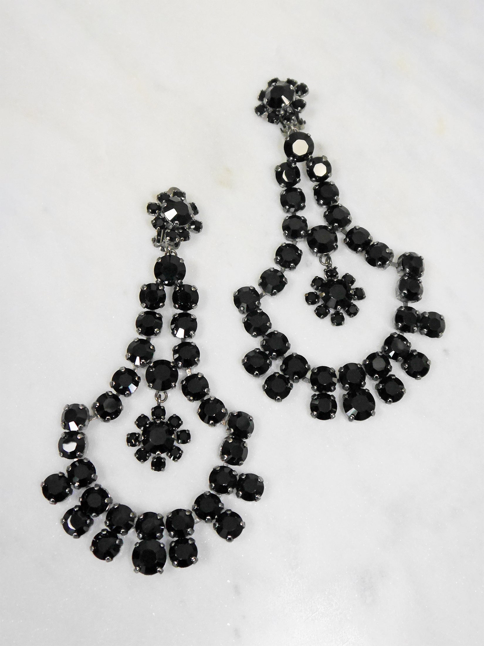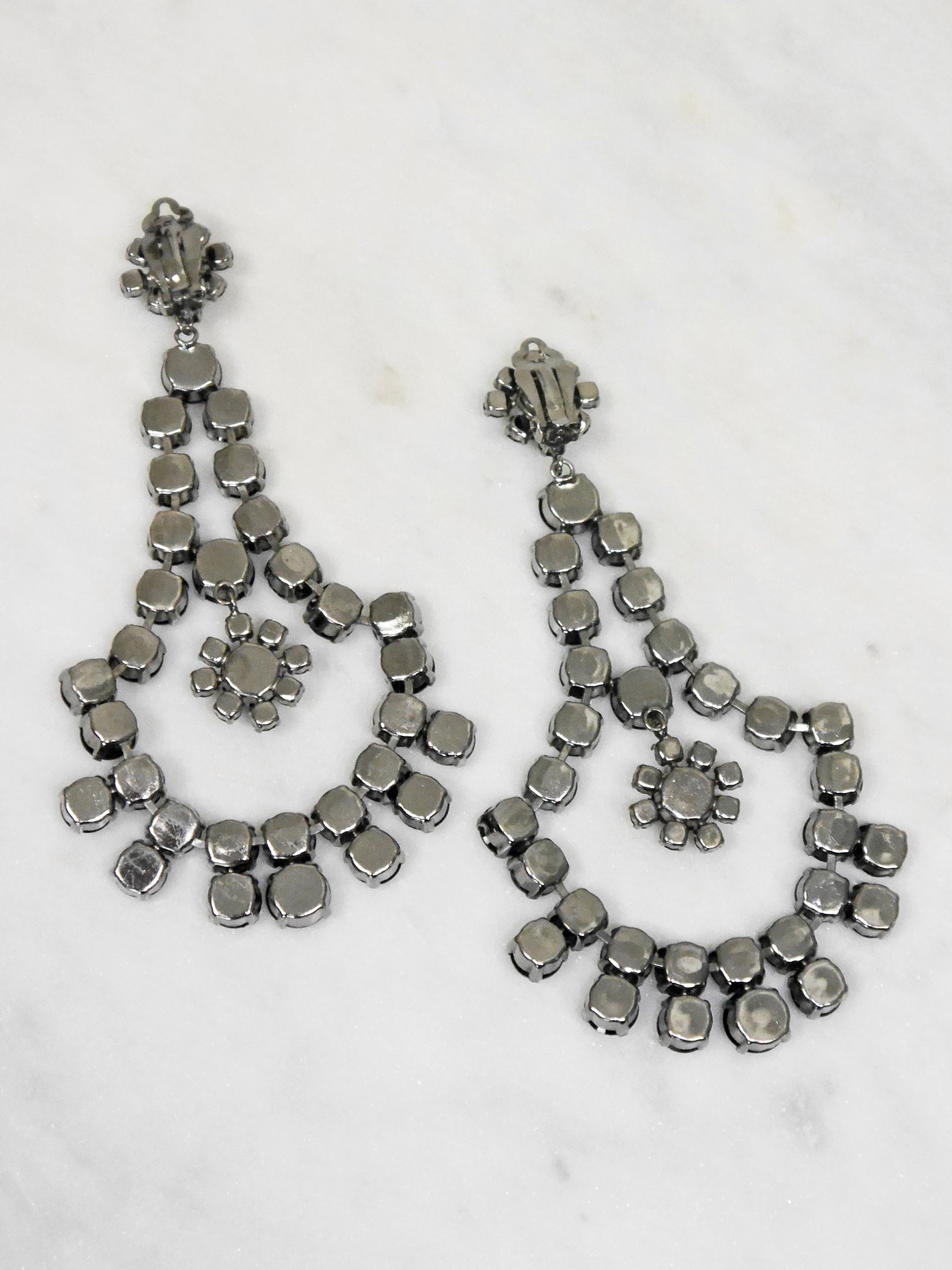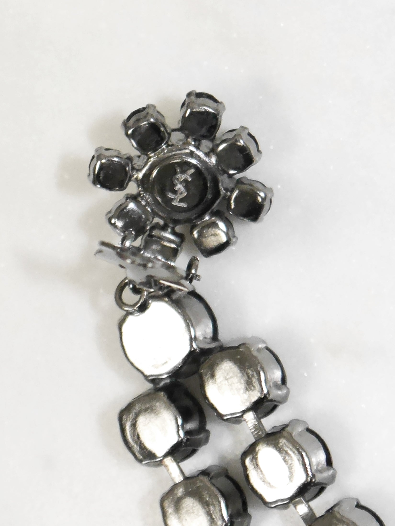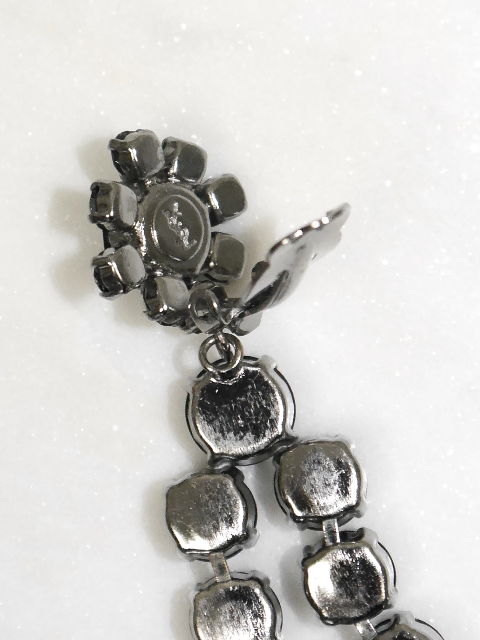 Make a bold statement with these dramatic vintage chandelier clip-on earrings by Yves Saint Laurent Rive Gauche, circa 2000s. They are made of silver-tone metal with prong-set cut glass stones in jet black and feature a spectacular oversized chandelier design. Measuring 12.0 cm/4.72” in length, these striking earrings fall to shoulder level and are an incredible eye-catcher. Clip closure. Signed YSL on reverse.