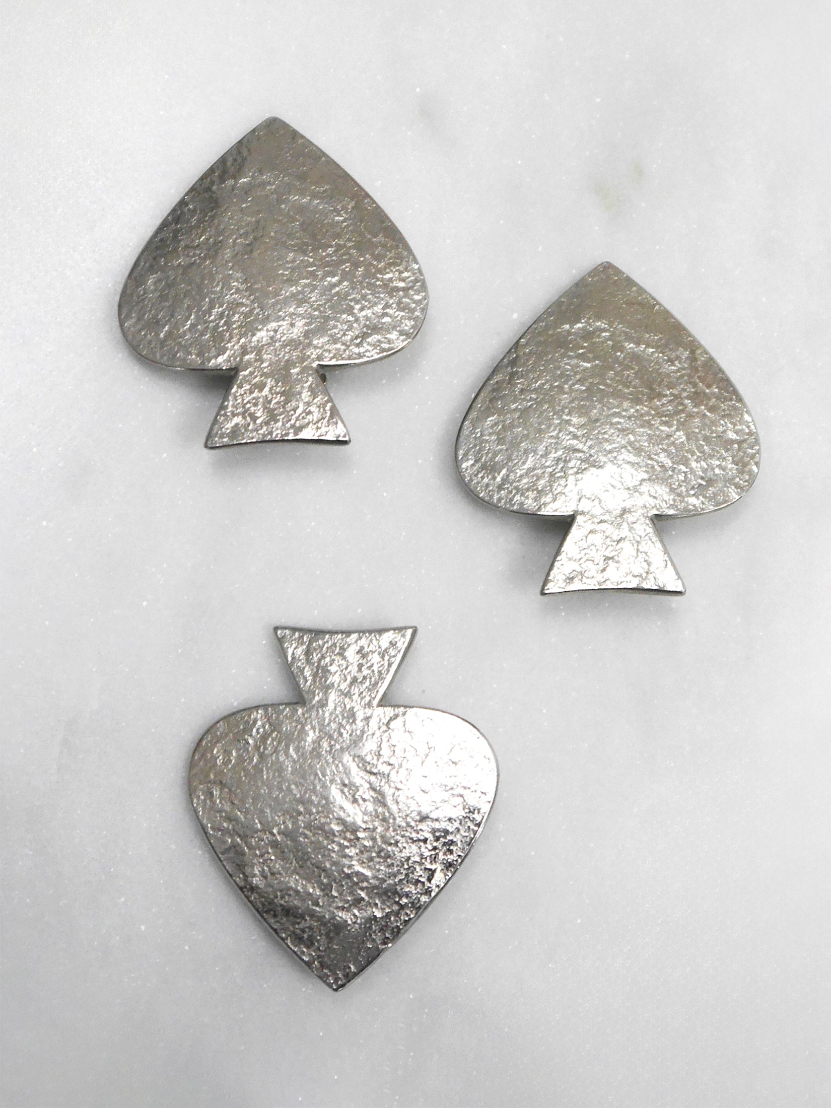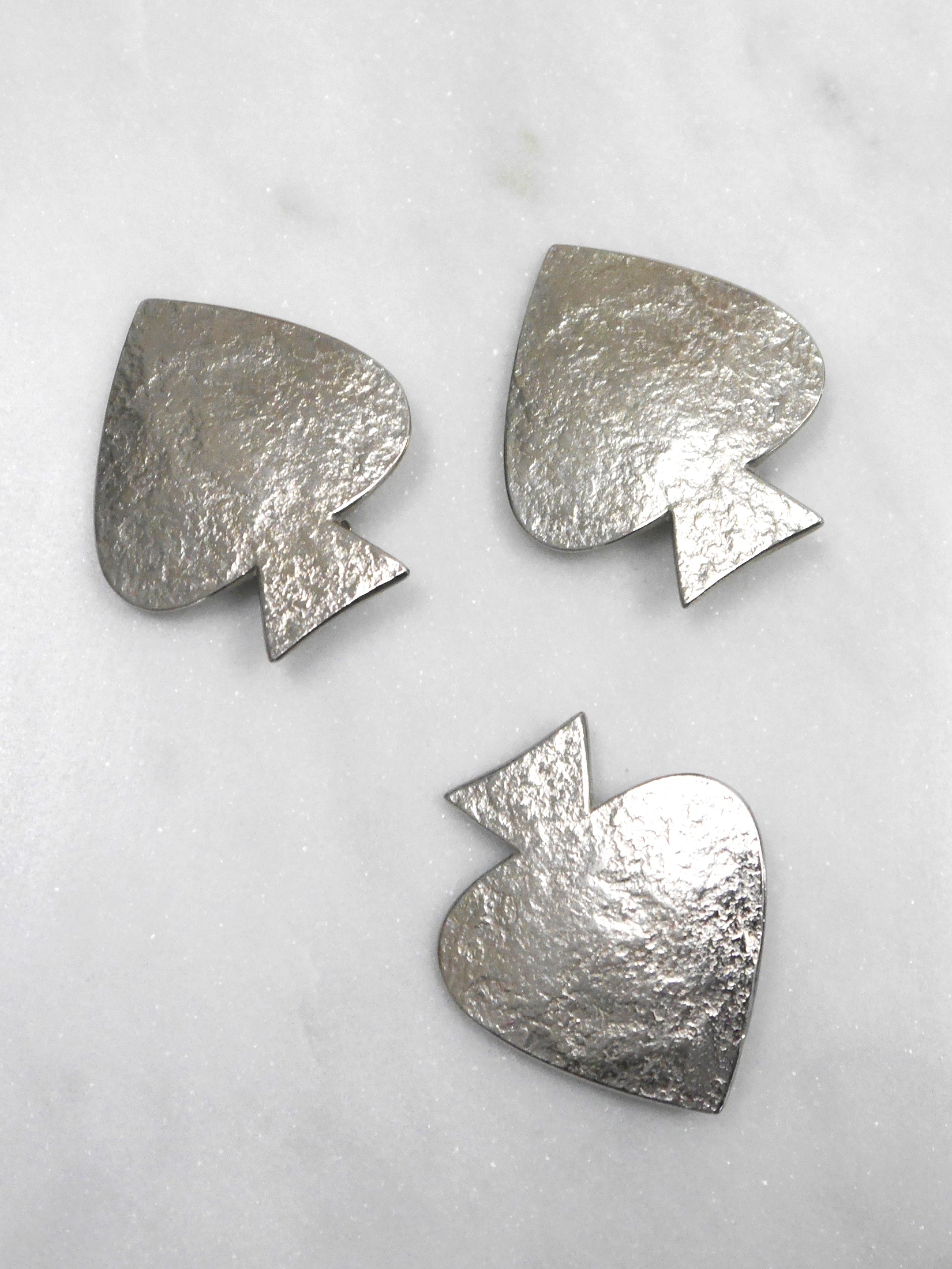 This stunning vintage Yves Saint Laurent jewelry set consists of a spade-shaped brooch and a pair of equally sized earrings, crafted from silver-tone metal with a beautiful texture. These easy-to-wear and versatile pieces will complement any outfit, whether worn individually or as a set. All pieces are signed “YSL Made in France” on reverse.