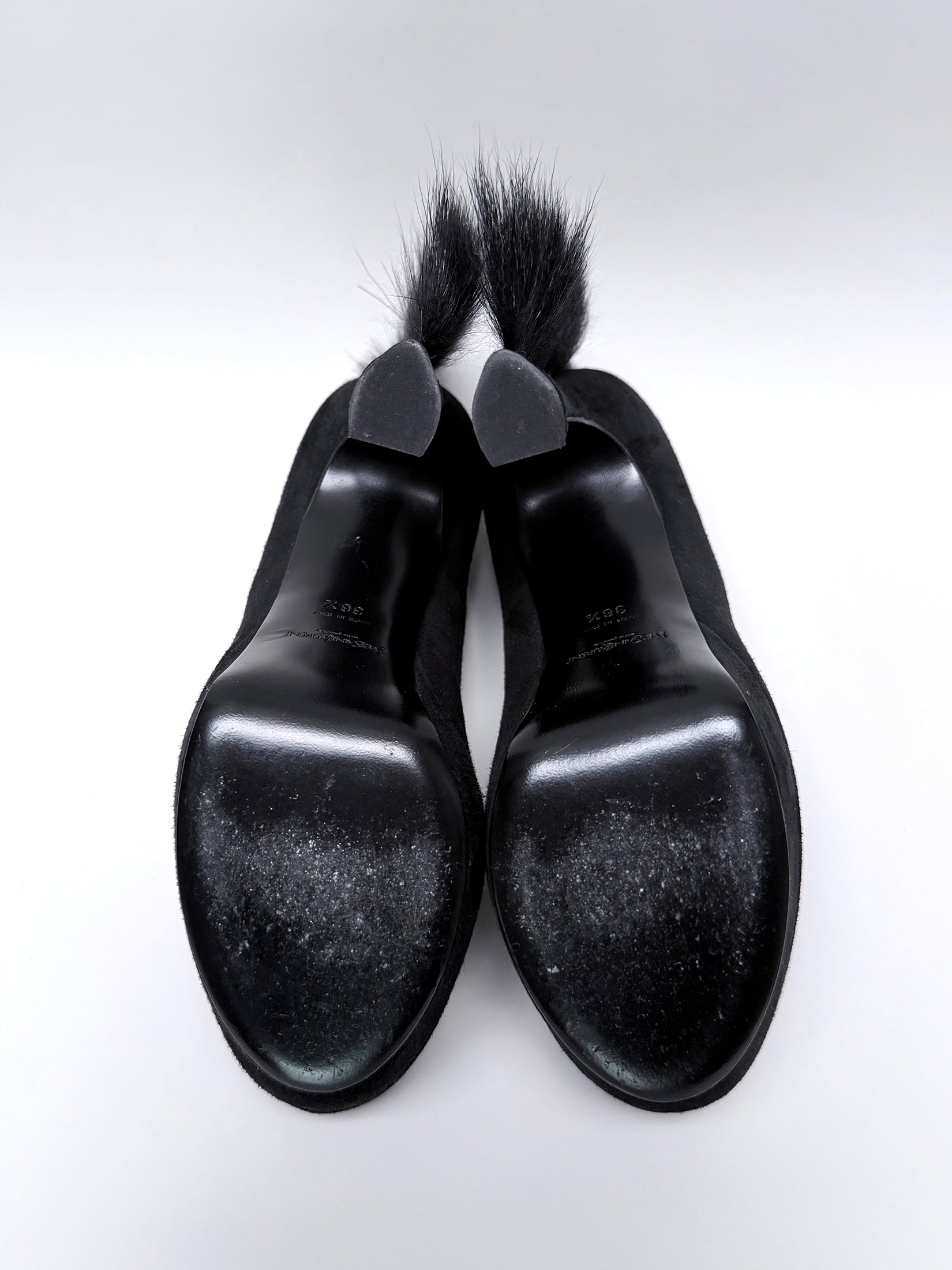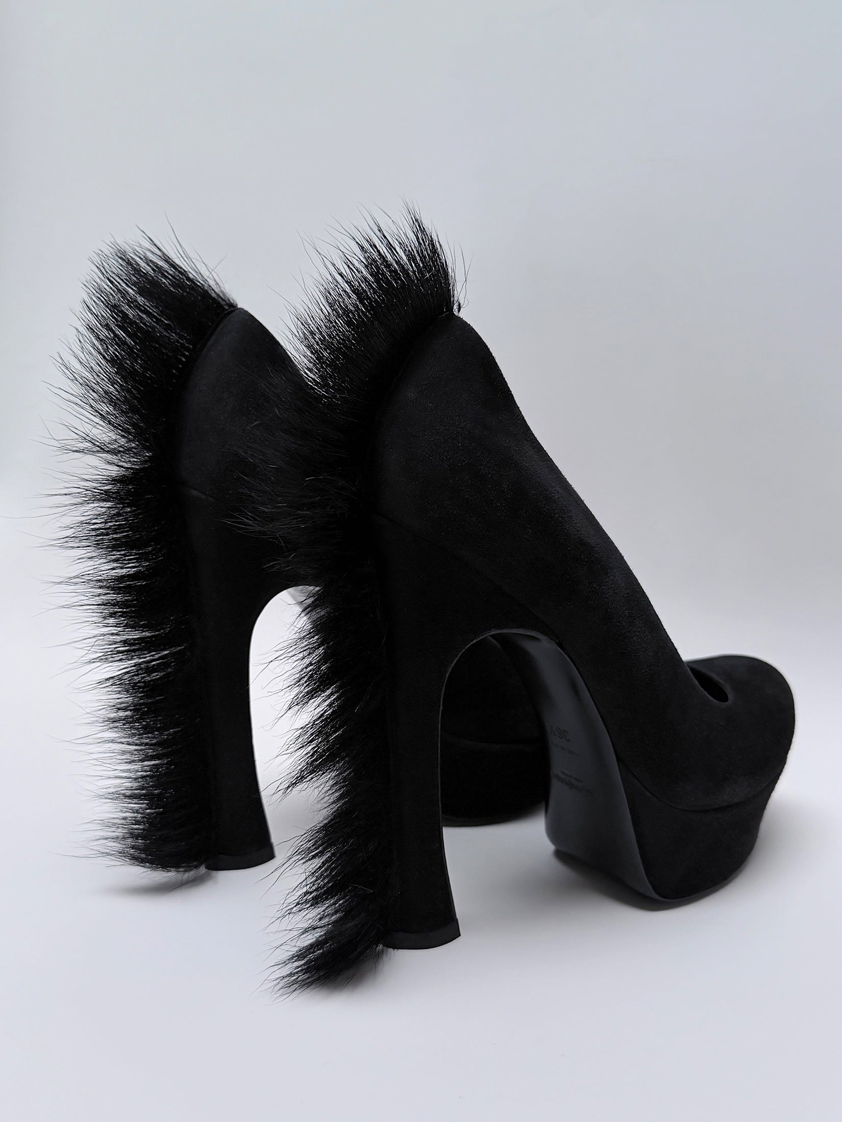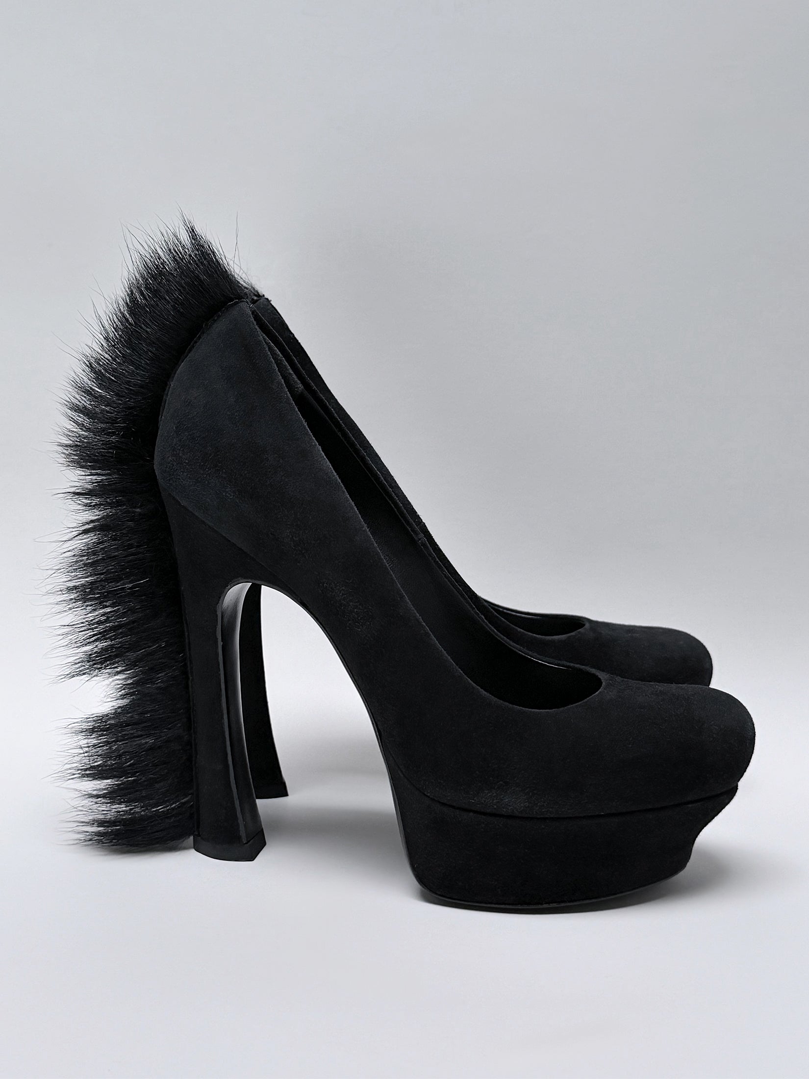 Vintage Yves Saint Laurent "Mohawk" heels from the Fall 2010 collection, designed by Stefano Pilati. Crafted in black suede, these sculptural high heels feature a distinctive strip of black goat hair running from the top to the base of the heel and continuing along the back - an iconic detail that gave the design its name.