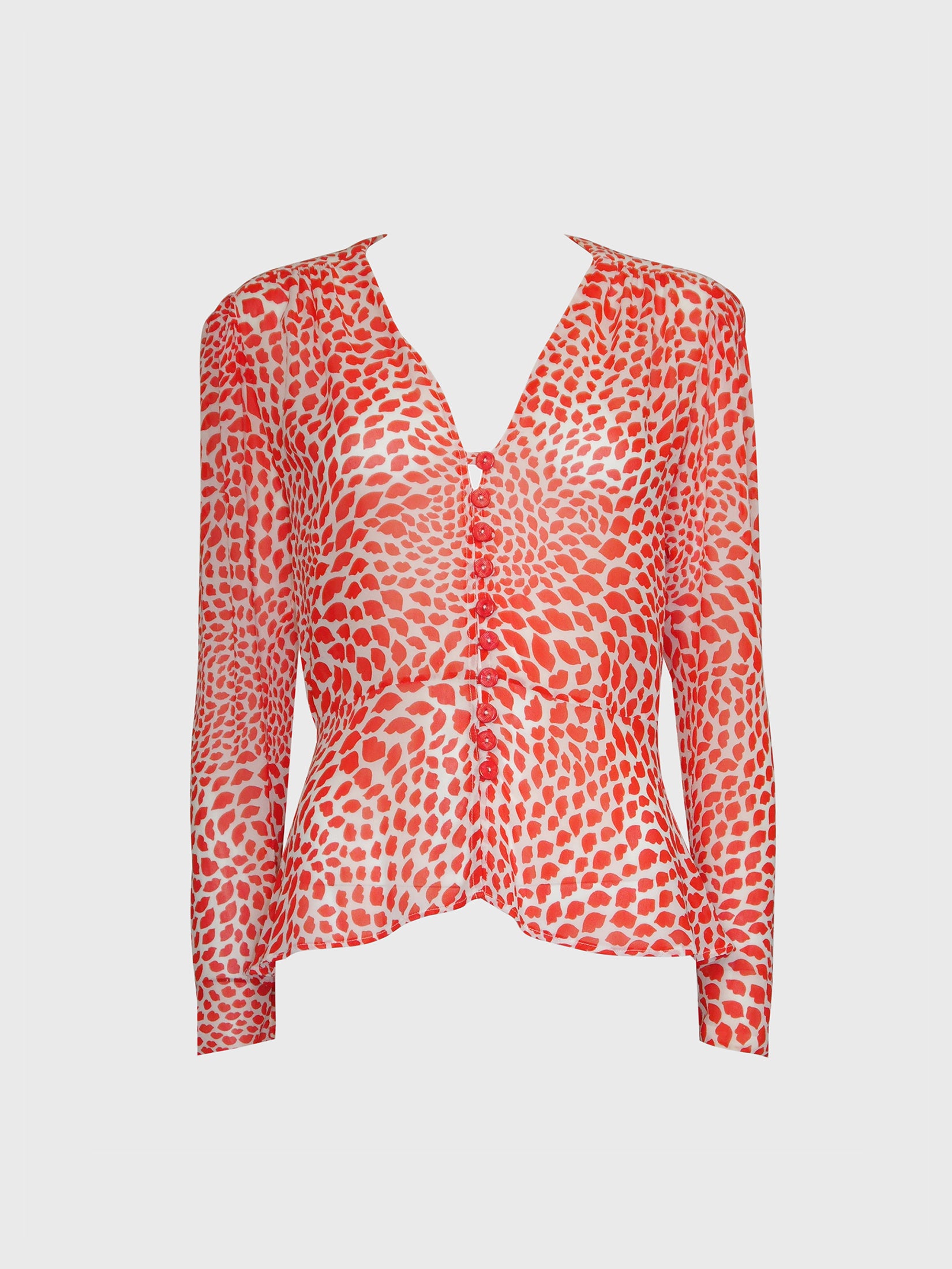 The design includes a plunging V-neckline with a front button closure, using beautiful red buttons. The long sleeves are finished with zippered cuffs, and while there is no material tag, the fabric’s feel and finish suggest silk or rayon. Unlined. Made in France.